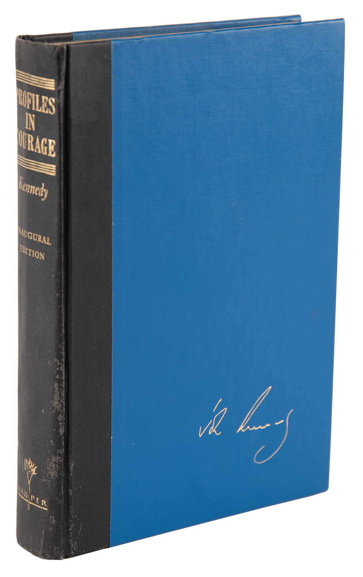 Signed book: Profiles in Courage. First edition. NY: Harper & Brothers, 1961. Hardcover, 6 x 8.5, 266 pages. Signed and inscribed on the first free end page in black ink as president to historian and biographer John Maxwell Taylor, “For John Taylor, with every good wish from his friend – John Kennedy, August 1961.” The front cover bears Kennedy’s facsimile signature. Autographic condition: fine. Book condition: VG/None, with John Maxwell Taylor's personal bookplate affixed to the front pastedown and minor rubbing to the spine.