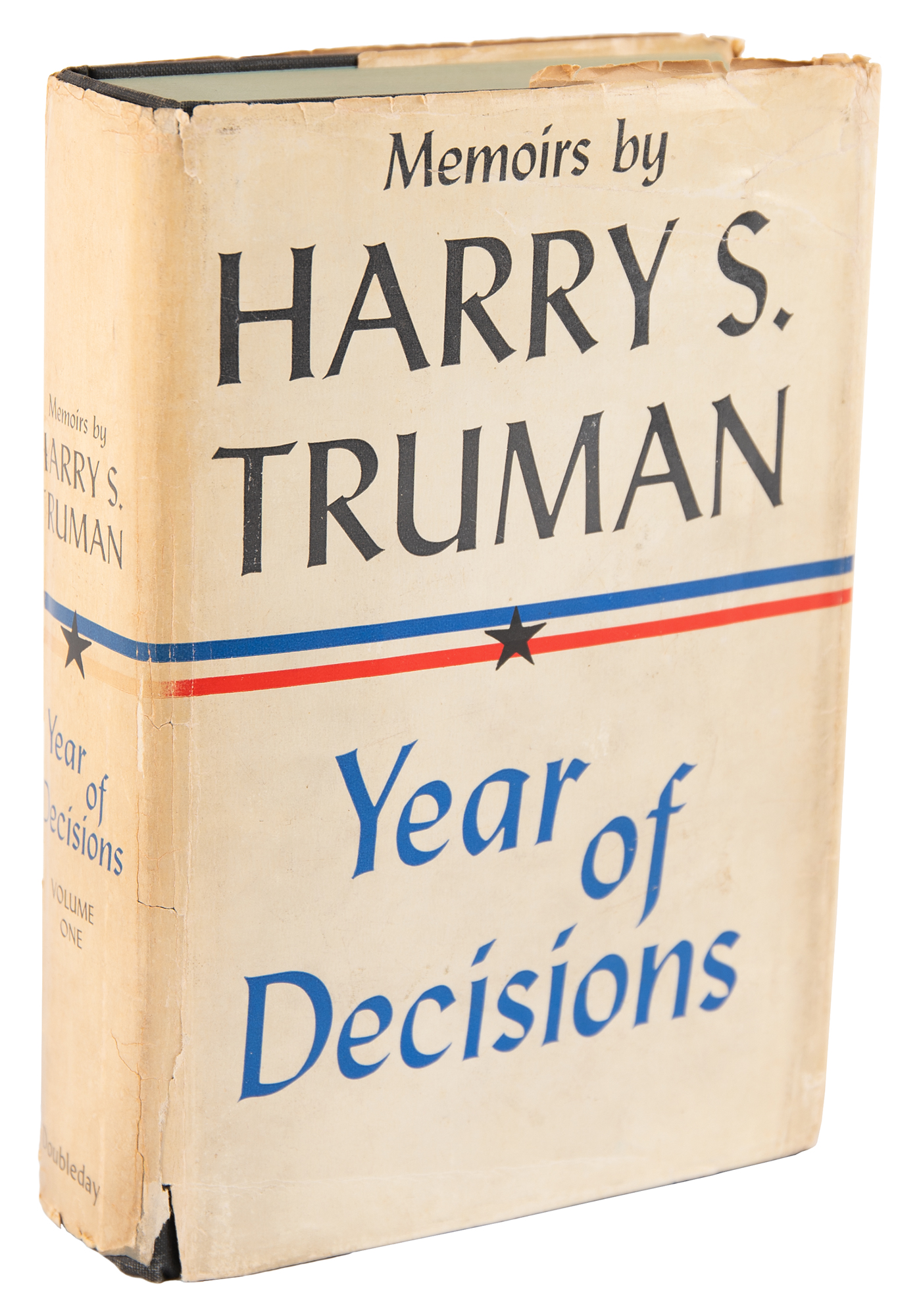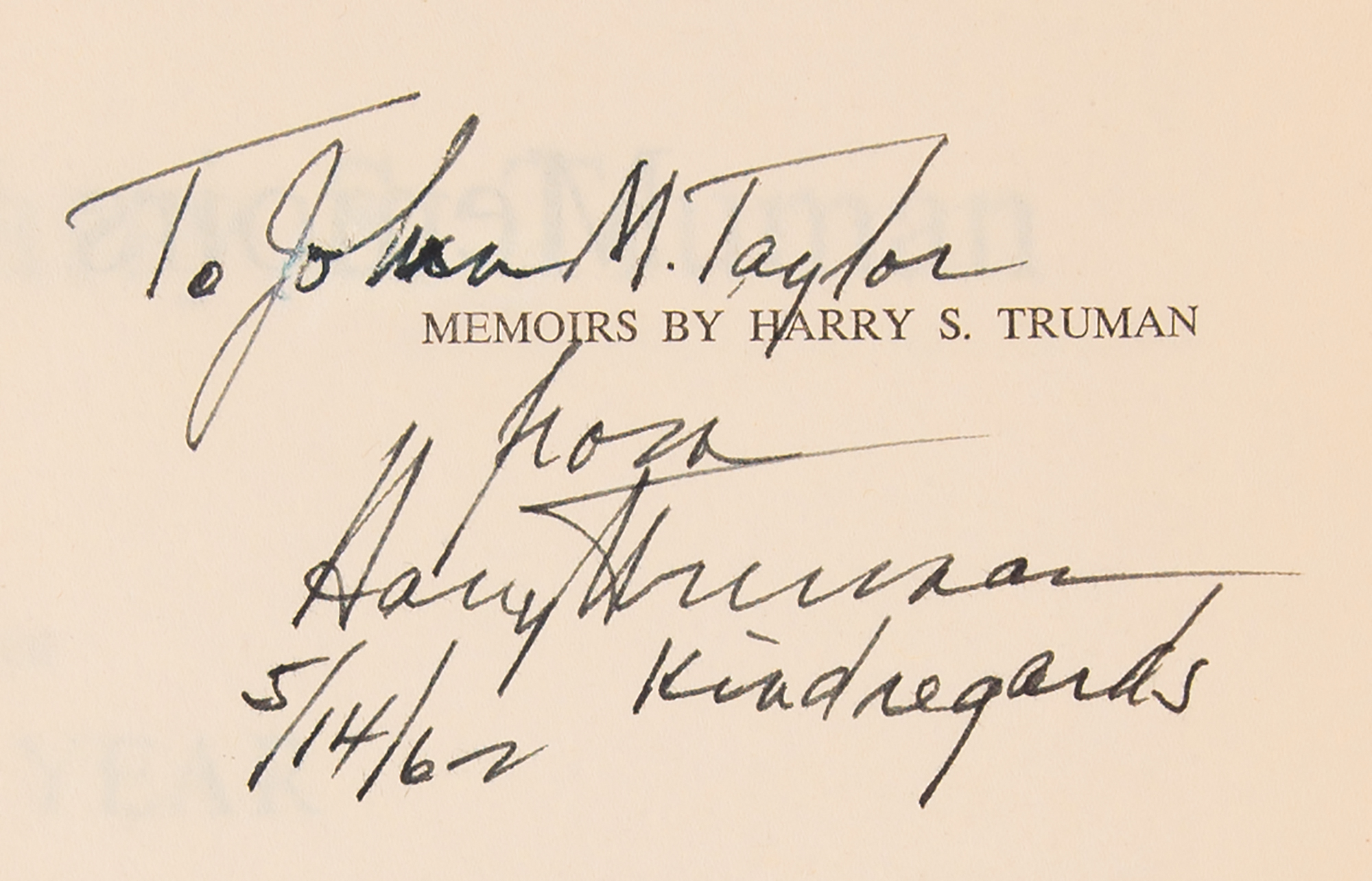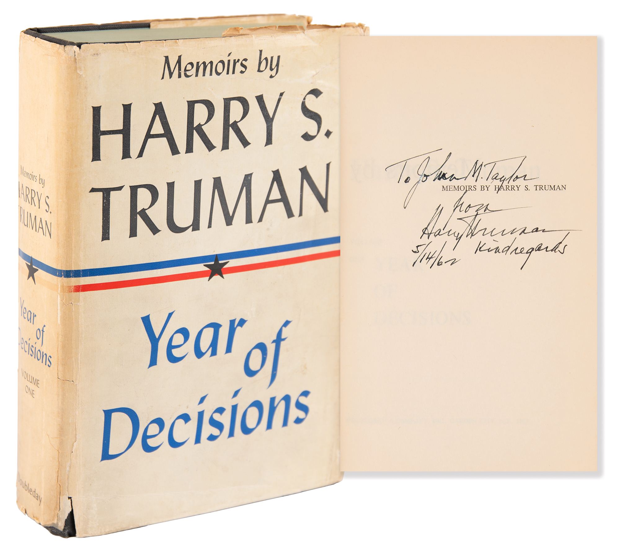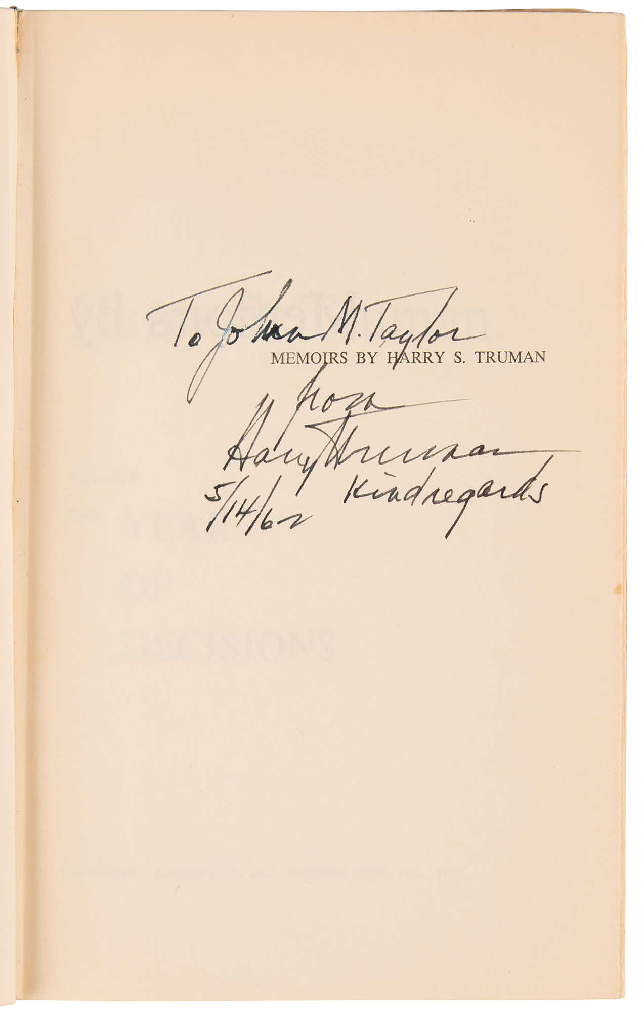 Signed book: Memoirs by Harry S. Truman, Vol. I: Year of Decisions. First edition. Garden City, New York: Doubleday, 1955. Hardcover with dust jacket, 5.75 x 8.5, 596 pages. Signed and inscribed on the half-title page in black ink to historian and biographer John Maxwell Taylor, “To John M. Taylor, from Harry S. Truman, Kind regards, 5/14/62.” Autographic condition: fine. Book condition: VG-/G, with a cracked front hinge, toning to endpapers, John Maxwell Taylor's personal bookplate affixed to the front pastedown, and wear, tears, and sunning to the jacket. Accompanied by an unsigned first edition of the second volume, Memoirs by Harry S. Truman: Years of Trial and Hope, 1946-1952. The recipient, John Maxwell Taylor, is the son of General Maxwell D. Taylor, who served as President John F. Kennedy's primary military advisor as his Chairman of the Joint Chiefs of Staff.
