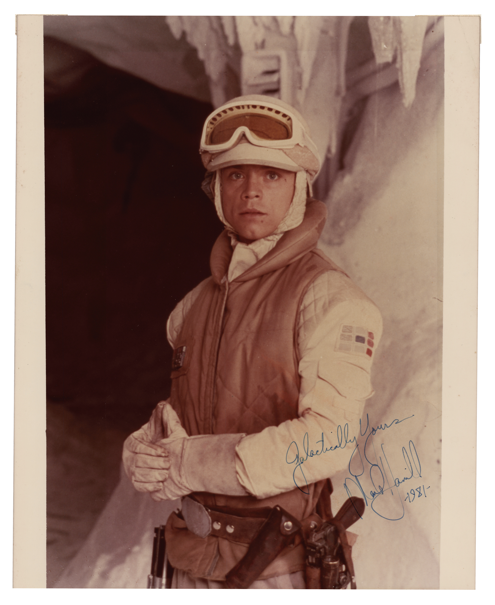 Iconic color vintage satin-finish 8 x 9.75 photo of Mark Hamill as Luke Skywalker in the 1980 Star Wars film The Empire Strikes Back, signed in black felt tip, "Galactically Yours, Mark Hamill, 1981." In fine condition, with a crease to the upper right corner tip and mounting tabs to reverse.