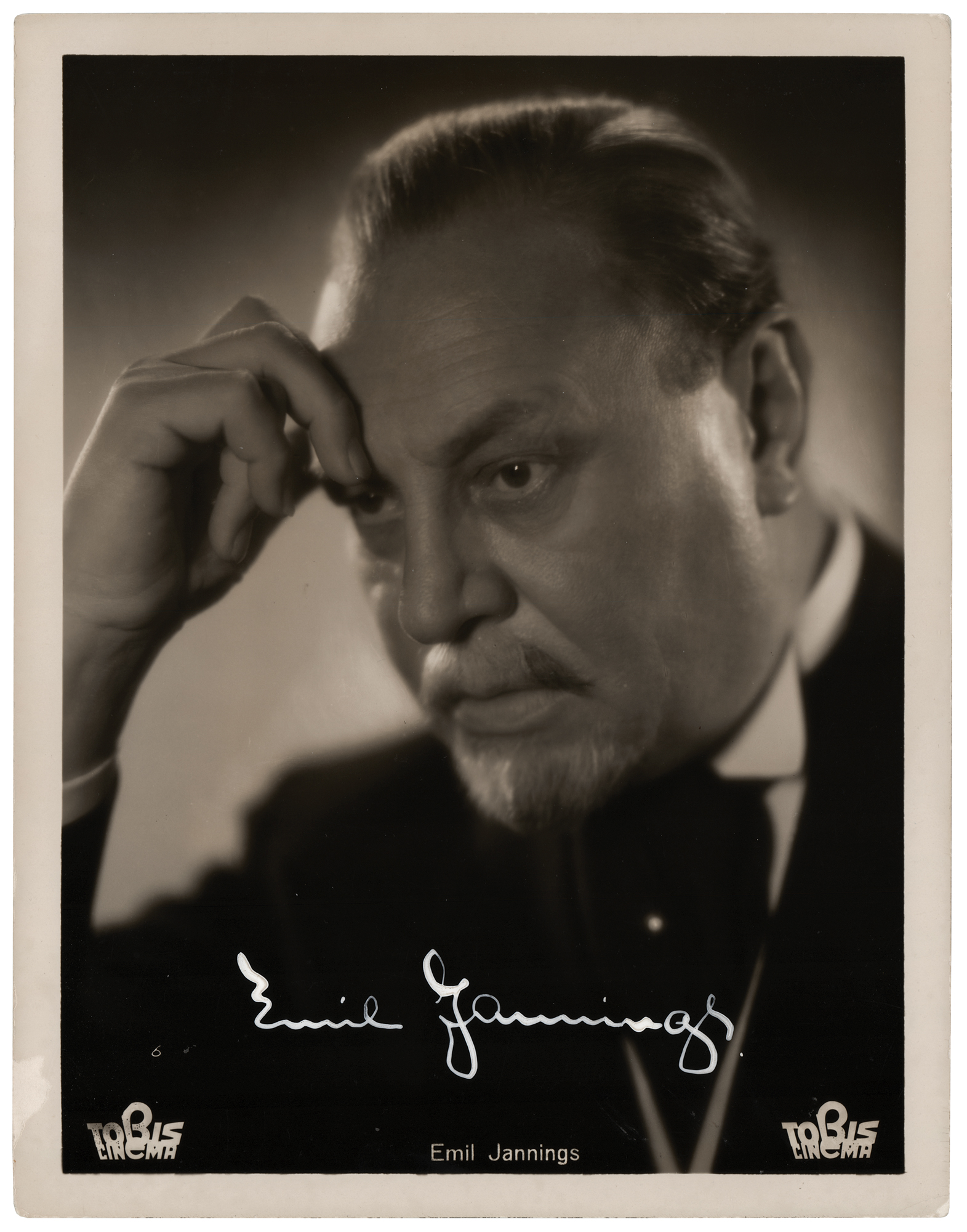 German-Austrian actor (1884–1950) who became the first winner of the Academy Award for Best Actor; he is best known for his collaborations with F. W. Murnau and Josef von Sternberg. Outstanding vintage glossy 9.25 x 11.75 close-up photo of Emil Jannings in a pensive pose, boldly signed in white ink. In fine condition, with minor surface loss to borders.
