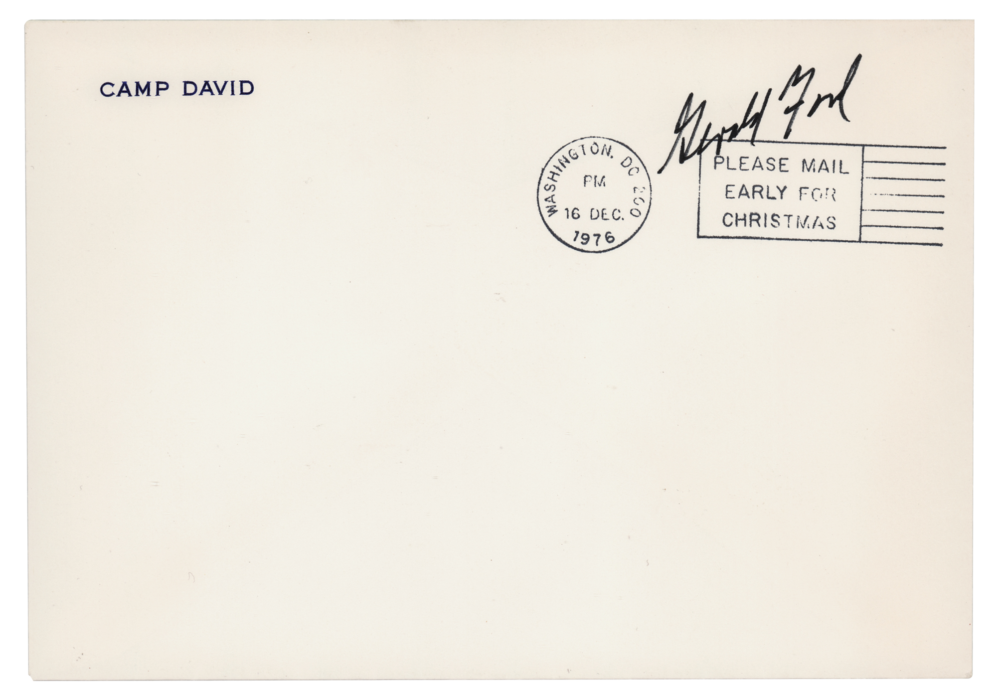 Scarce official Camp David stationery envelope, 7 x 5, free franked in the upper right corner in black felt tip as president, "Gerald Ford." Postmarked at Washington, December 16, 1976. In very fine condition.
