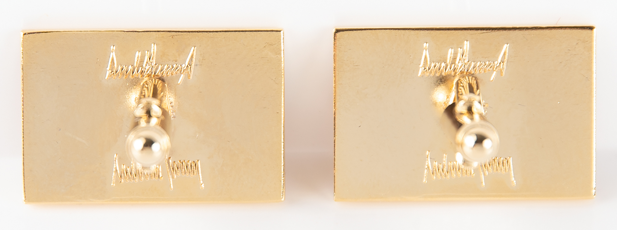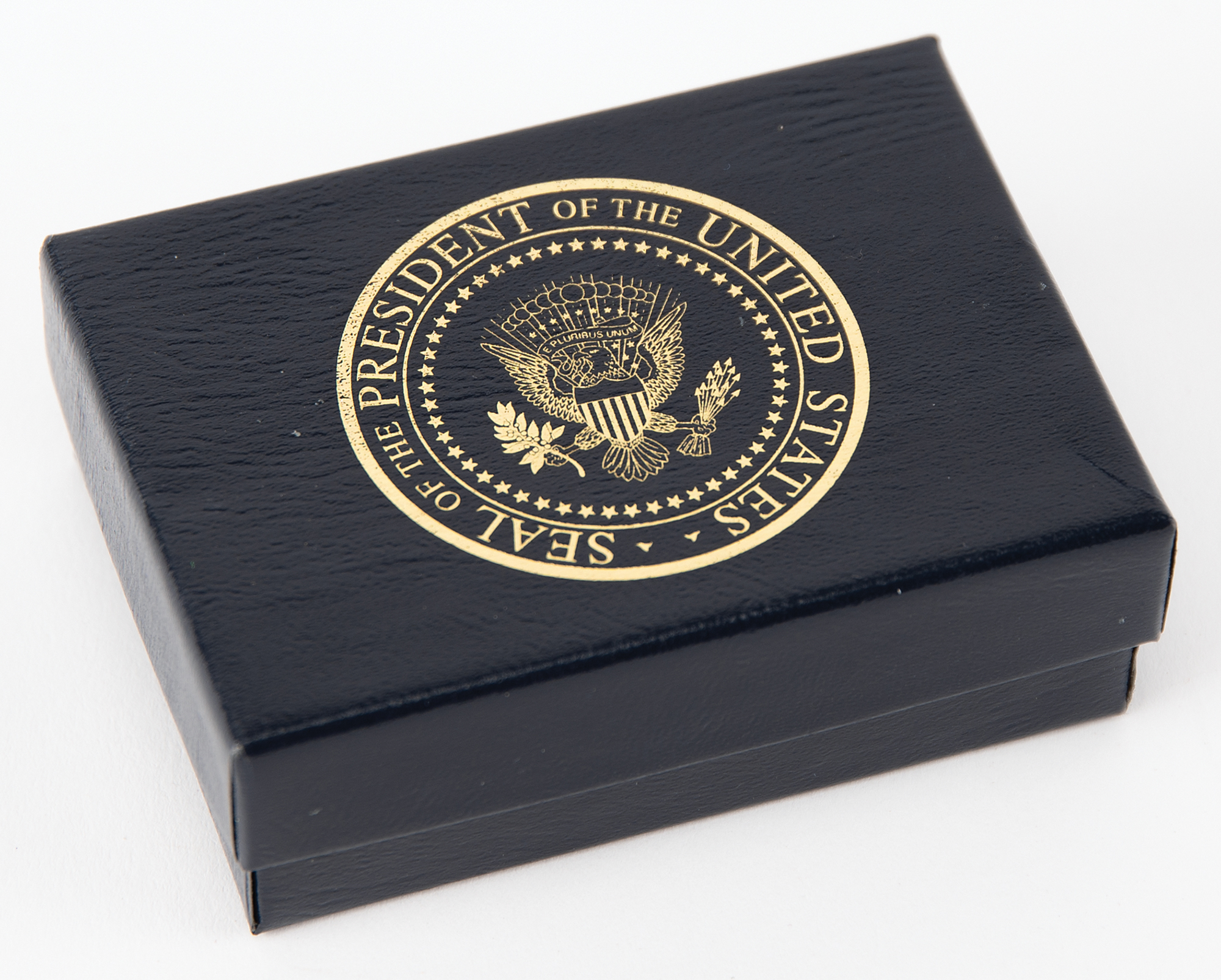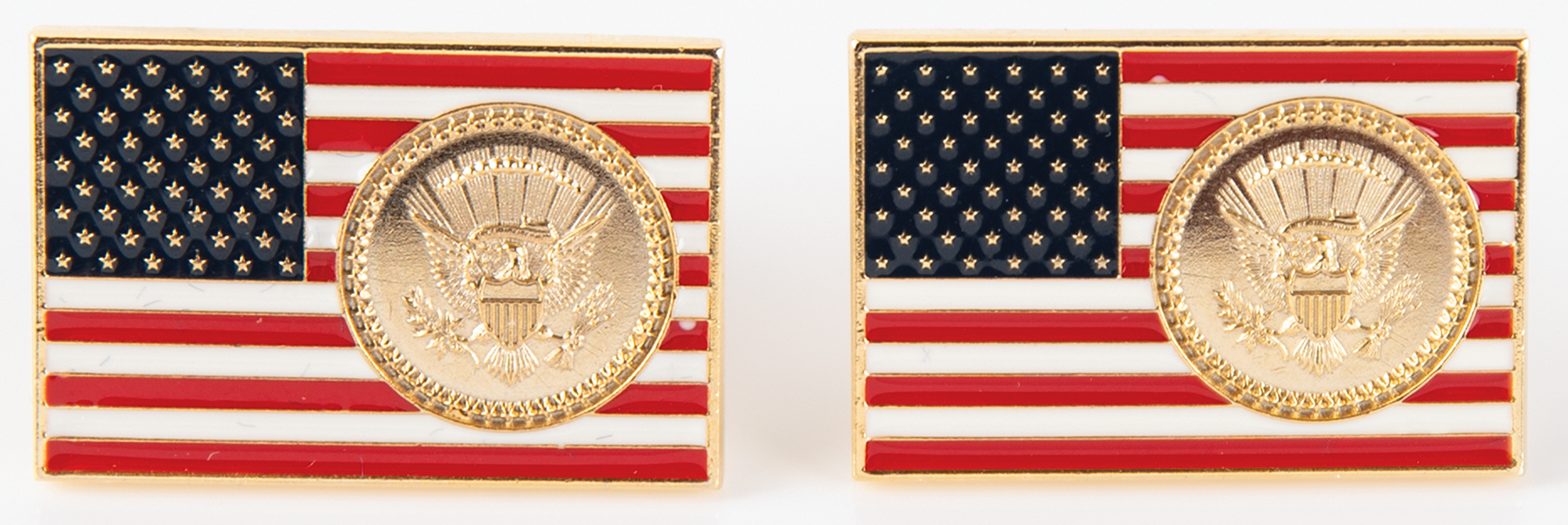White House-exclusive pairing of American flag cufflinks, which were produced in very limited quantities during the presidency of Donald Trump. Both gold-tone cufflinks measure 1˝ x .75˝ and feature a flag design with red-white-and-blue enamel and a presidential seal to the field. The reverse of each bears the engraved facsimile signatures of Donald and Melania Trump. Includes the original presentation box, the lid of which bears a golden presidential seal. In very fine condition. These cufflinks were exclusively made for and presented to foreign dignitaries and other VIPs during the Trump-Pence administration.