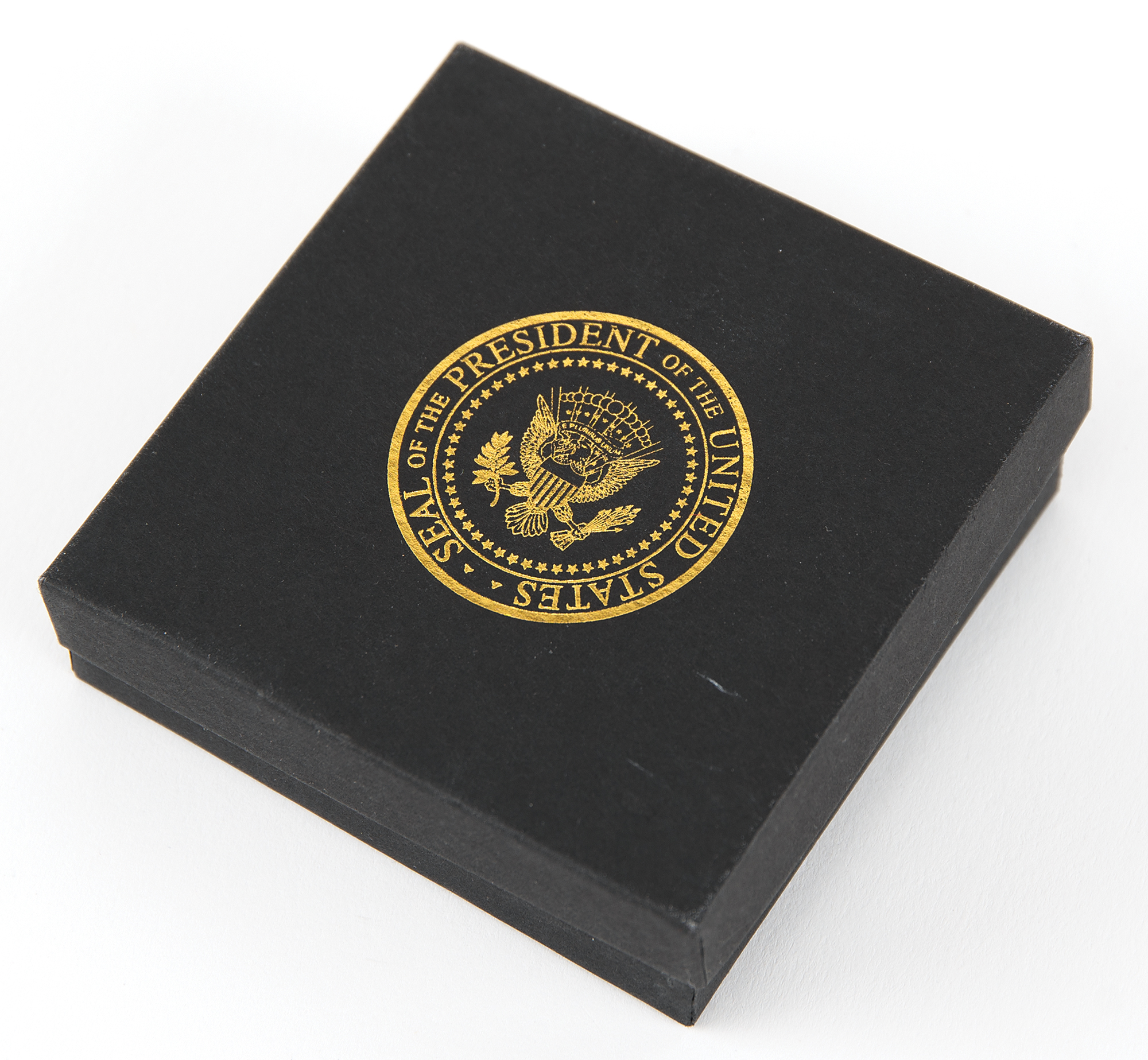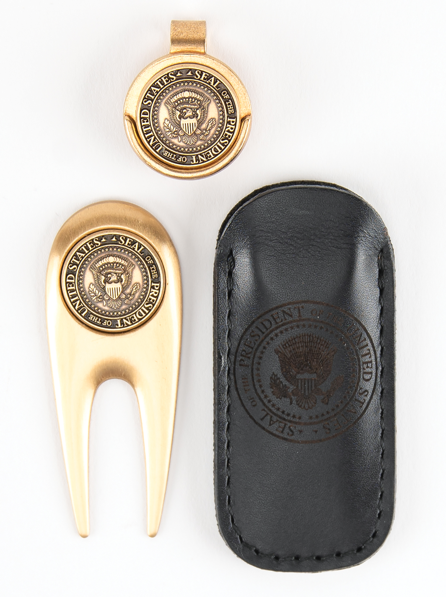 White House-exclusive golfing set consisting of a ball marker and divot tool, which were produced in very limited quantities during the presidency of Donald Trump. The gold-tone ball marker, .75˝ in diameter, features an embossed design of the presidential seal and is accompanied by a magnetized storage clip; and the solid brass IMC divot tool, 2.5˝ in length, bears a magnetized head that holds a second presidential seal ball marker. The divot tool includes a small black leather storage sleeve with an engraved presidential seal. The marker and divot are accompanied by their original presentation box, the lid of which bears a golden presidential seal. In overall very fine condition. This golfing set was exclusively made for and presented to foreign dignitaries and other VIPs during the Trump-Pence administration.