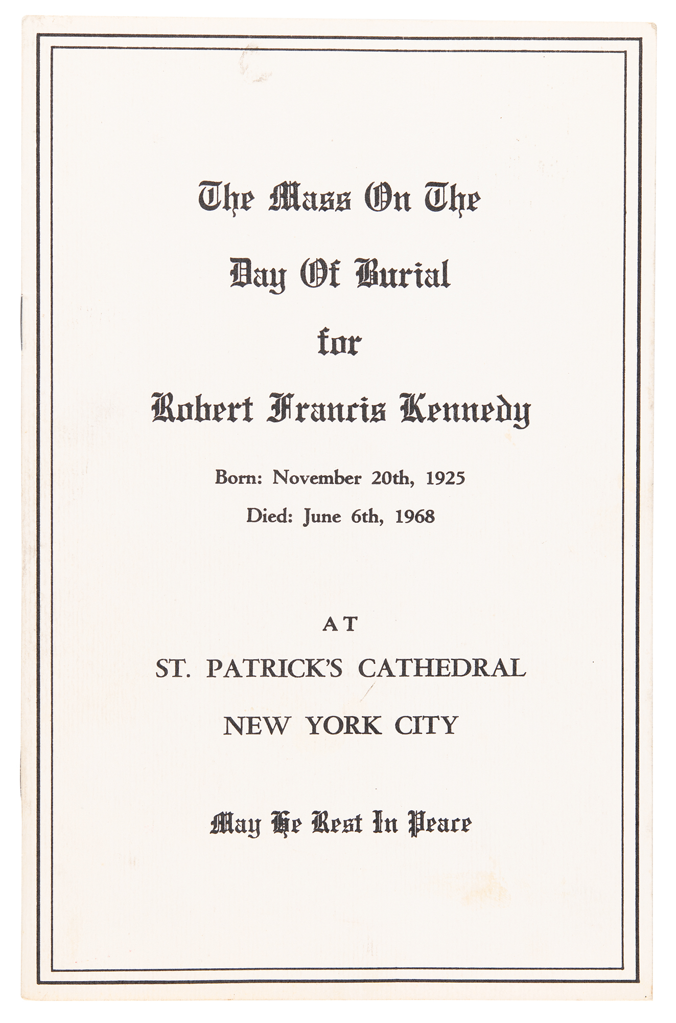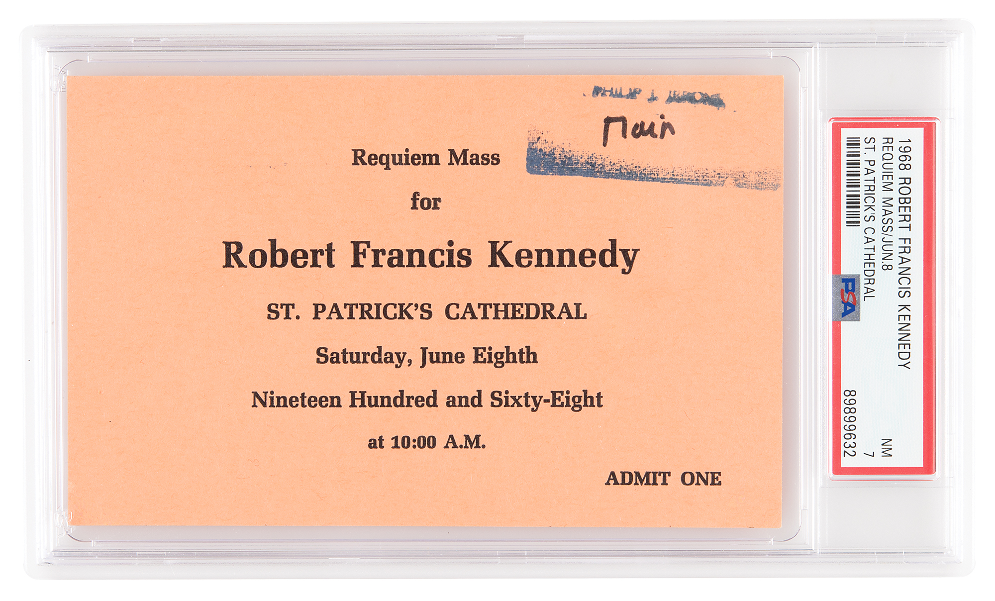 Two items related to the funeral of Robert F. Kennedy: an original 5.5 x 3.5 admission pass for the “Requiem Mass for Robert Francis Kennedy,” held at St. Patrick’s Cathedral on June 8, 1968, which is marked in black felt tip in the upper right, “Main”; and an original funeral program headed “The Mass on the Day of Burial for Robert Francis Kennedy,” eight pages, 5.5 x 8.5, held at St. Patrick’s Cathedral. In overall fine condition, with a few light stains to the program. The pass is encapsulated and graded by PSA/DNA as "NM 7."