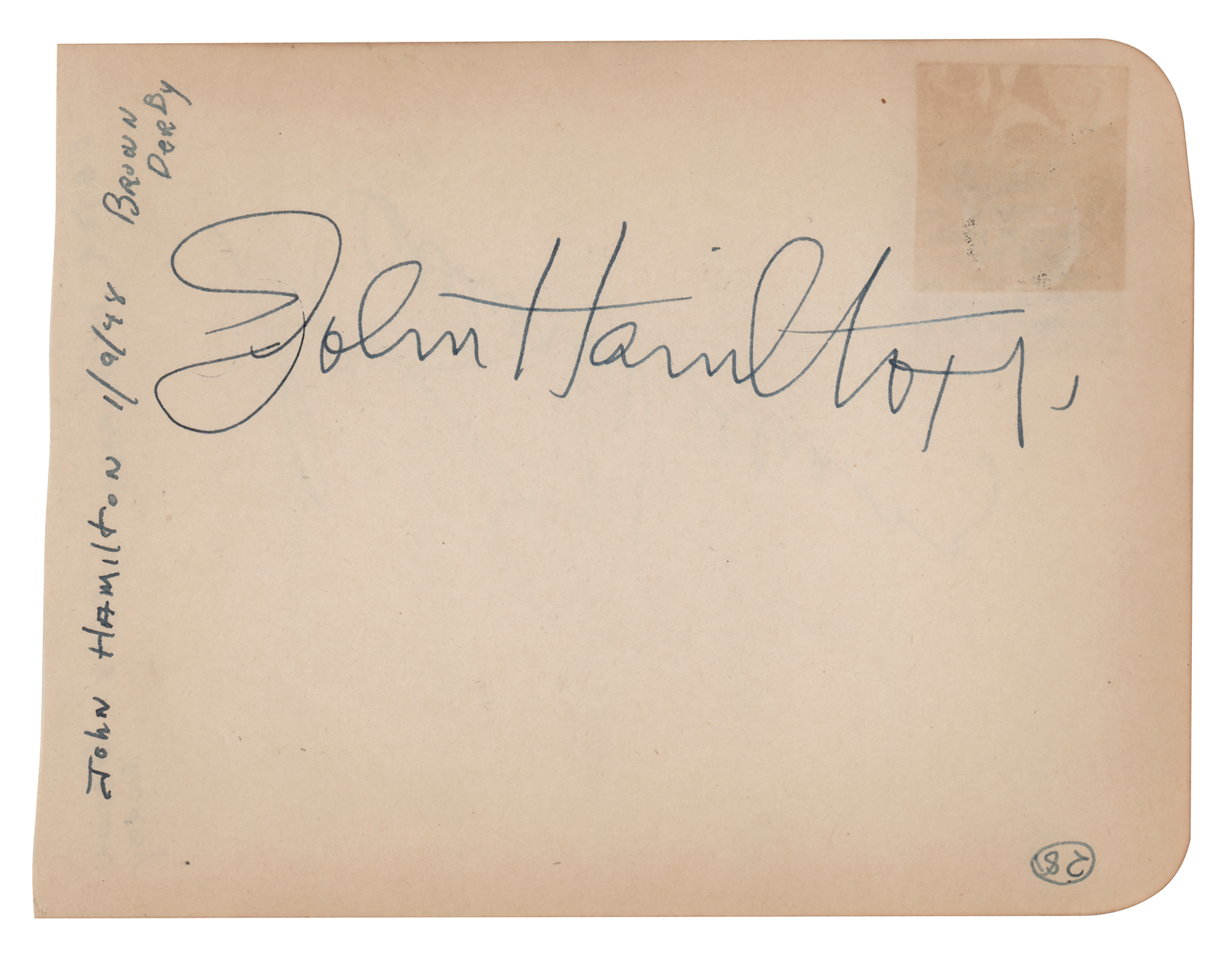 Character actor (1887-1958) best known as Daily Planet editor Perry White on the 1950s television series Adventures of Superman. Rare vintage ink signature, "John Hamilton,” on an off-white 5.75 x 4.25 album page, which bears collector's notations dating the autograph to the Brown Derby on January 9, 1948. In fine condition, with a small block of toning to the upper right corner.