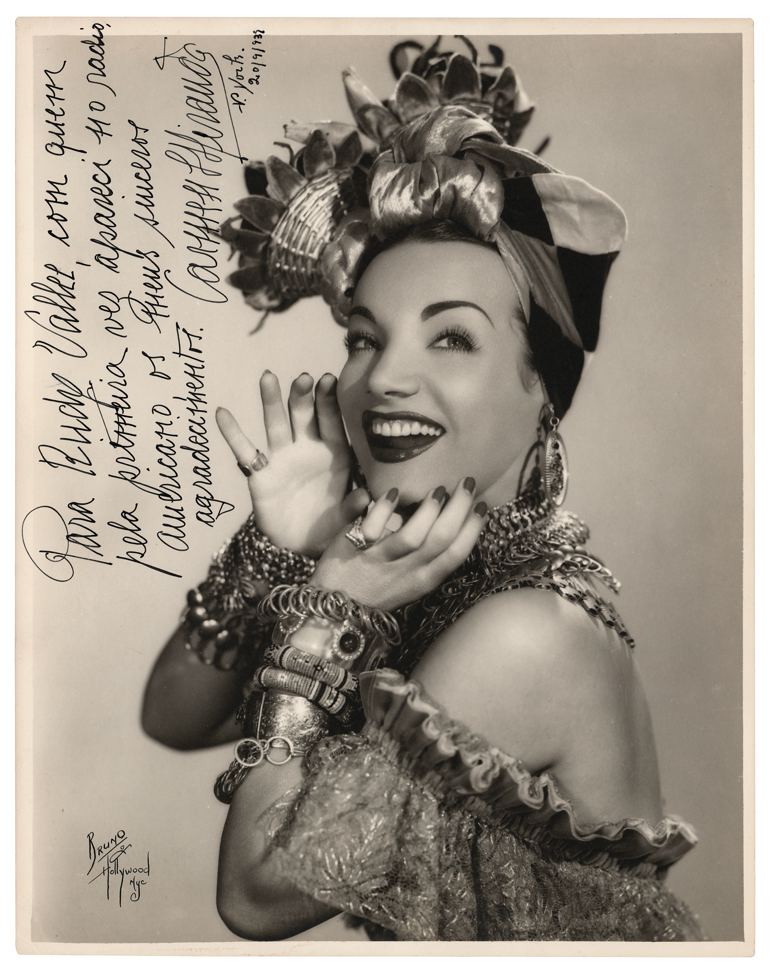 Large vintage matte-finish 11 x 14 portrait photo of the 'Brazilian Bombshell' by Bruno of Hollywood, signed and inscribed vertically in Portuguese in bold fountain pen (translated), “To Rudy Vallee, with whom I appear for the first time on American radio, my sincere thanks, Carmen Miranda, N. York, 20 / 9 / 937.” In very fine condition, with two small creases to the lower left corner tip. Rudy Vallée was an American singer, saxophonist, bandleader, actor, and entertainer (1901-1986) who was the first male singer to rise from local radio broadcasts in New York City to national popularity as a ‘crooner.’