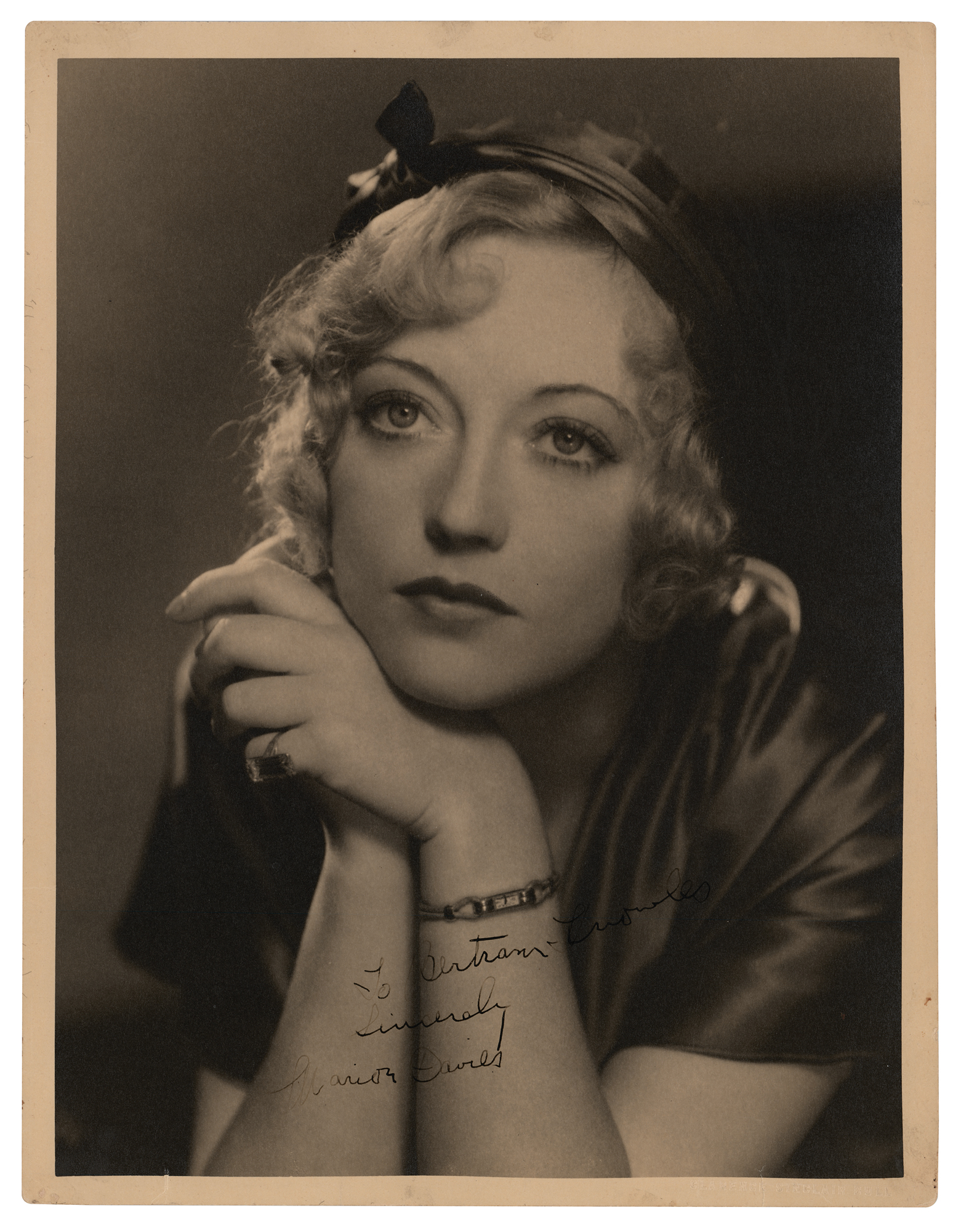 Beautiful vintage matte-finish 10 x 13 portrait photo of the popular leading lady by Clarence Sinclair Bull, signed and inscribed in fountain pen, “To Bertram…Sincerely, Marion Davis.” The reverse bears an MGM photo credit stamp for Bull, numbered “B2436.” In fine condition, with reduced ink flow to the first letter of the signature.