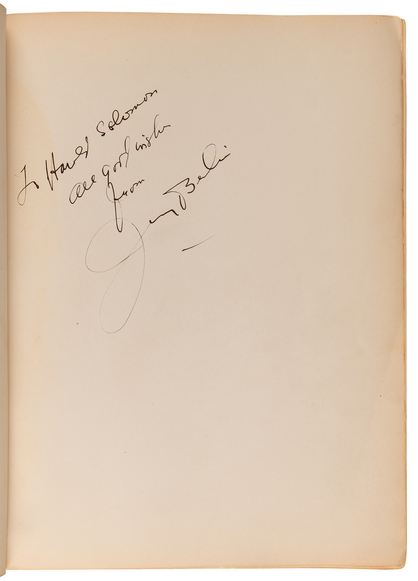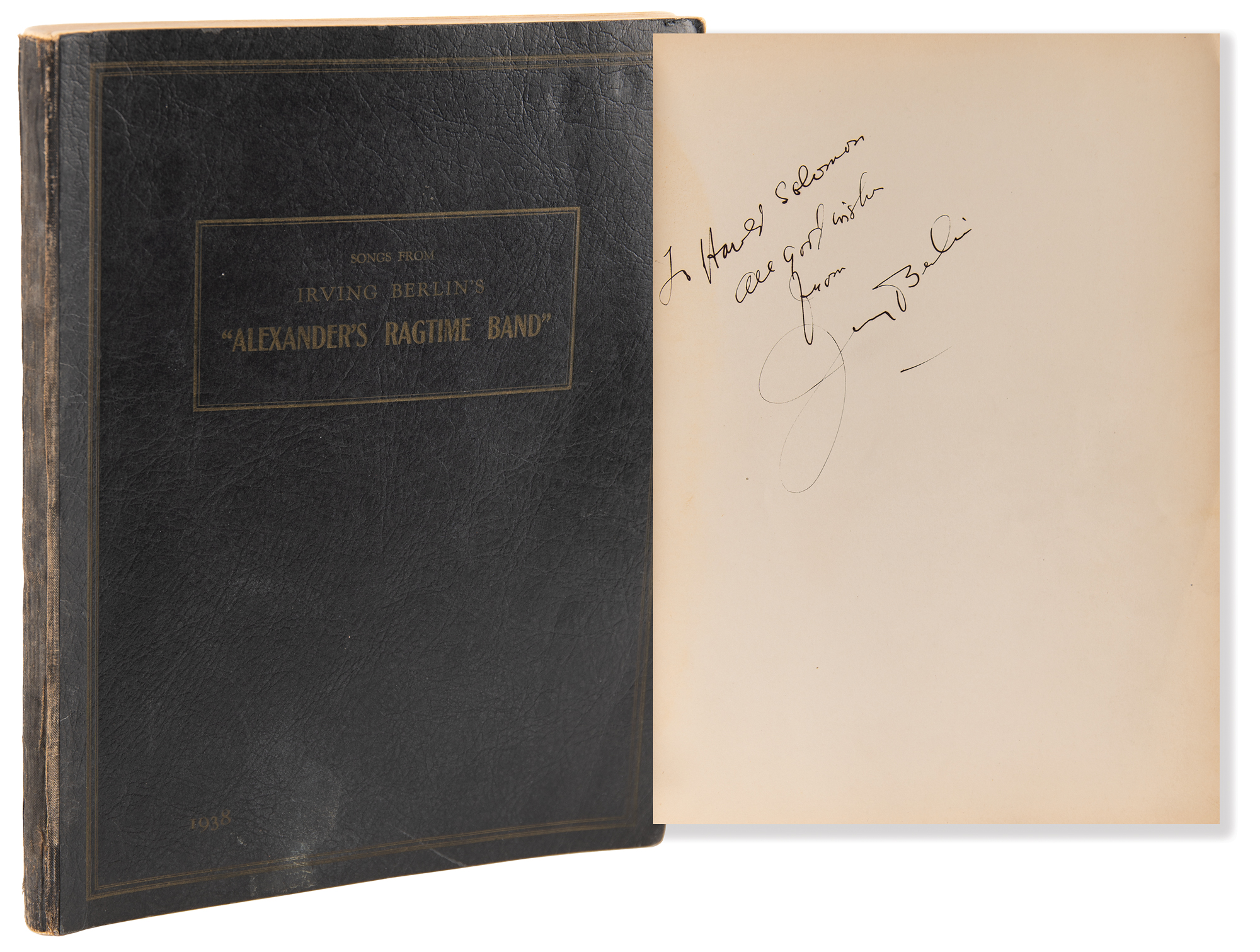 Scarce bound music book entitled ‘Songs from Irving Berlin's 'Alexander's Ragtime Band,’ 9.25 x 12, 180 pages, softcover, signed and inscribed on the first free end page in bold black ink, “to Harold Solomon, All good wishes from Irving Berlin.” In very good to fine condition, with light sunning and creasing to the spine, and general light handling wear overall.