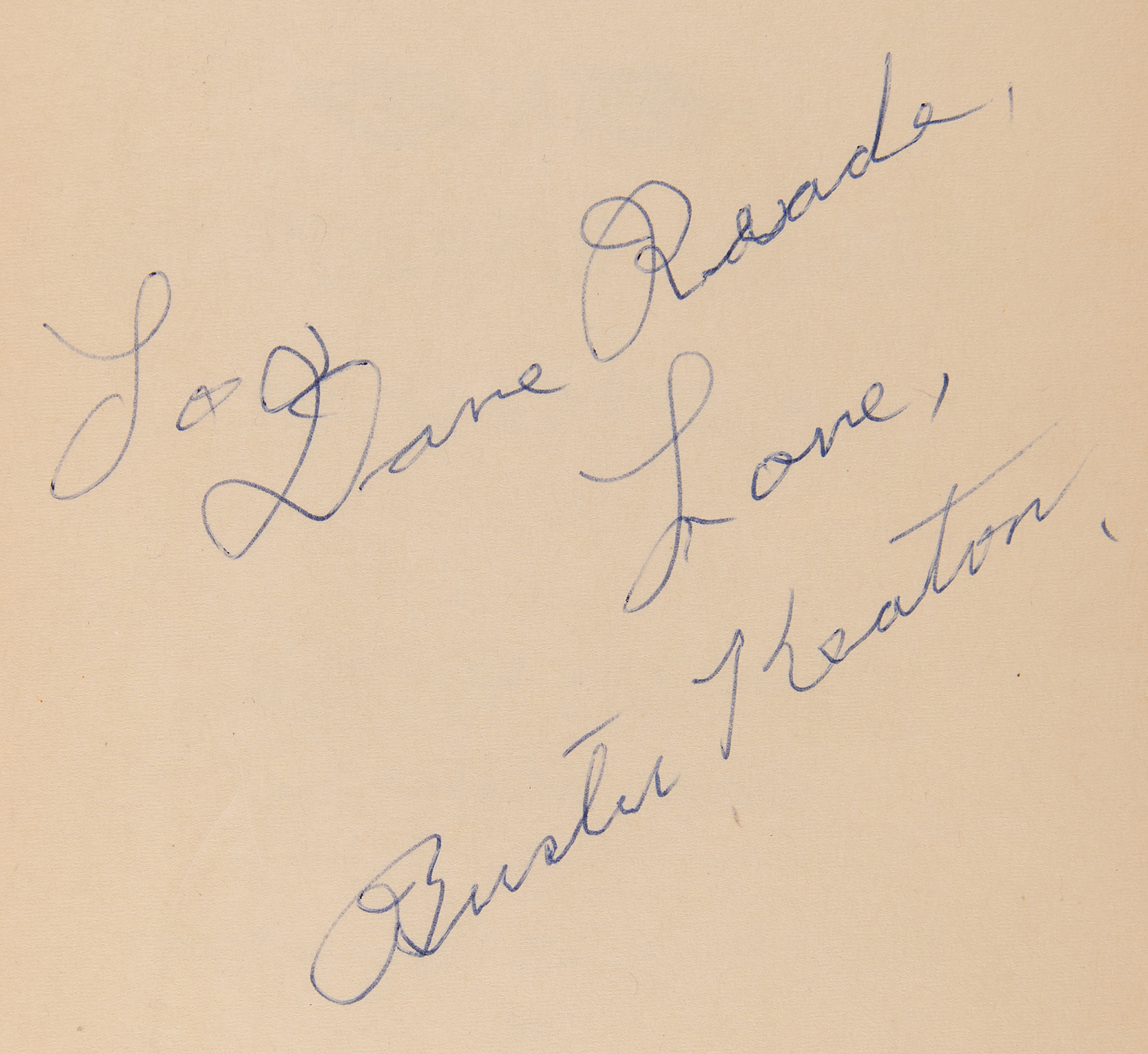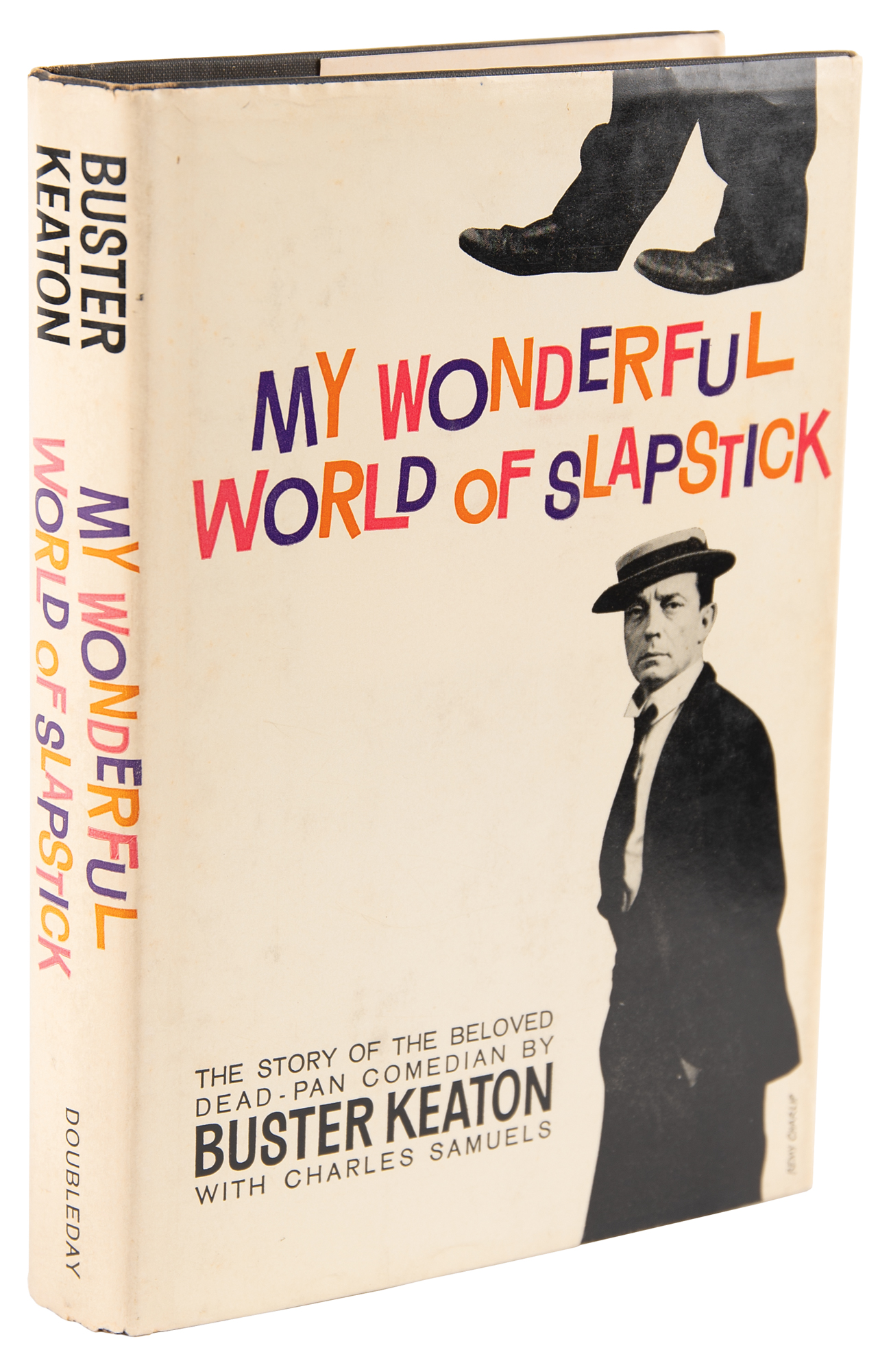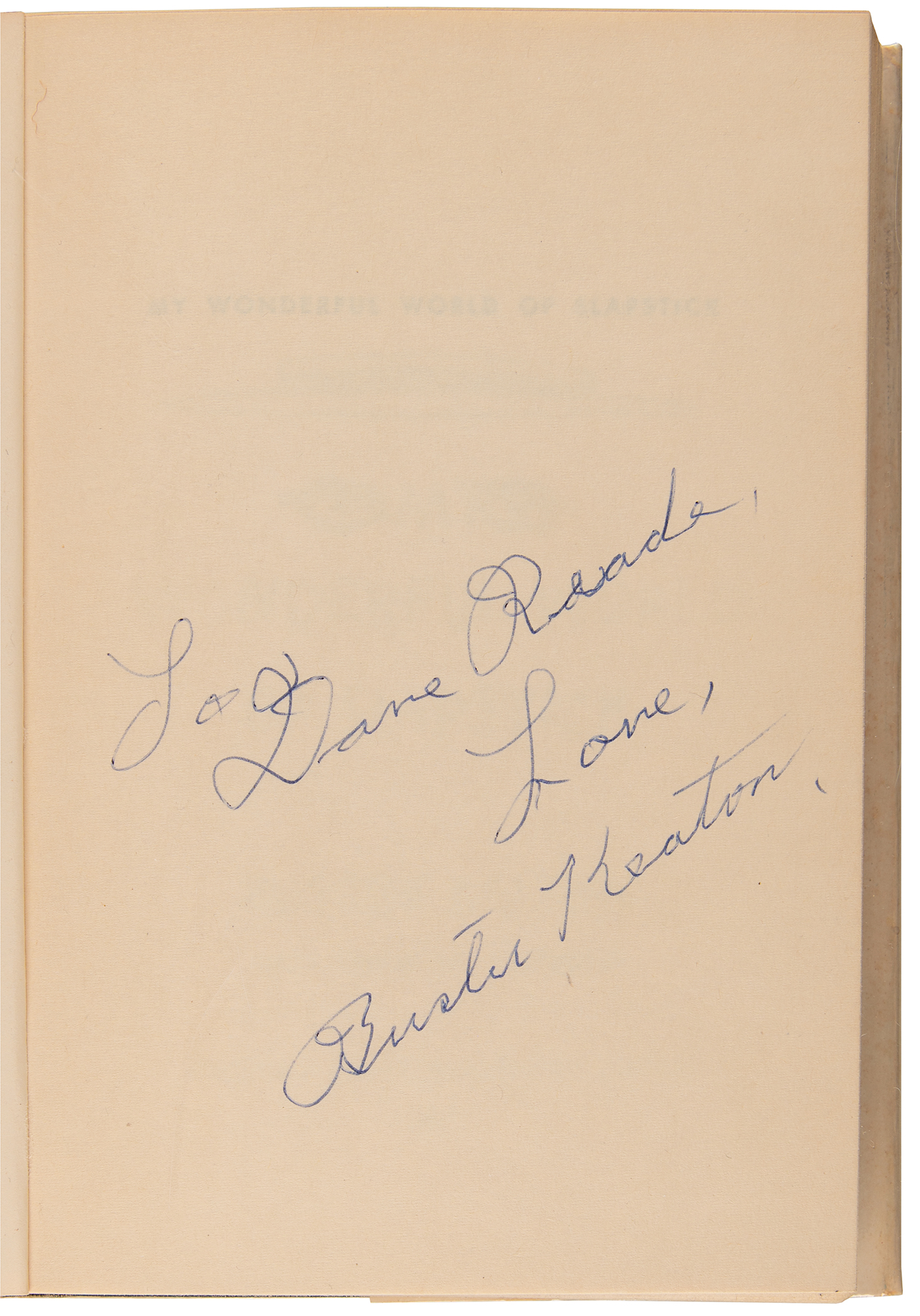 Signed book: My Wonderful World of Slapstick. First edition. NY: Doubleday, 1960. Hardcover with dust jacket, 6 x 8.5, 282 pages. Signed and inscribed on an opening page in ballpoint, "To Dave Reade, Love, Buster Keaton." In fine condition. An uncommon signed format from the movie legend.