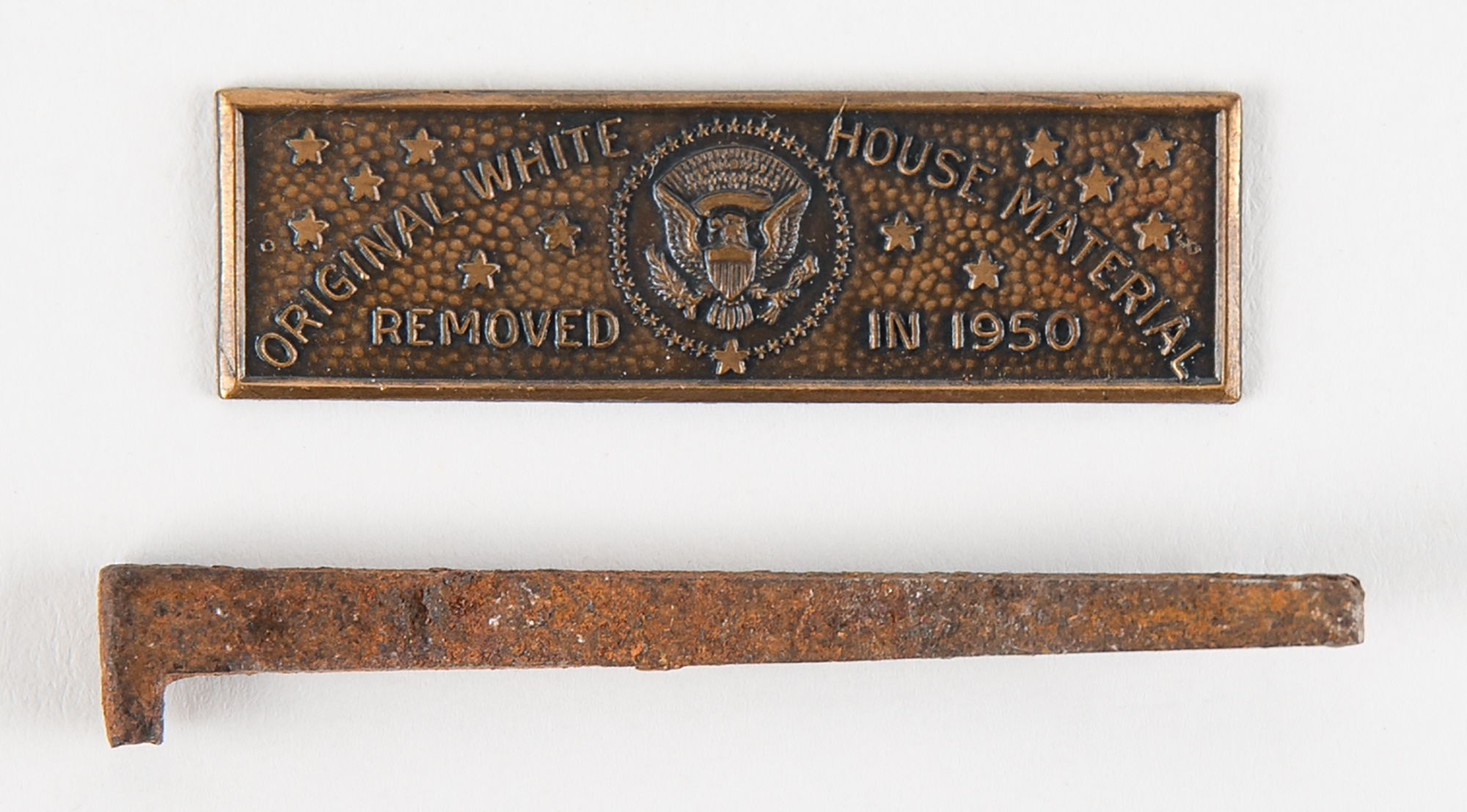 Unusual lot of material removed from the White House during its expansive renovations undertaken by Harry S. Truman in 1950, consisting of four stones—three pieces of marble (ranging from .5˝ to 1.25˝ in length) and one piece of schist (2˝)—and an 'L'-headed nail that measures 2.25˝. The lot is completed by its original shipping box and rare packing materials from the Commission on Renovation of the Executive Mansion, issued as "Order No. 18504" and "Item No. 4," as well as its small presentation plaque with presidential seal that reads: "Original White House Material, Removed in 1950." In overall fine condition, with expected wear from age and use.
