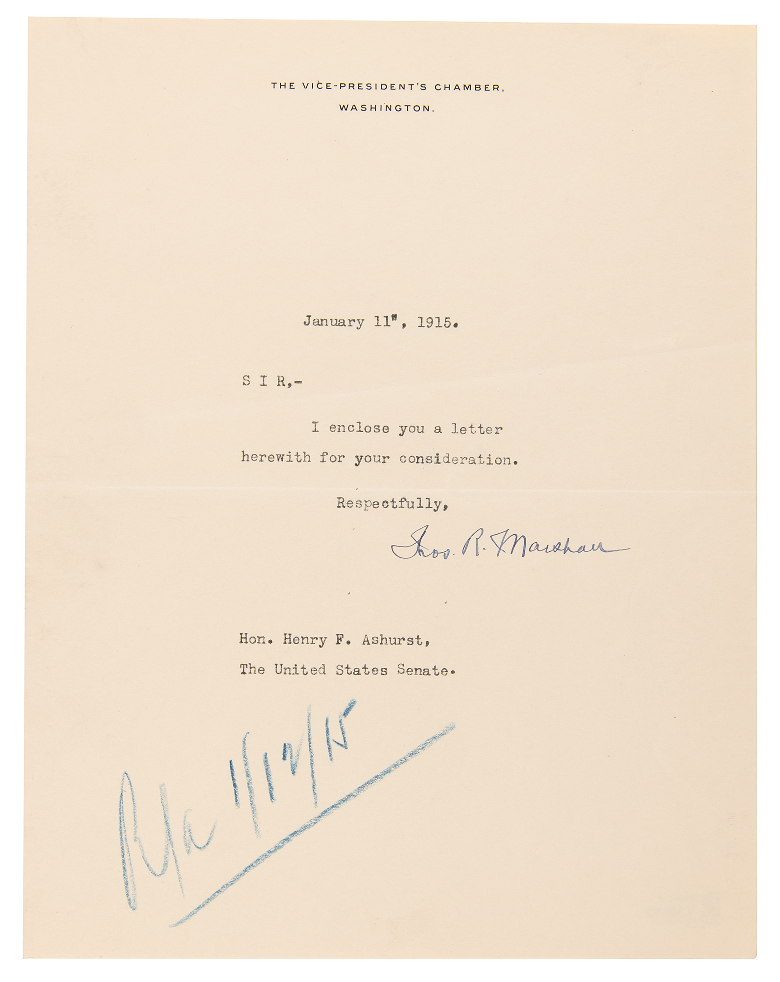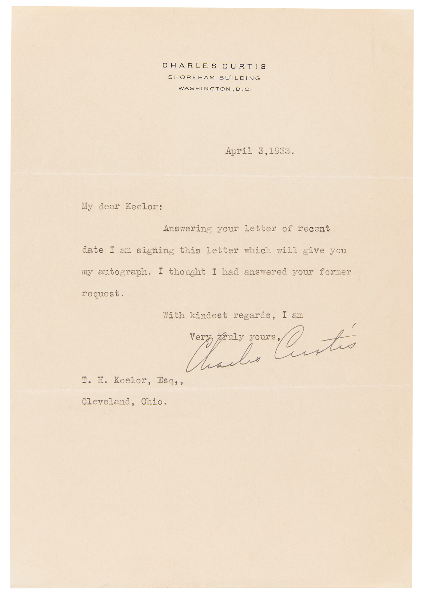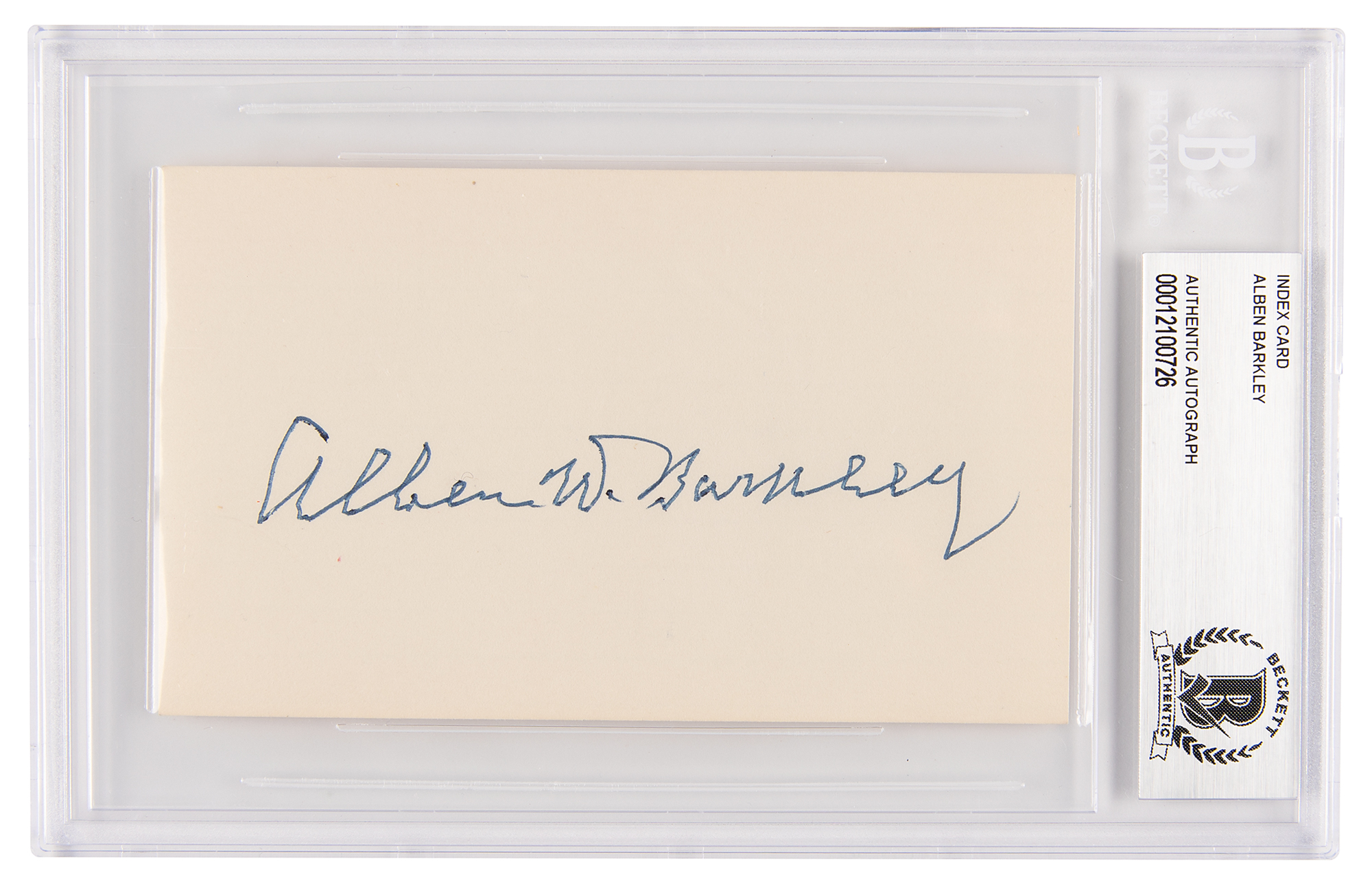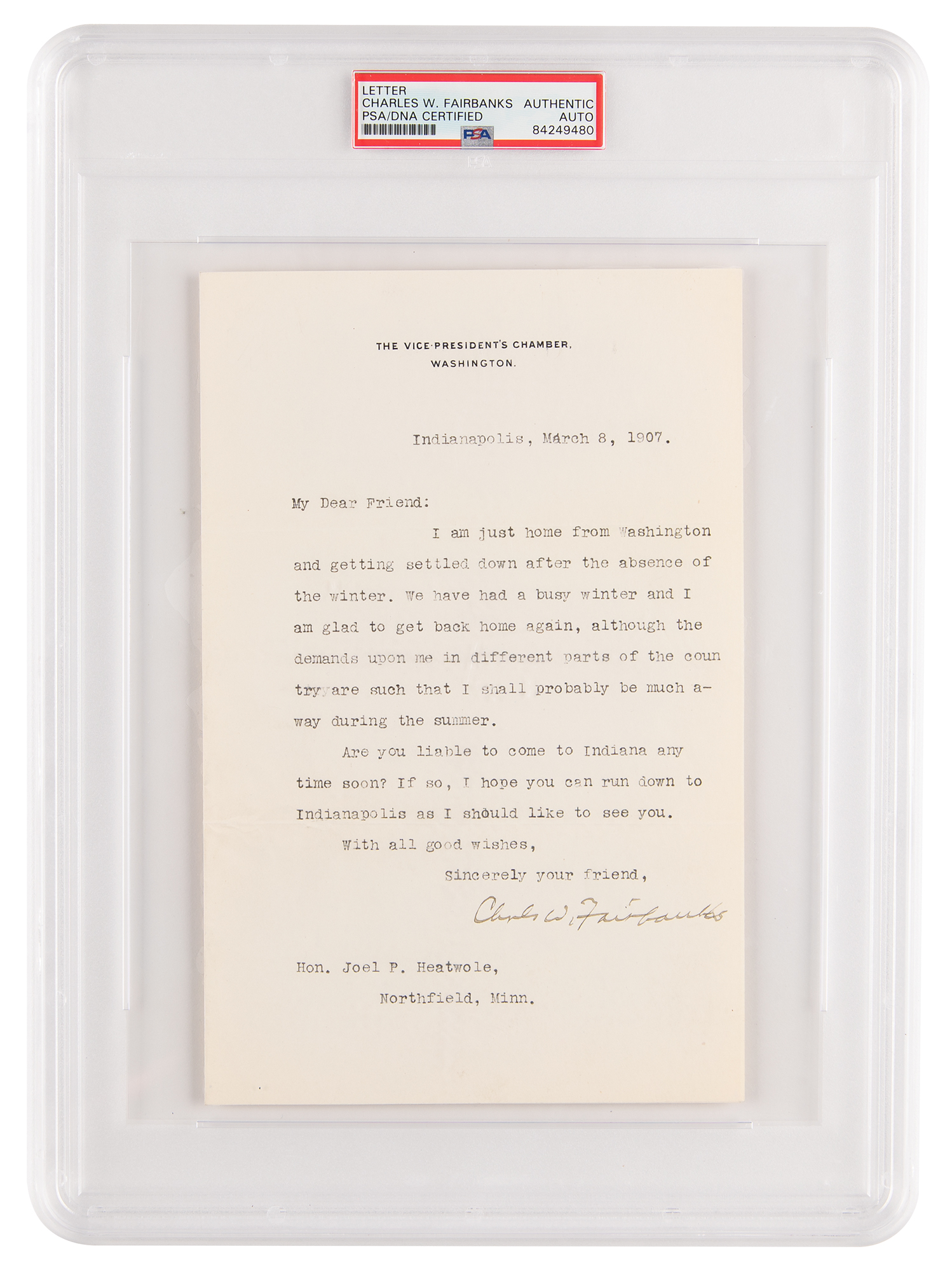 Collection of 16 items signed by an American vice president from the 20th or 21st centuries, consisting of formats like letters, books, and signatures. The list includes (signatures unless otherwise noted): Charles W. Fairbanks (TLS as VP), James S. Sherman (ALS), Thomas R. Marshall (TLS as VP), Charles G. Dawes, Charles Curtis (TLS), John Nance Garner (FDC), Henry A. Wallace, Alben W. Barkley, Hubert H. Humphrey (TLS), Spiro Agnew, Walter Mondale, Dan Quayle (book, first edition of Standing Firm), Al Gore (book, first edition of The Spirit of Family, also signed by Tipper Gore), Dick Cheney, Mike Pence (signed photo), and Kamala Harris. In overall very good to fine condition, with JSA labels affixed to the Agnew, Cheney, Gore, Humphrey, Pence, and Quayle items. Accompanied by full letters or certificates of authenticity from Beckett (Sherman and Marshall), PSA/DNA (Curtis and Gore), or JSA (Agnew, Cheney, Humphrey, Mondale, Pence, and Quayle). Fairbanks is encapsulated in a PSA/DNA authentication holder, and Barkley, Dawes, Garner, Harris, and Wallace are encapsulated by Beckett Authentication Services.