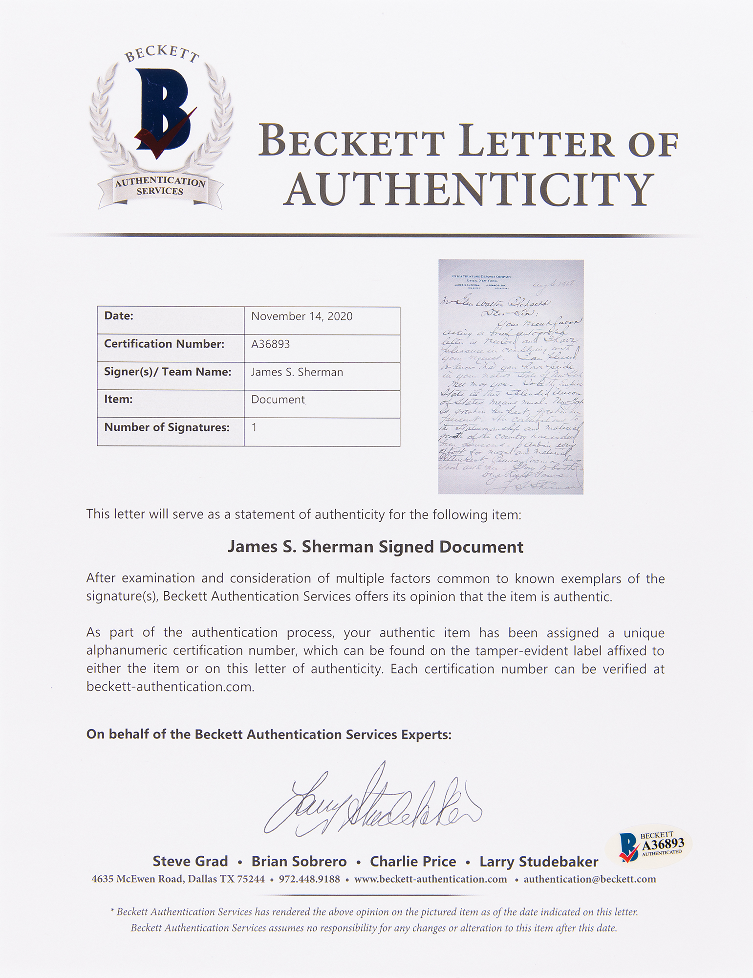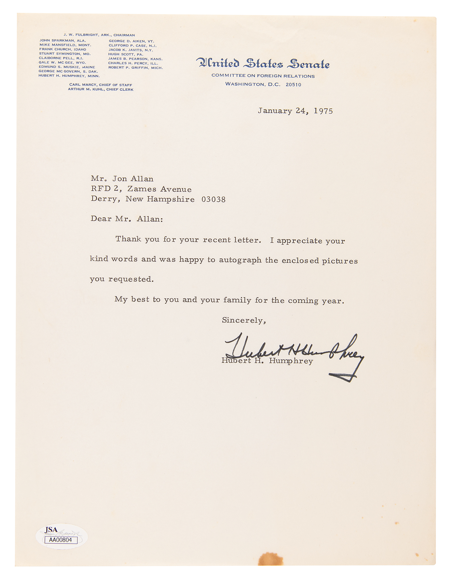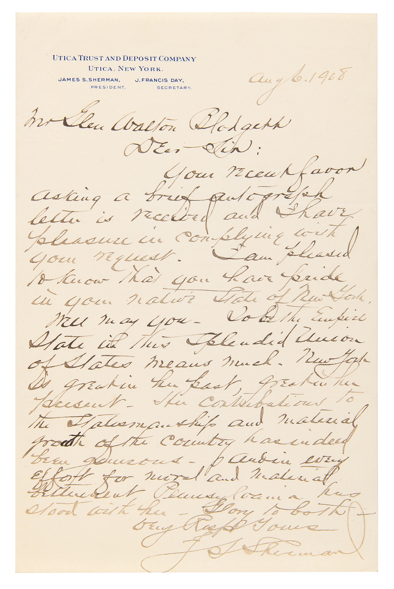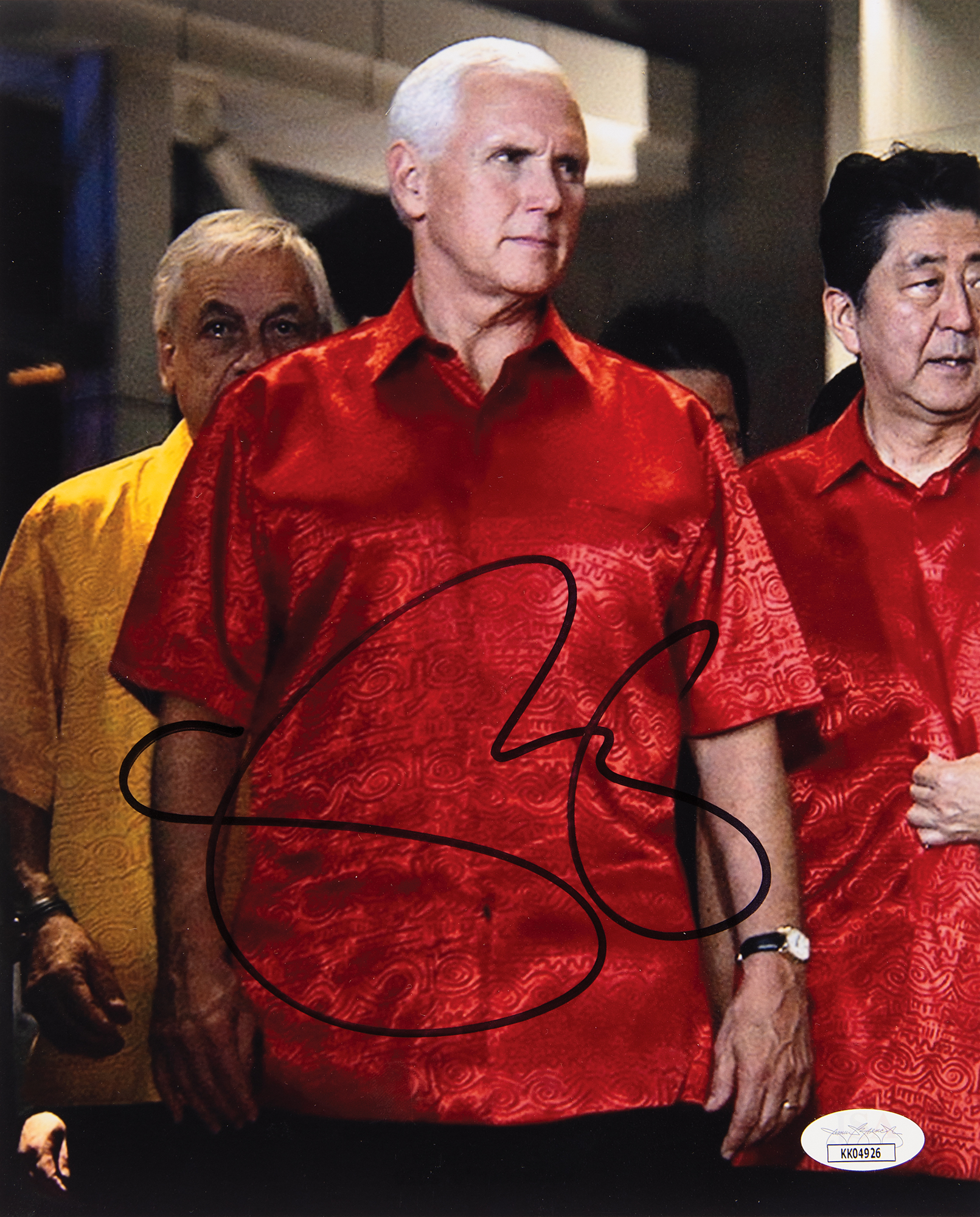 Collection of 16 items signed by an American vice president from the 20th or 21st centuries, consisting of formats like letters, books, and signatures. The list includes (signatures unless otherwise noted): Charles W. Fairbanks (TLS as VP), James S. Sherman (ALS), Thomas R. Marshall (TLS as VP), Charles G. Dawes, Charles Curtis (TLS), John Nance Garner (FDC), Henry A. Wallace, Alben W. Barkley, Hubert H. Humphrey (TLS), Spiro Agnew, Walter Mondale, Dan Quayle (book, first edition of Standing Firm), Al Gore (book, first edition of The Spirit of Family, also signed by Tipper Gore), Dick Cheney, Mike Pence (signed photo), and Kamala Harris. In overall very good to fine condition, with JSA labels affixed to the Agnew, Cheney, Gore, Humphrey, Pence, and Quayle items. Accompanied by full letters or certificates of authenticity from Beckett (Sherman and Marshall), PSA/DNA (Curtis and Gore), or JSA (Agnew, Cheney, Humphrey, Mondale, Pence, and Quayle). Fairbanks is encapsulated in a PSA/DNA authentication holder, and Barkley, Dawes, Garner, Harris, and Wallace are encapsulated by Beckett Authentication Services.
