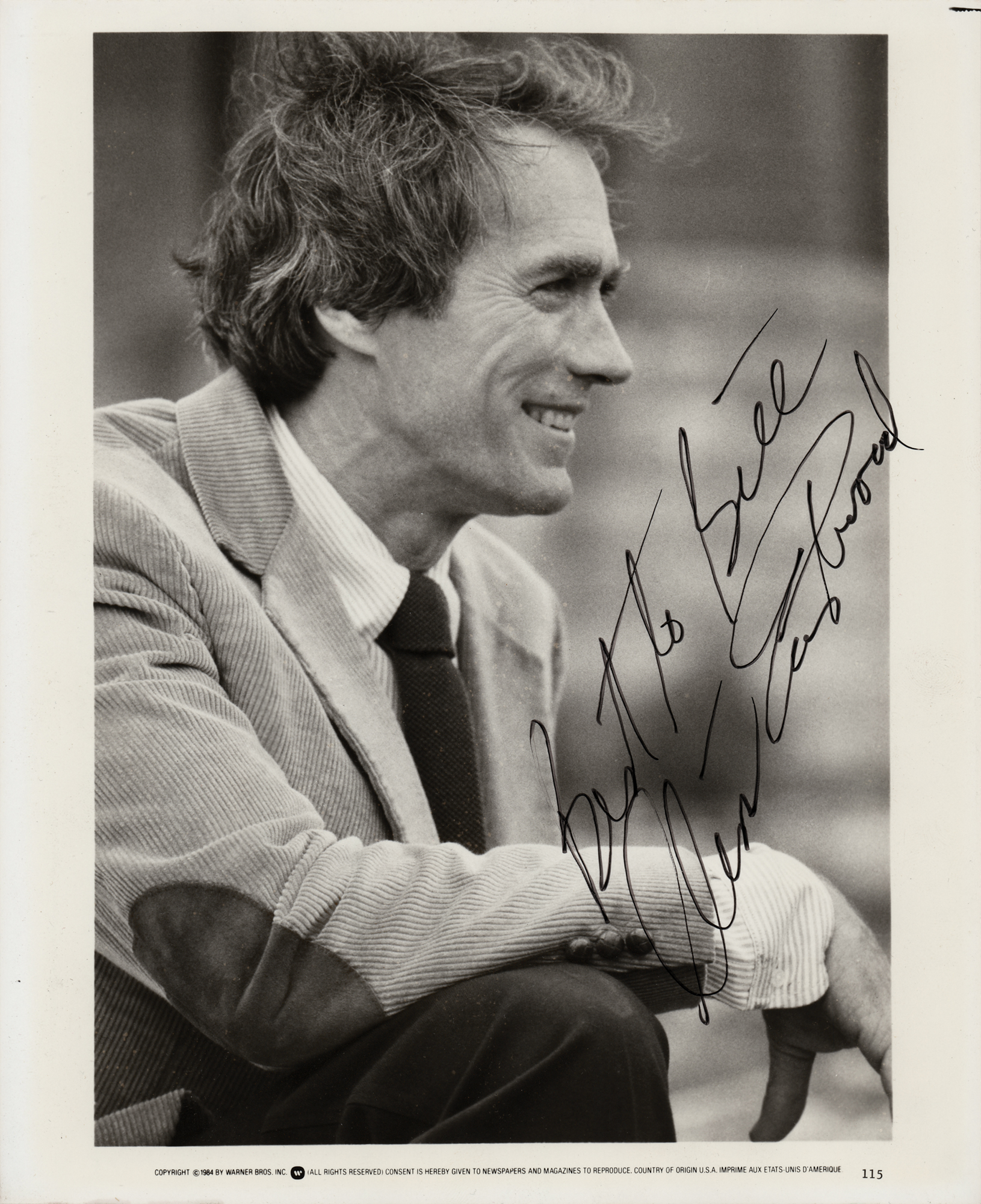 Glossy 8 x 9.75 Warner Bros. publicity photo of Eastwood for the 1984 film City Heat, signed and inscribed prominently in black felt tip to fellow actor and costar William Sanderson, “Best to Bill, Clint Eastwood.” In fine condition.