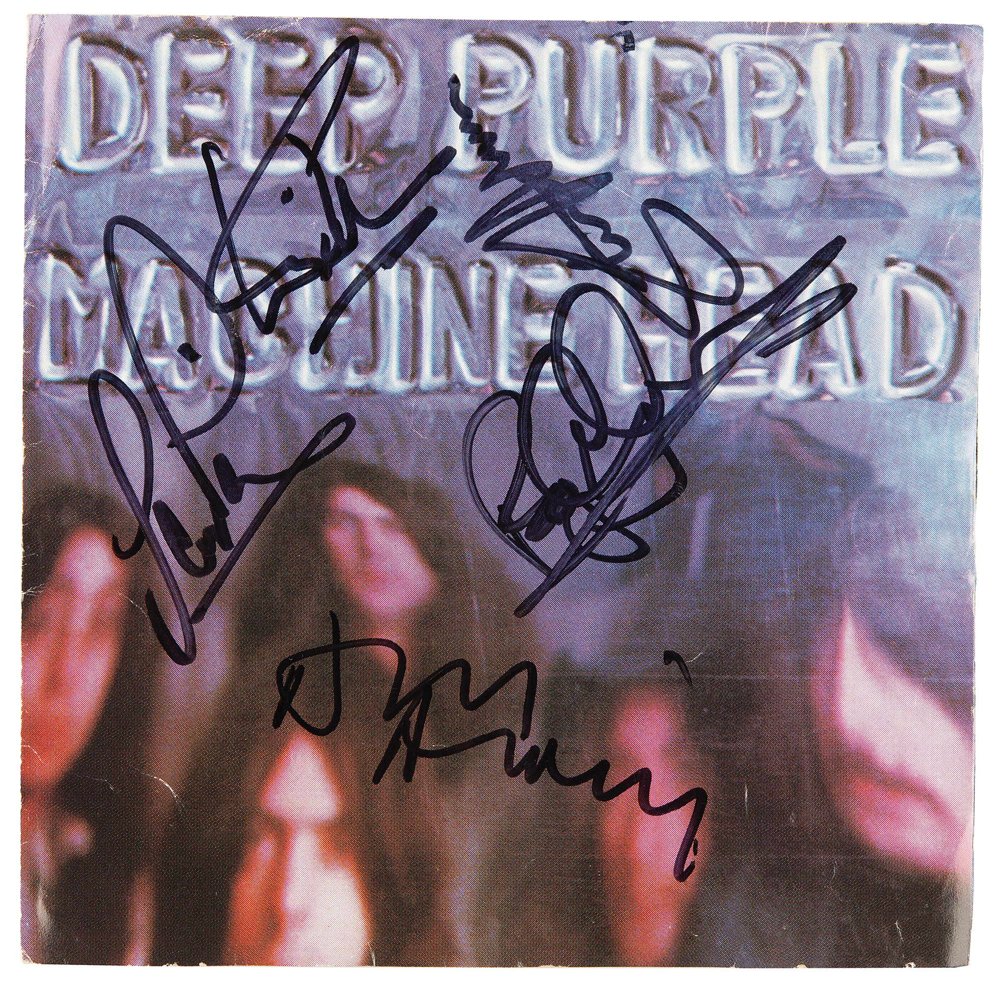 Machine Head CD by Deep Purple, signed on the front cover in black felt tip by Roger Glover, Ian Gillian, Ian Paice, Steve Morse, and Don Airey. In very good condition, with moderately heavy creasing to the booklet. The CD is included, as is a pink ‘Steve Morse / Deep Purple’ guitar pick.