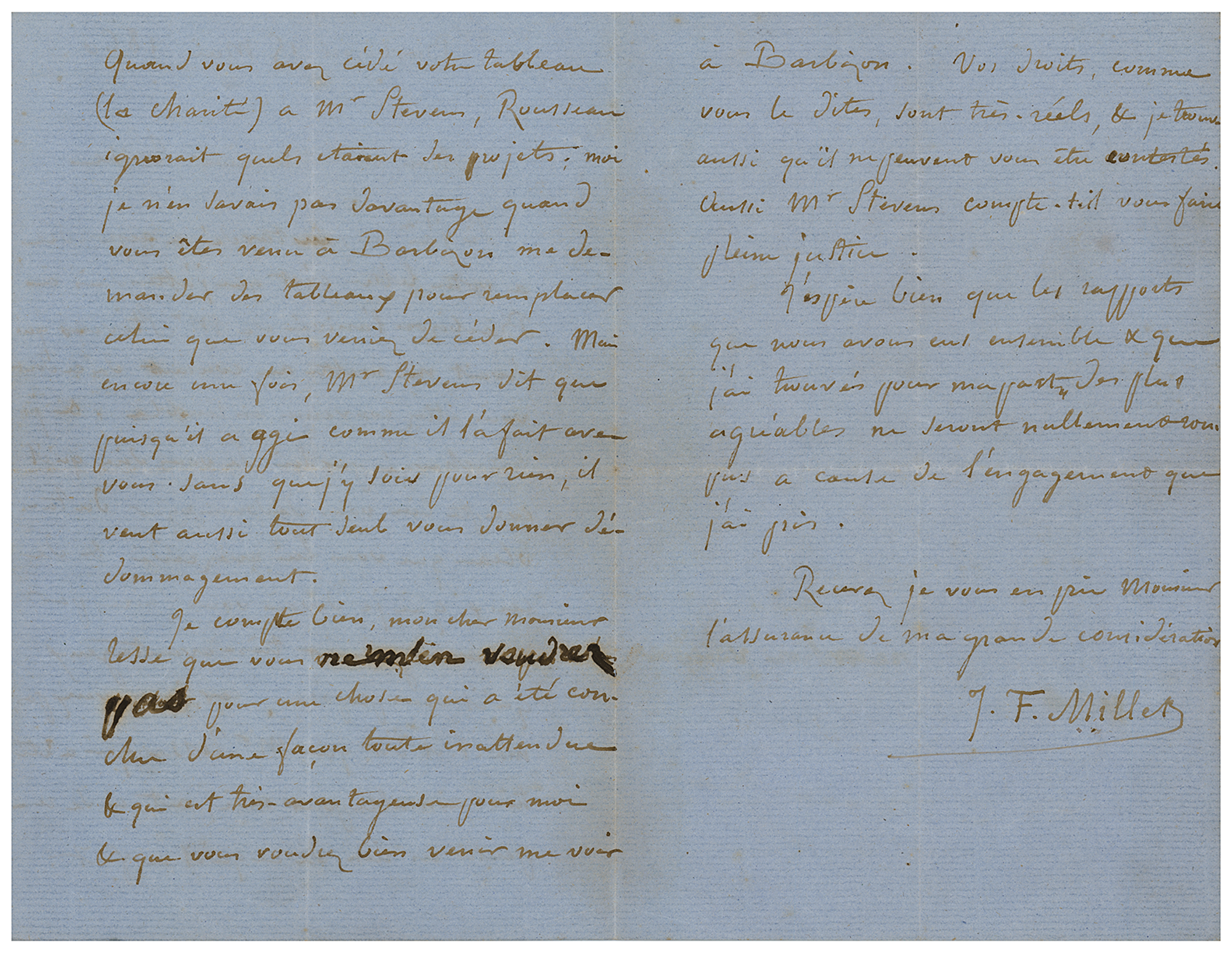 French painter (1814–1875) known as one of the founders of the Barbizon school. ALS in French, signed “J. F. Millet,” three pages on two adjoining sheets, 5.25 x 8, May 15, 1860. Untranslated handwritten letter by Millet from the village of Barbizon, France, where refined his realist technique. In fine condition.