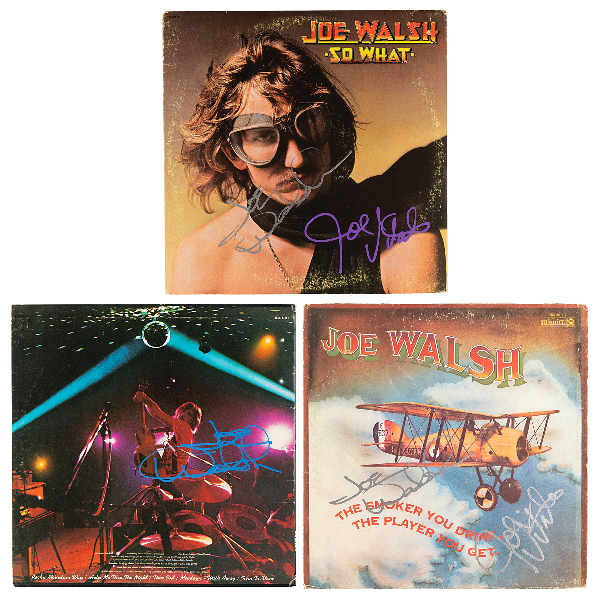 Three albums by Joe Walsh—So What, The Smoker You Drink, the Player You Get, and You Can't Argue with a Sick Mind—the first two signed on the front cover in silver ink by Walsh, and the third signed on the back cover in blue paint pen. The first two albums are also signed by Joe Vitale. In overall fine condition, with some light scuffing and partial edge separations. The So What and Smoker records are included.