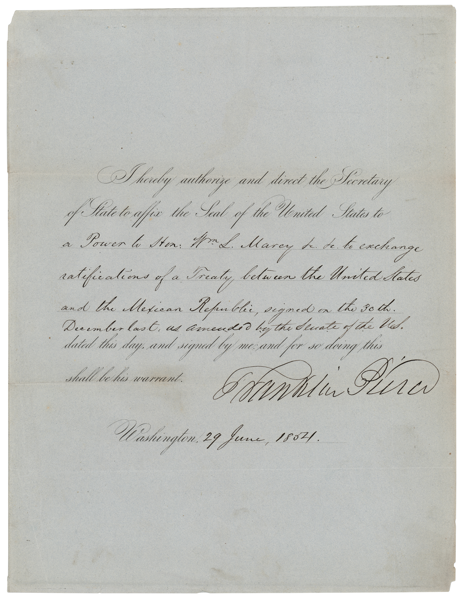 Significant partly-printed DS as president, one page, 8 x 10.5, June 29, 1854. President Pierce directs the Secretary of State to affix the Seal of the United States to “a Power to Hon. Wm. L. Marcy etc. etc. to exchange ratifications of a Treaty between the United States and the Mexican Republic, signed on the 30th December last, as amended by the Senate of the U.S.” Signed prominently at the conclusion by Franklin Pierce. In fine condition.