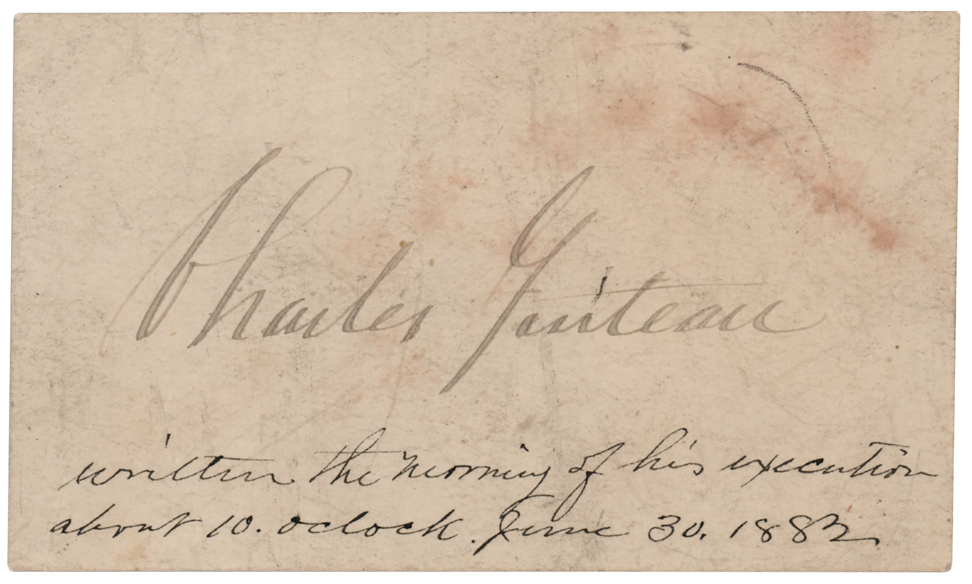 Ink signature, "Charles Guiteau,” on an off-white 3.75 x 2.25 card, which bears period collector’s notations below: “Written the morning of his execution about 10 o’clock, June 30, 1882.” In very good to fine condition, with light soiling and staining.