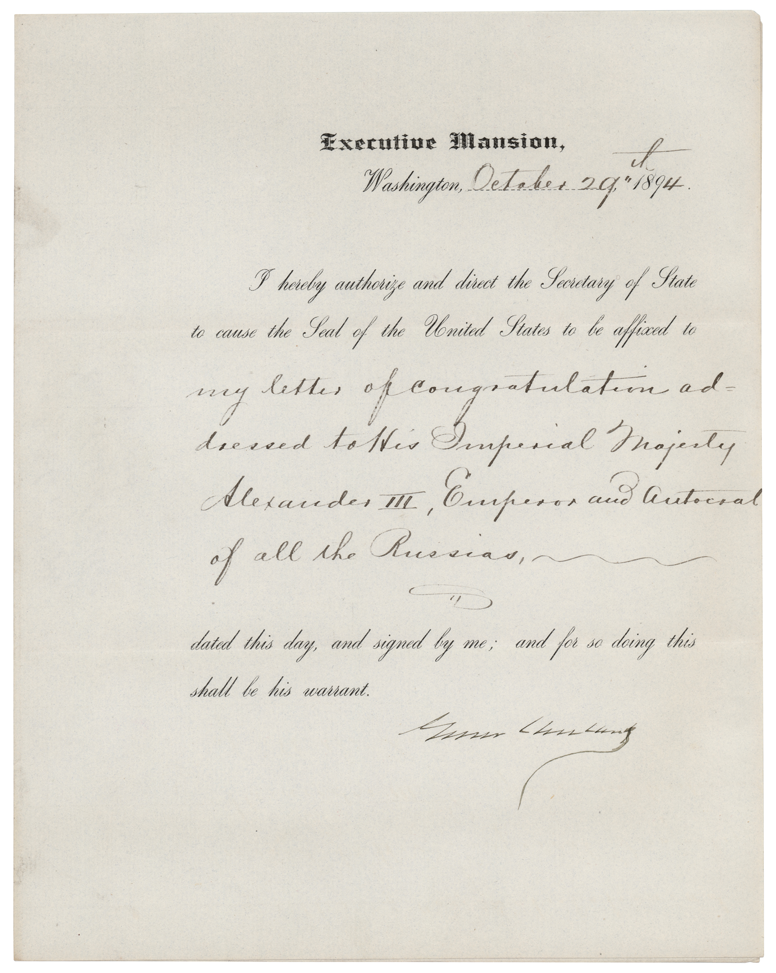 Partly-printed DS as president, one page, 8 x 10, October 29, 1894. President Cleveland directs the Secretary of State to cause the Seal of the United States to be affixed to “my letter of congratulations addressed to His Imperial Majesty Alexander III, Emperor and Autocrat of all the Russias.” Signed at the conclusion by Grover Cleveland. In fine condition.