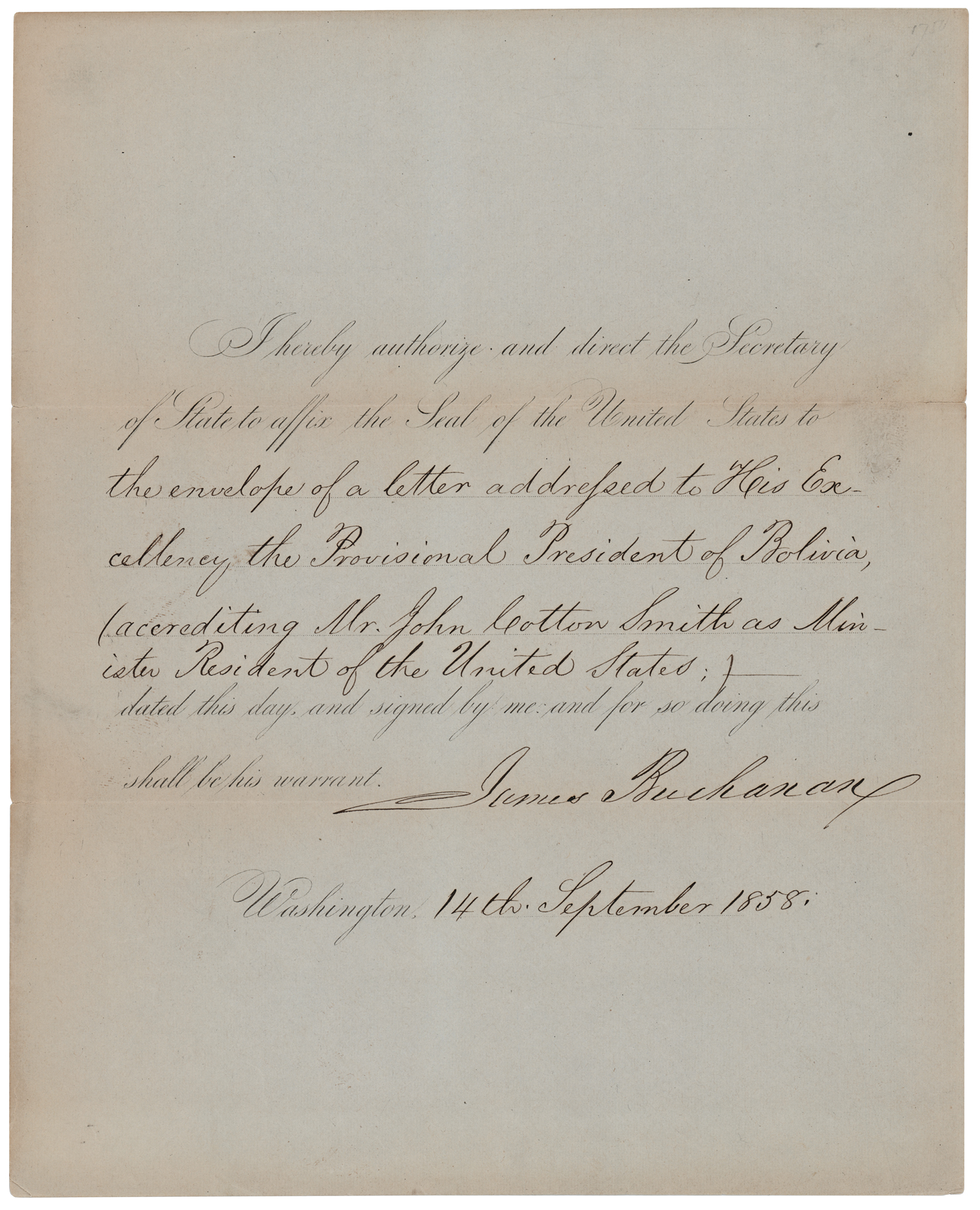 Partly-printed DS as president, one page, 8 x 10, September 14, 1858. President Buchanan directs the Secretary of State to affix the Seal of the United States to “the envelope of a letter addressed to His Excellency, the Provisional President of Bolivia, (accrediting Mr. John Cotton Smith as Minister Resident of the United States).” Signed prominently at the conclusion by James Buchanan. In very good to fine condition, with a light diagonal crease to the lower left, and light toning to the edges and folds.