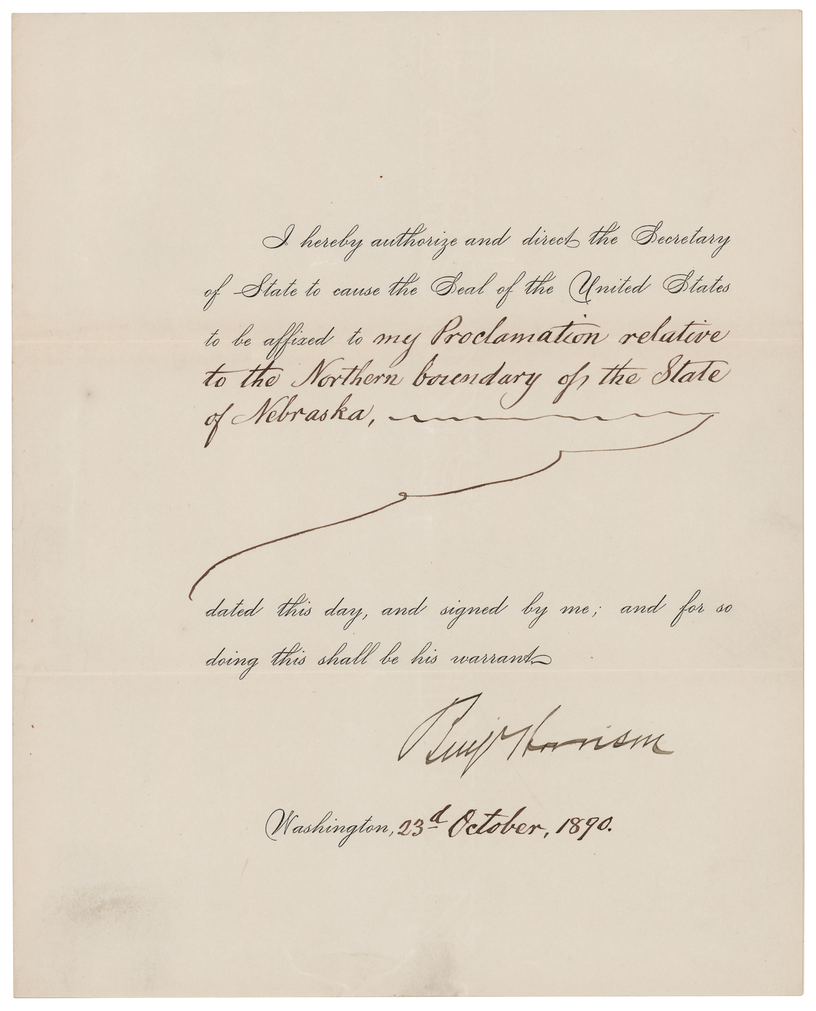 Partly-printed DS as president, signed “Benj. Harrison,” one page, 8 x 10, October 23, 1890. President Harrison directs the Secretary of State to cause the Seal of the United States to be affixed to “my Proclamation relative to the Northern boundary of the State of Nebraska.” Signed boldly at the conclusion by Benjamin Harrison. In fine condition.