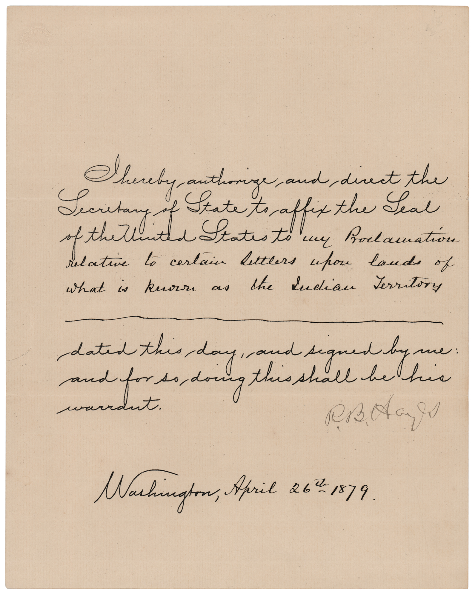 Partly-printed DS as president, signed “R. B. Hayes,” one page, 7.75 x 10, April 26, 1879. President Hayes directs the Secretary of State to affix the Seal of the United States to “my Proclamation relative to certain settlers upon lands of what is known as the Indian Territory.” Signed at the conclusion by Rutherford B. Hayes. In fine condition, with a short tear to the left edge.