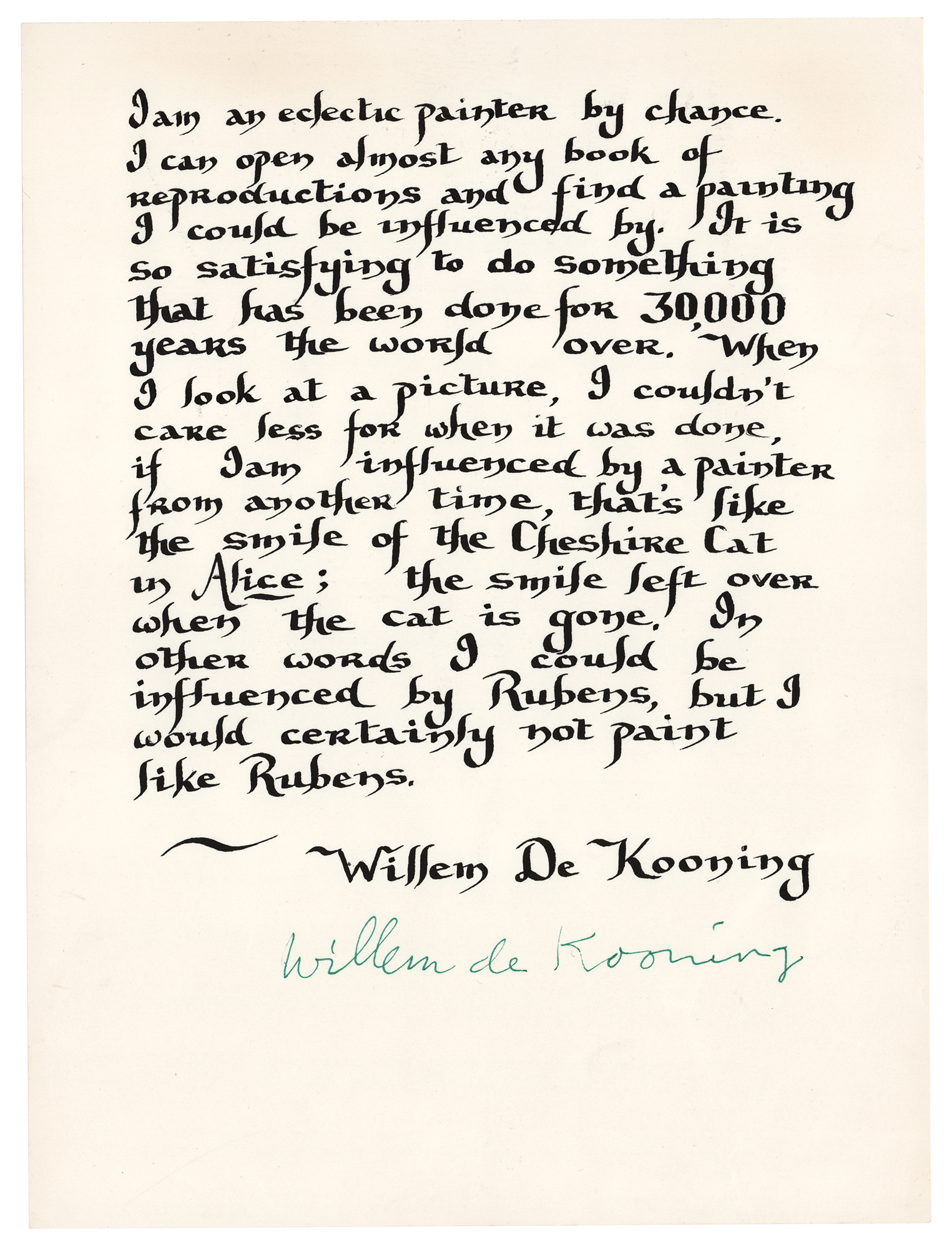 Dutch-American abstract expressionist artist (1904–1997). Calligraphic quote attributed to artist Willem de Kooning and accomplished in an unknown hand, one page, 9 x 12, no date, signed at the conclusion in green ink by De Kooning. The quote, in part: “I am an eclectic painter by chance. I can open almost any book of reproductions and find a painting I could be influenced by. It is so satisfying to do something that has been done for 30,000 years the world over…I could be influenced by Rubens, but I would certainly not paint like Rubens.” In fine condition.