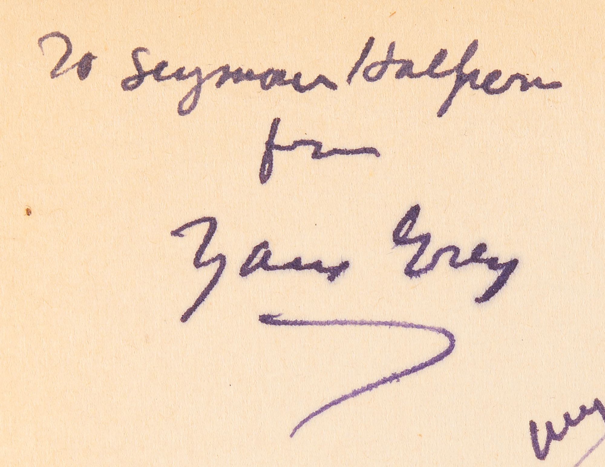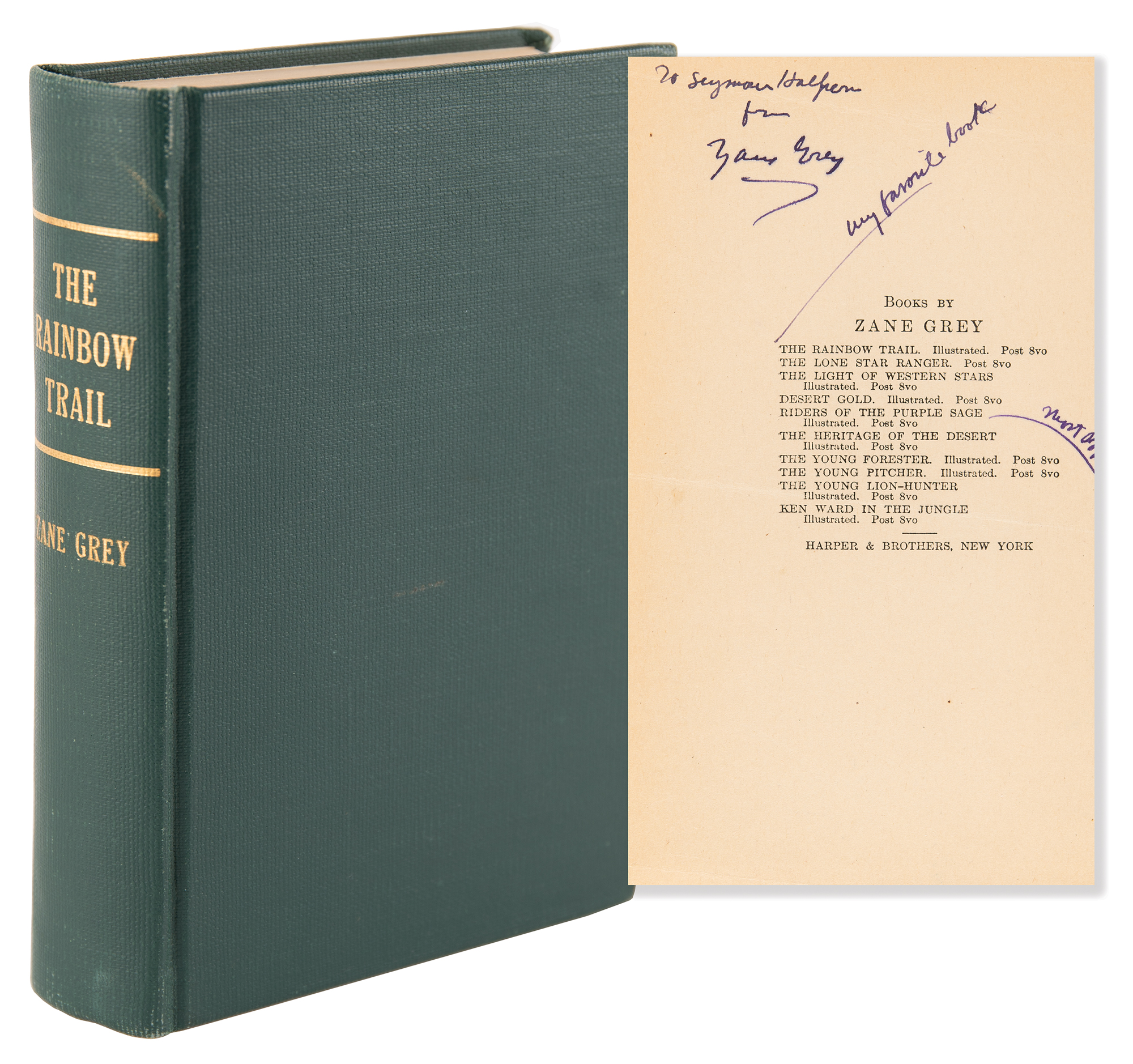 Signed book: The Rainbow Trail. First edition, later printing (I-P). NY: Harper & Brothers, 1915. Hardcover, 5.25 x 7.5, 373 pages. Signed and inscribed on the opening ‘Books by Zane Grey’ page in black ink to a noted New York politician, “To Seymour Halpern, from Zane Grey,” who draws lines to two book titles, The Rainbow Trail and Riders of the Purple Sage, and writes: “My favorite book” and “Most popular book.” In fine condition, with an ownership signature on the facing page.