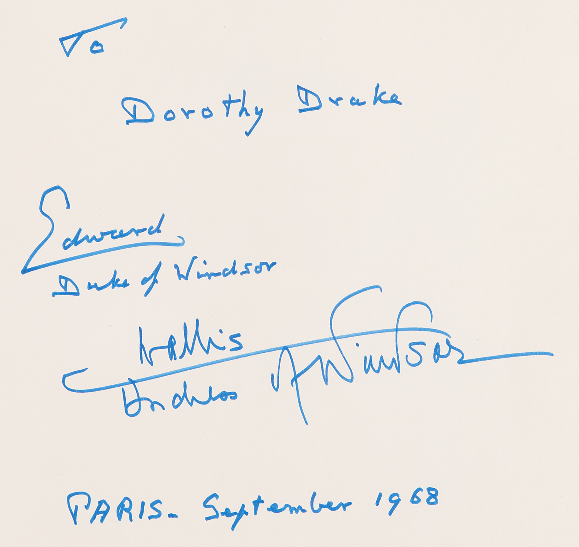 Signed book: The Windsor Years. First edition. London: Collins, 1967. Hardcover with dust jacket, 10 x 13, 303 pages. Signed and inscribed on the half-title page in blue felt tip, "To Dorothy Drake, Edward, Duke of Windsor, Paris - September 1968" and "Wallis Duchess of Windsor." In fine condition, with light wear and tears to the dust jacket.