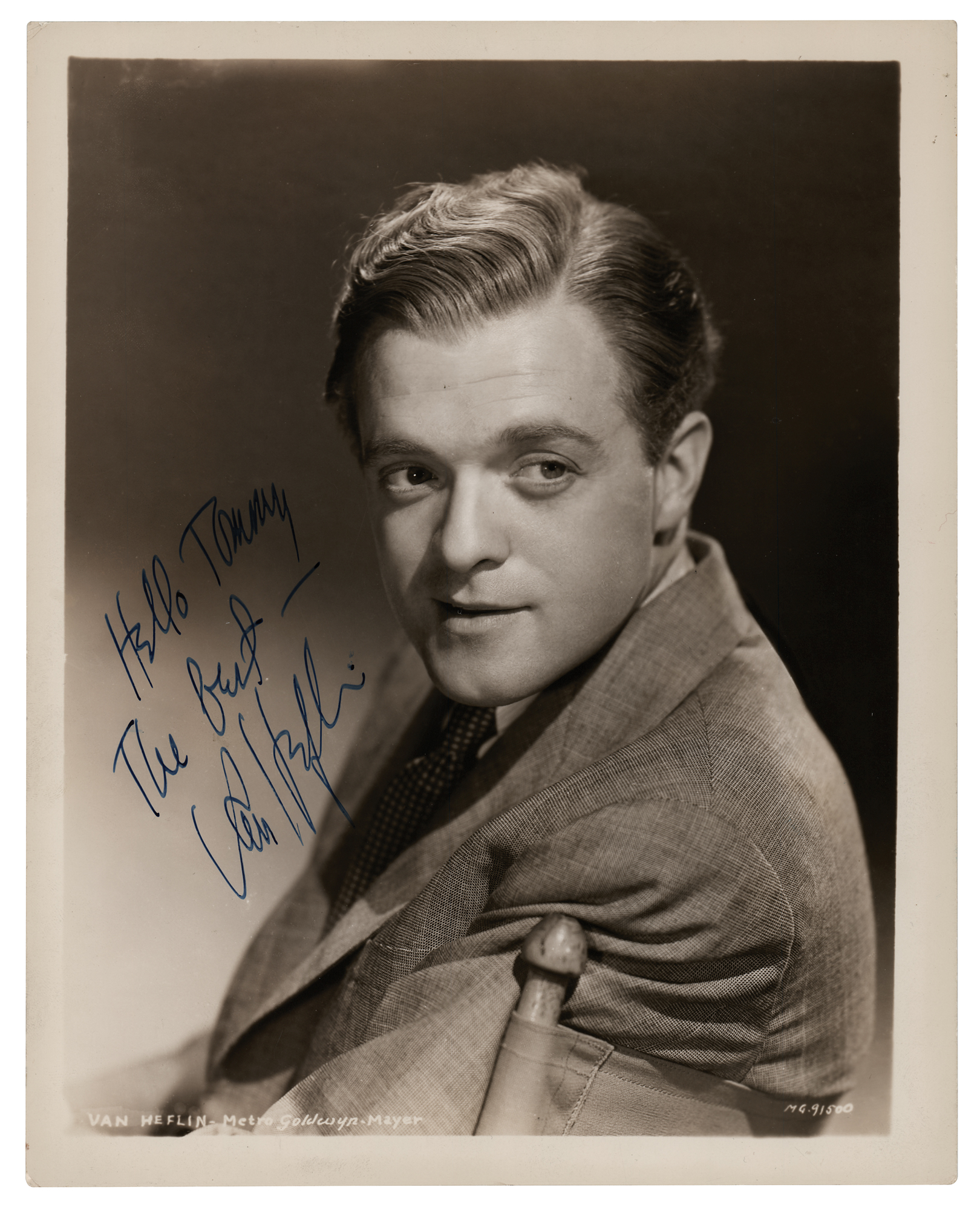 Vintage glossy 8 x 10 Metro-Goldwyn-Mayer publicity photo of the Oscar-winning actor, signed and inscribed in fountain pen, "Hello Tommy, the best—Van Heflin.” In fine condition.