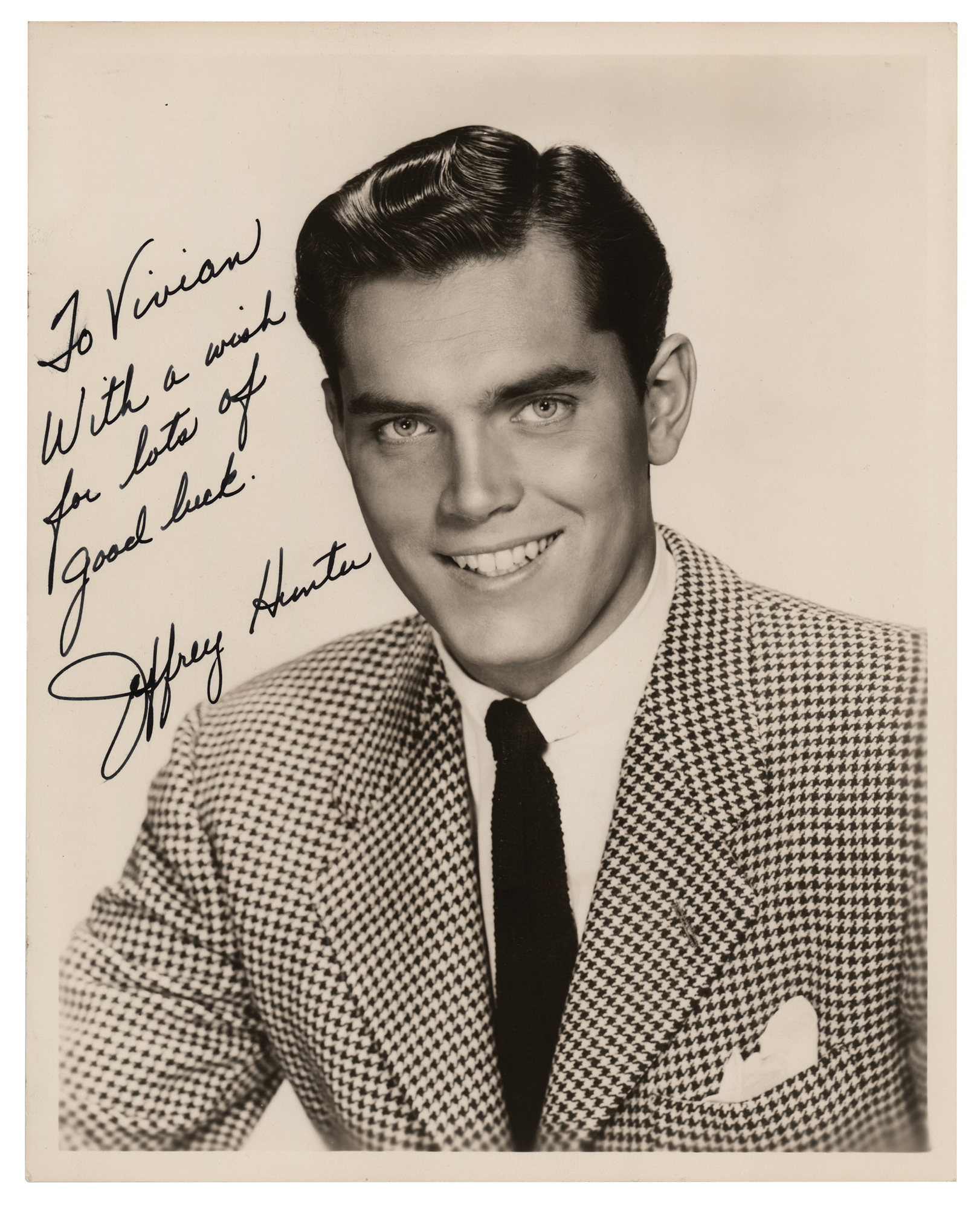 Vintage matte-finish 8 x 10 photo of the actor in a tweed jacket, boldly signed and inscribed in fountain pen, "To Vivian, With a wish for lots of good luck, Jeffrey Hunter.” In fine condition, with an unobtrusive crease to the lower left corner.