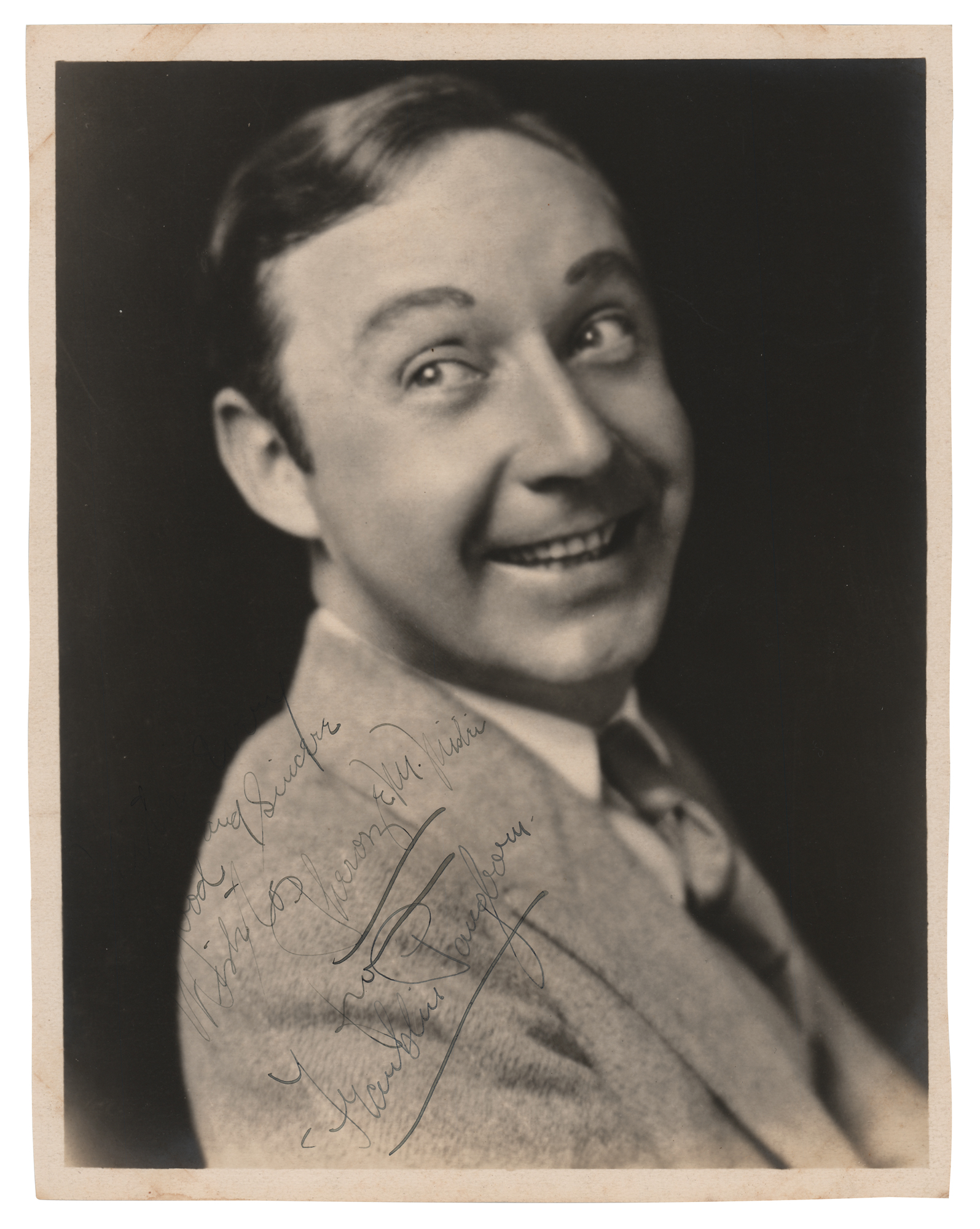 Vintage matte-finish 7.75 x 10 photo of the comedic actor glancing over his shoulder, signed and inscribed in fountain pen, "With every good and sincere wish to Pheronze M. Mistri, from Franklin Pangborn.” In fine condition.