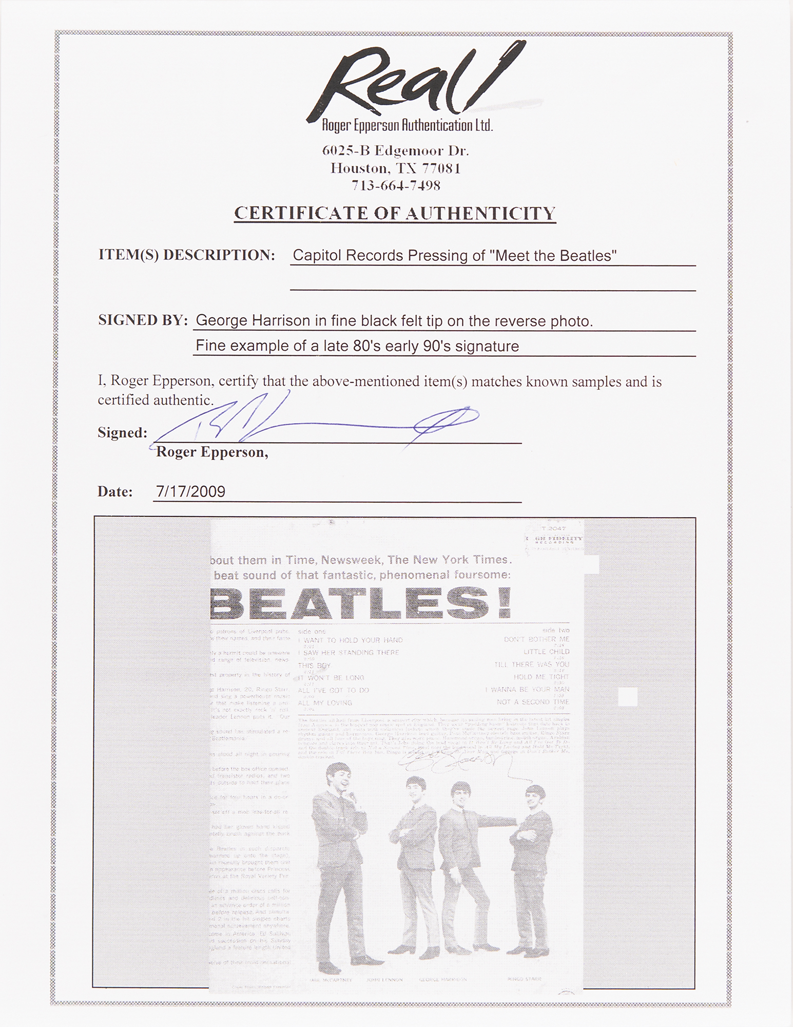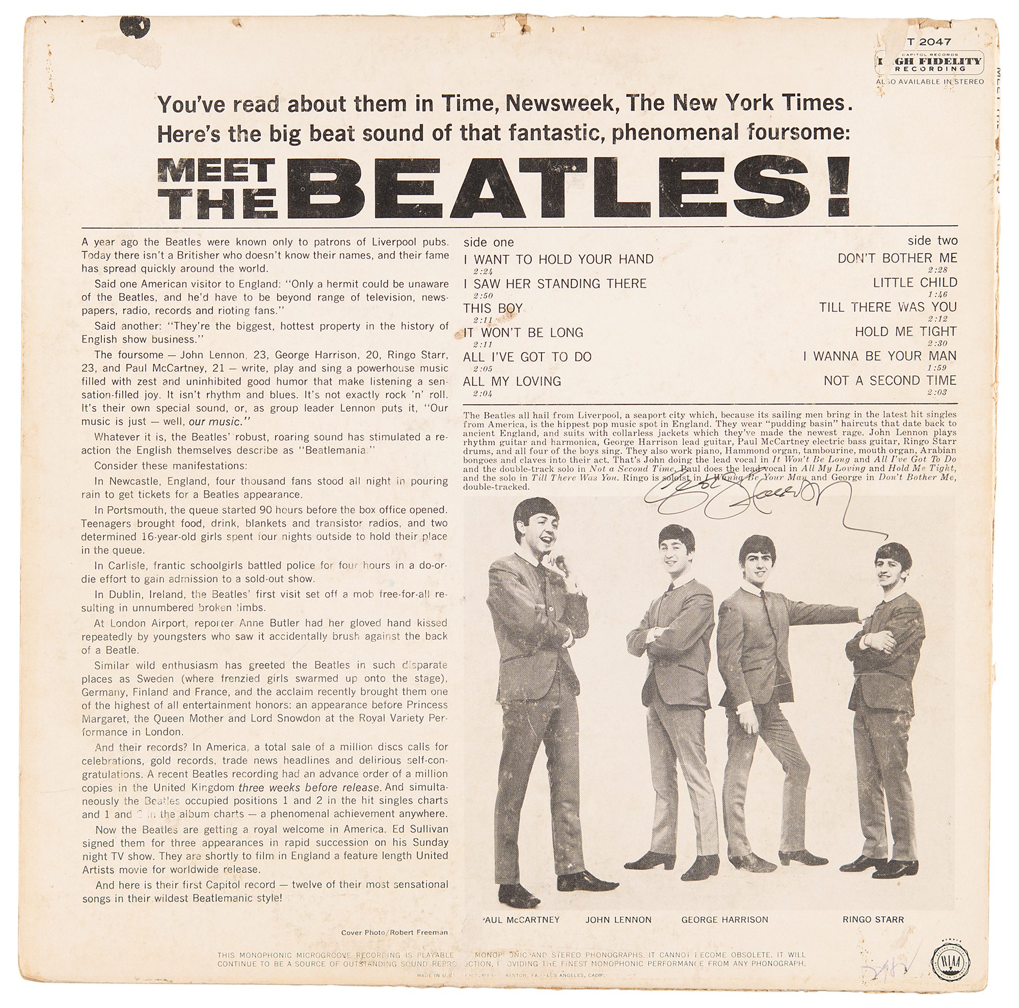 Capitol Records ‎(T 2047) pressing of the Meet the Beatles! album, signed neatly on the back cover in black ink by George Harrison. In very good to fine condition, with light scuffing, some minor surface loss, and wear and partial separations to the edges. The record is not included. Accompanied by full letters of authenticity from Tracks and REAL, and a letter of provenance indicating that the signature was obtained by a pilot of a private airliner in the 1980s.