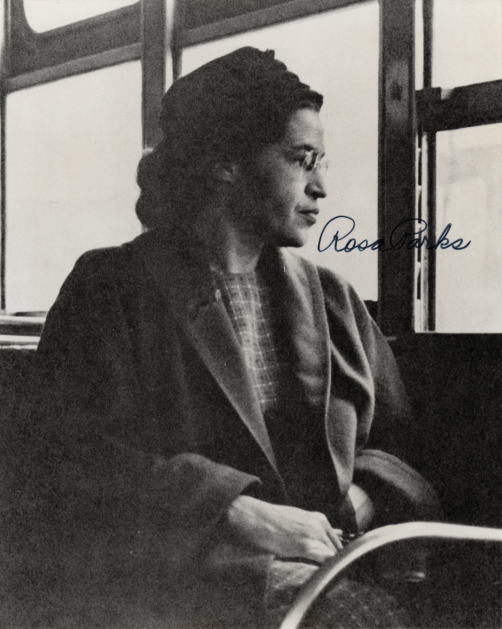 Glossy 8 x 10 photo of Rosa Parks looking through a bus window, signed in black felt tip. In fine condition, with a somewhat grainy image quality.