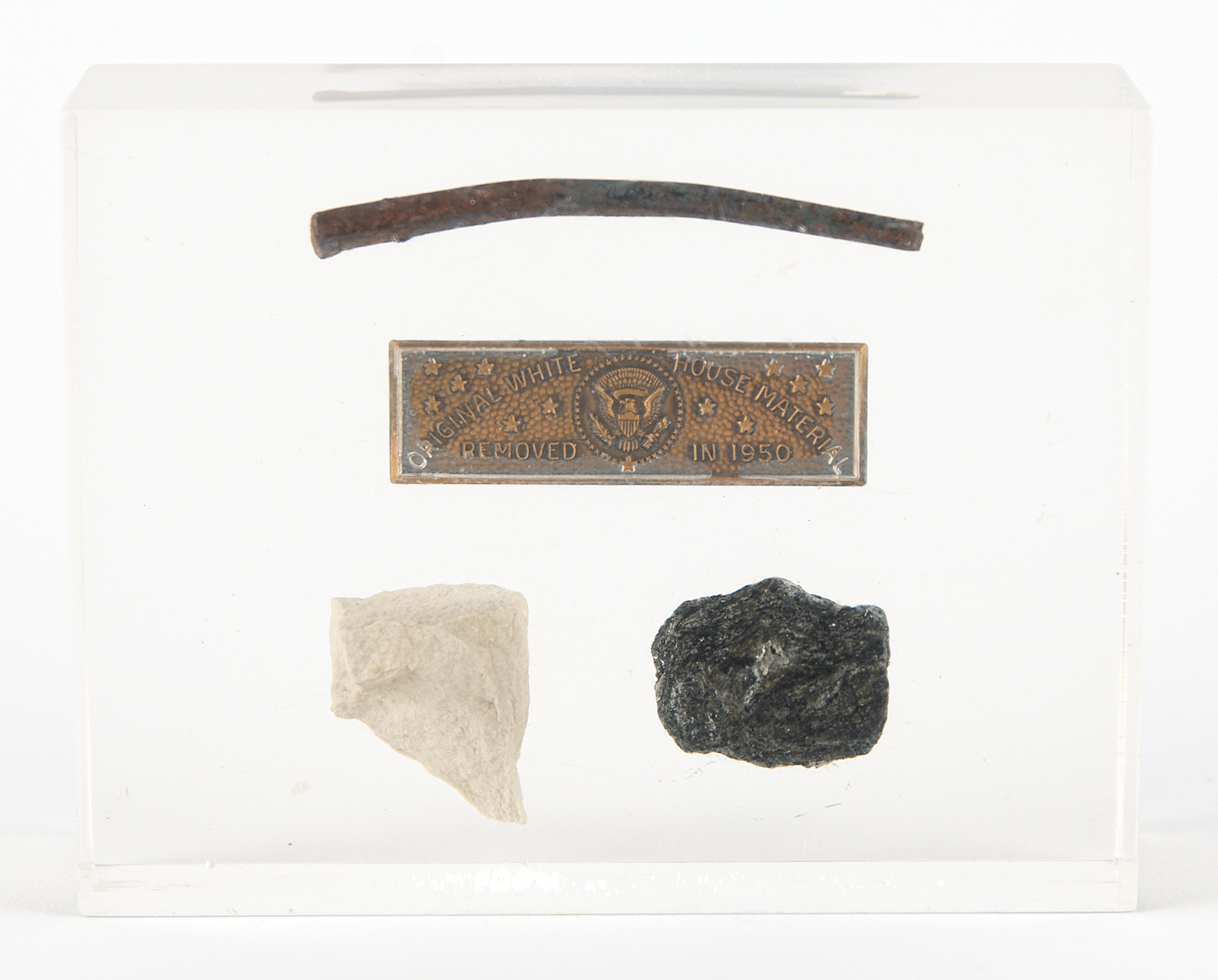 Desirable trio of relics removed from the White House during its expansive renovations undertaken by Harry S. Truman in 1950—a hand-forged nail and white and black stones (apparently limestone and granite)—with presentation plaque, "Original White House Material Removed in 1950," encased in a lucite/acrylic block measuring 4˝ x 3.25˝ x 1.25˝. In fine condition, with light scuffing to block.