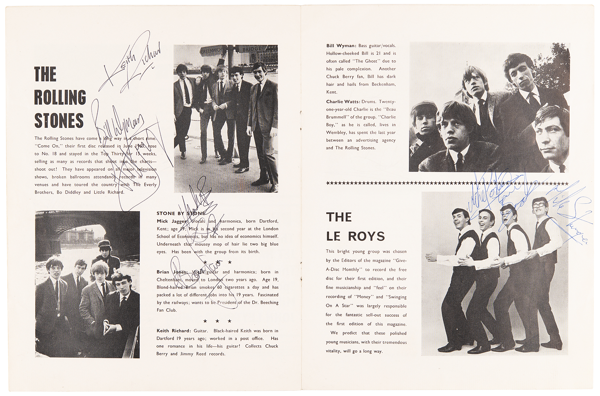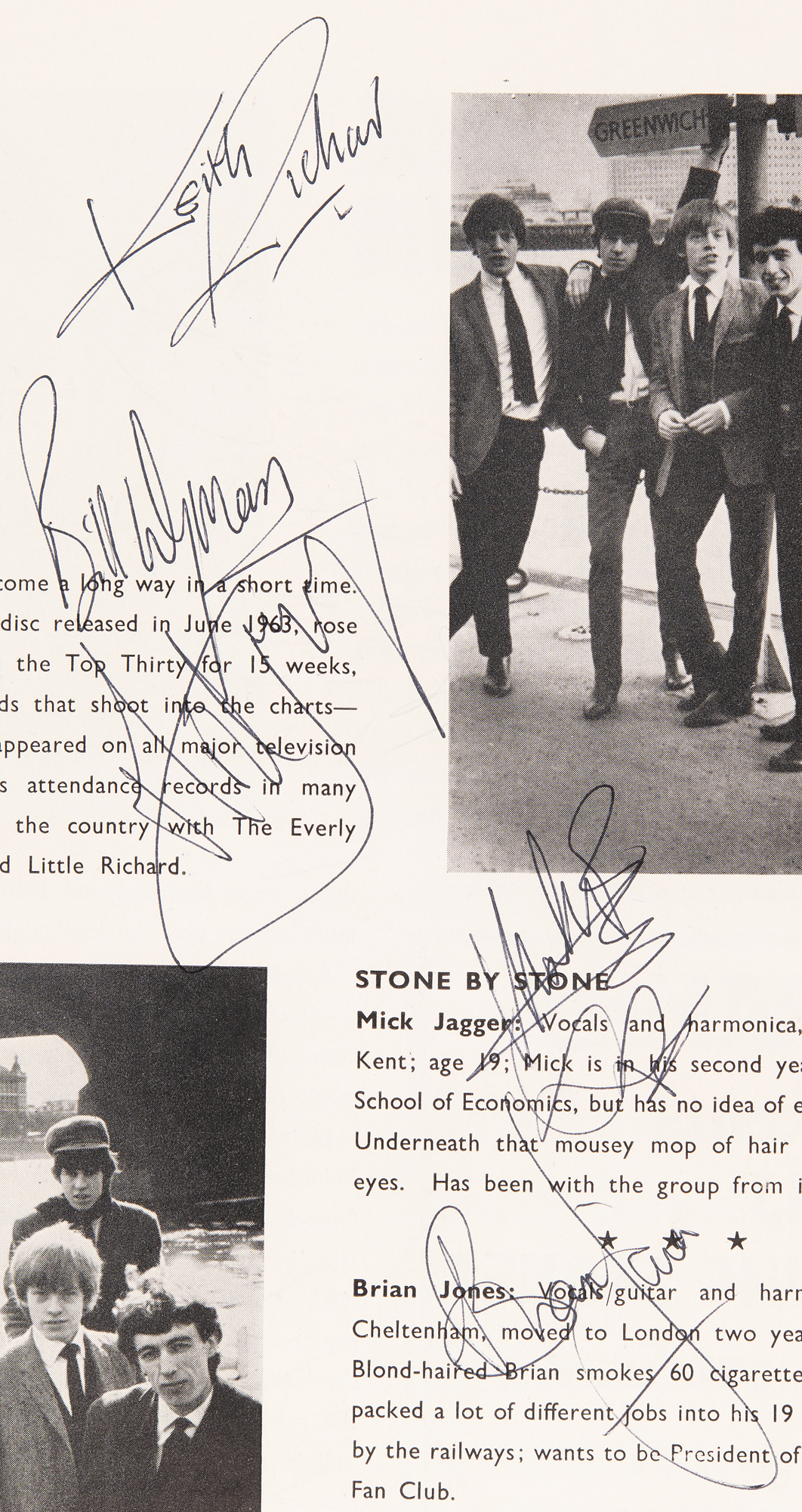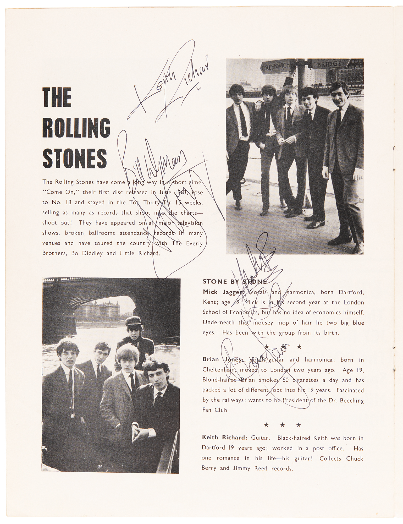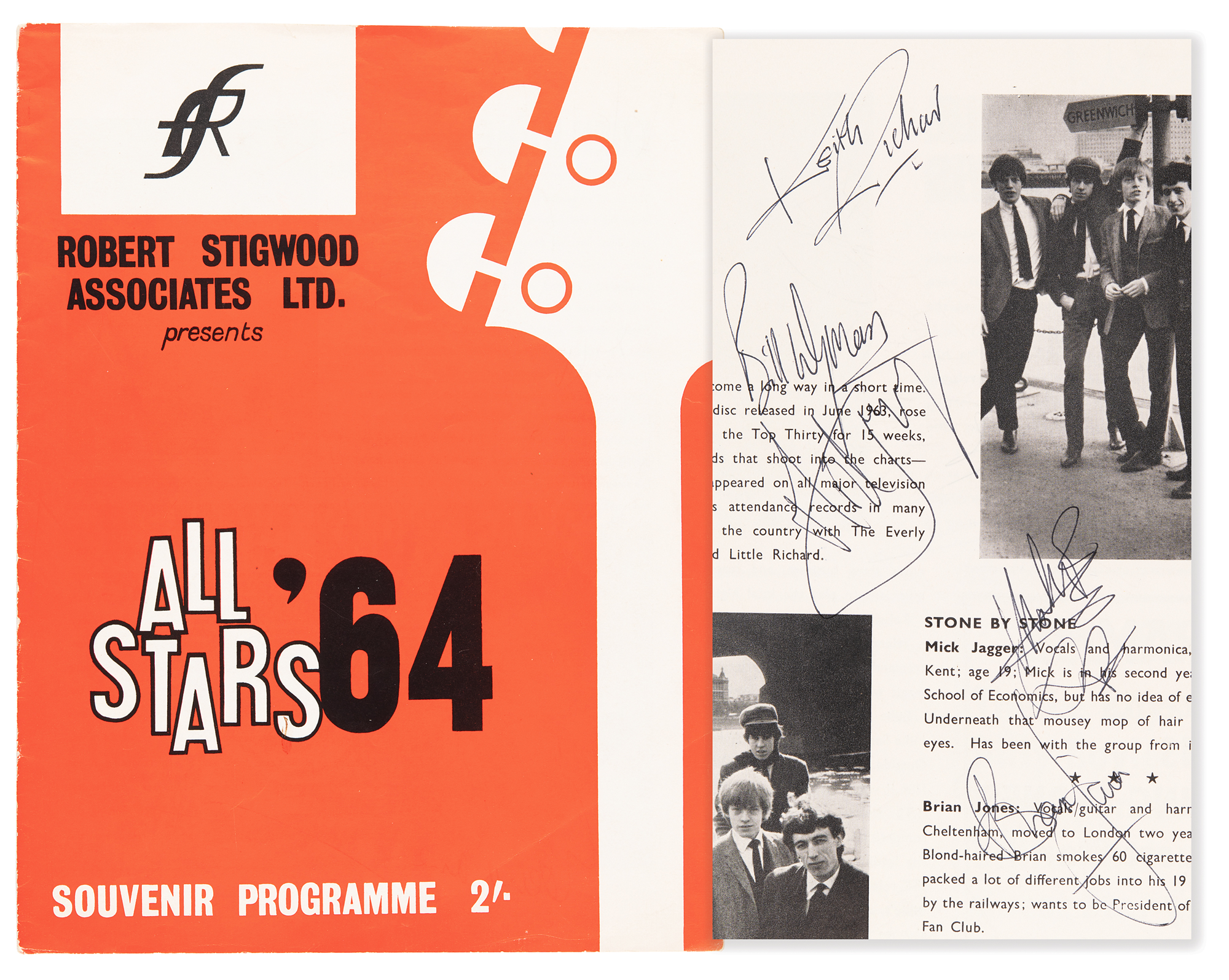 Original souvenir program for the "All Stars '64" UK tour presented by Robert Stigwood Associates, 8.5 x 11, 14 pages, signed inside on their musician page in black ballpoint by the Rolling Stones: Brian Jones, Mick Jagger, Keith Richards, Bill Wyman, and Charlie Watts. The program is also by other acts on the bill, including Eden Kane, Mike Sarne, Mike Berry, Billie Davis, The Lee Roys, Bern Elliot and the Fenmen, Don Spencer, and Billy Boyle. In fine condition, with light handling wear. Accompanied by a certificate of authenticity from Tracks. The majority of these shows were performed in cinemas (Odeon, Gaumont, Regal, Granada, etc.) and were packaged affairs, with the Stones of course as the headliners. While their profile was quite high in the U.K. by now, this tour predated their first visit to the U.S. in early June of 1964. Also of interest is the promotion by Robert Stigwood, who would go on to great fame in the 1970s as the founder of RSO Records and manager of Cream and the Bee Gees.
