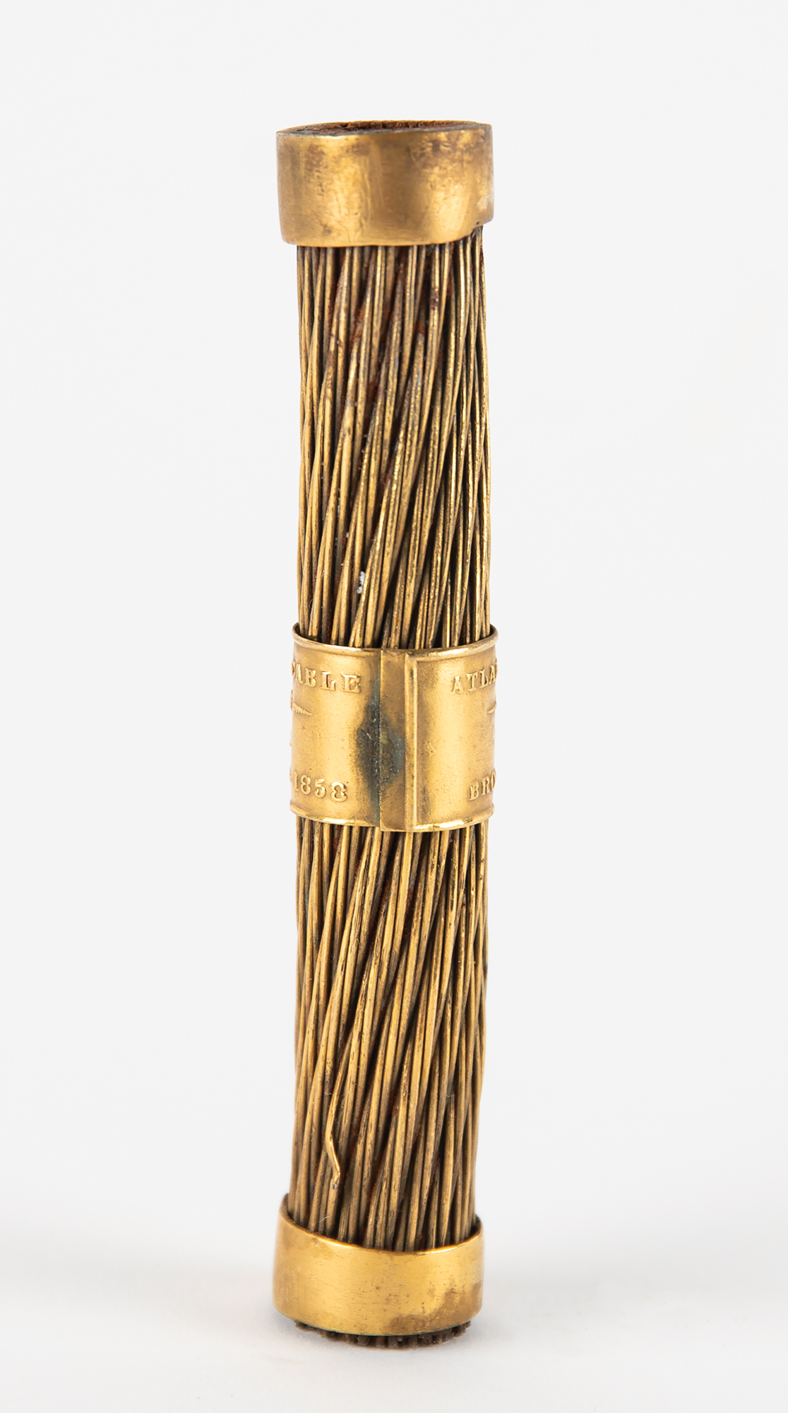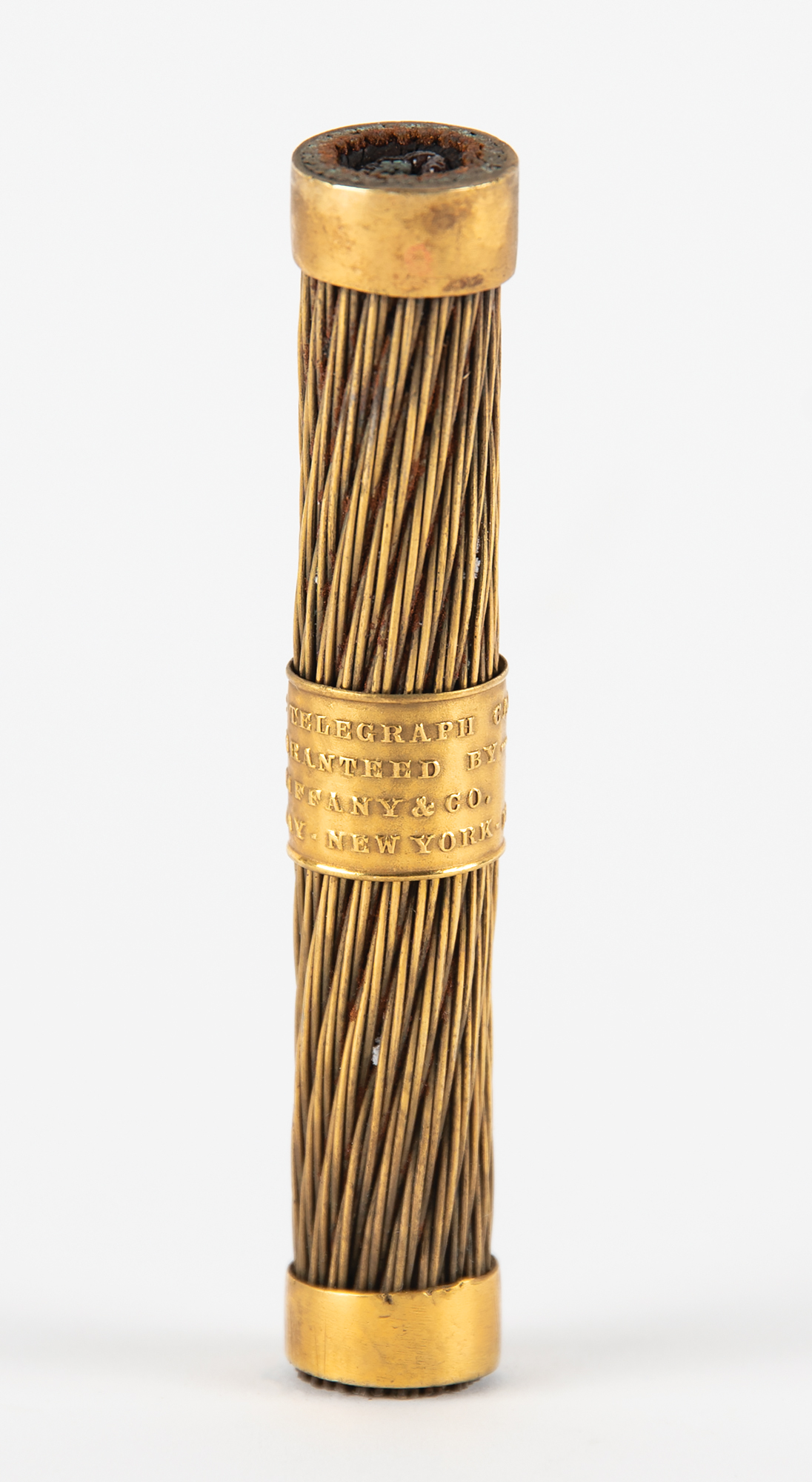 Segment of the first transatlantic telegraph cable from 1858, measuring 4˝ long, made into a souvenir and sold by Tiffany & Co. The cable is wrapped with a brass band, reading: "Atlantic Telegraph Cable, Guaranteed by Tiffany & Co., Broadway, New York, 1858." In fine condition.