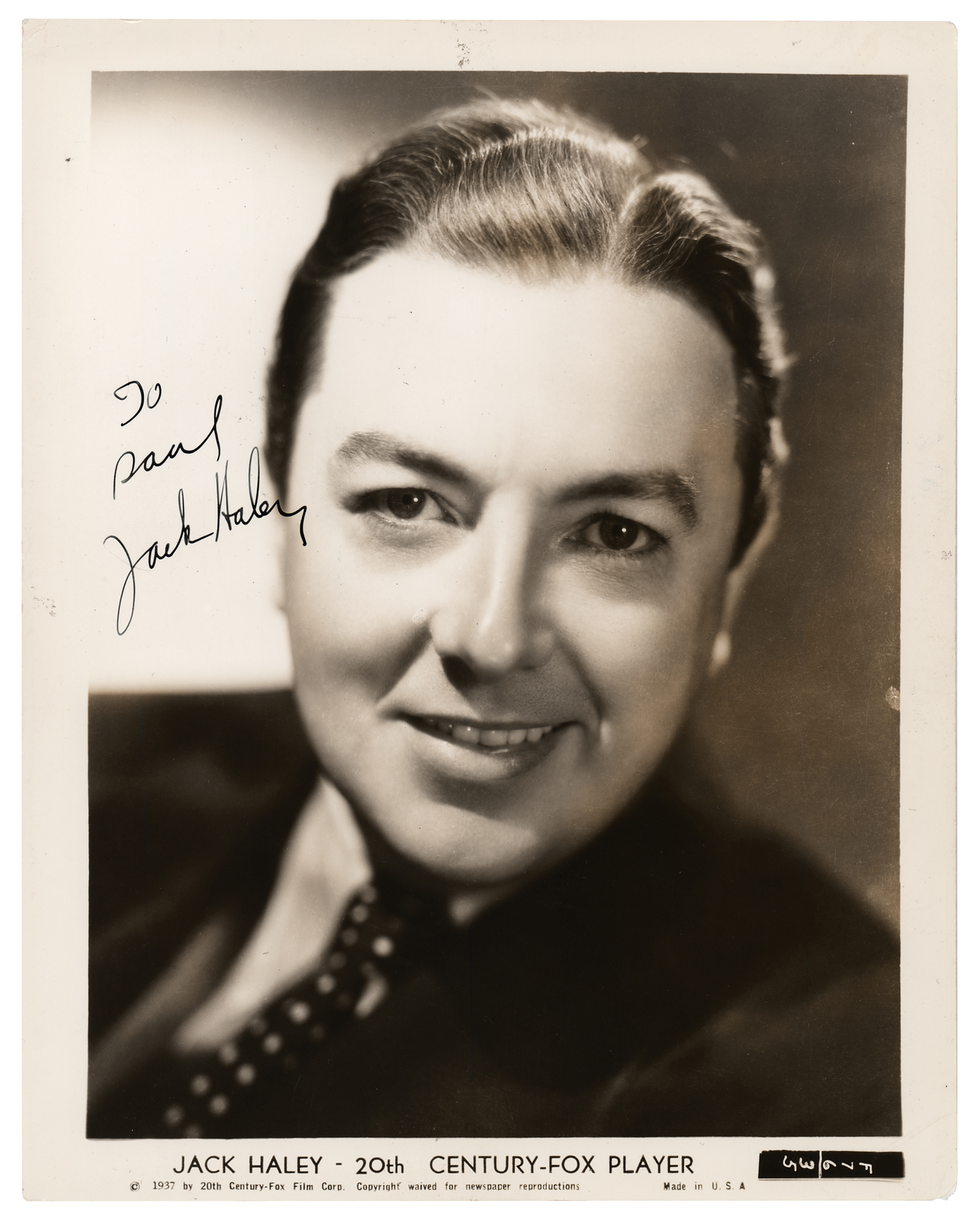 Vintage glossy 8 x 10.25 20th Century-Fox Films publicity photo of Haley in a friendly close-up pose, signed and inscribed in fountain pen, "To Saul, Jack Haley.” The reverse is date stamped August 17, 1939. In very good to fine condition, with a small surface ding in Haley's left eyebrow.