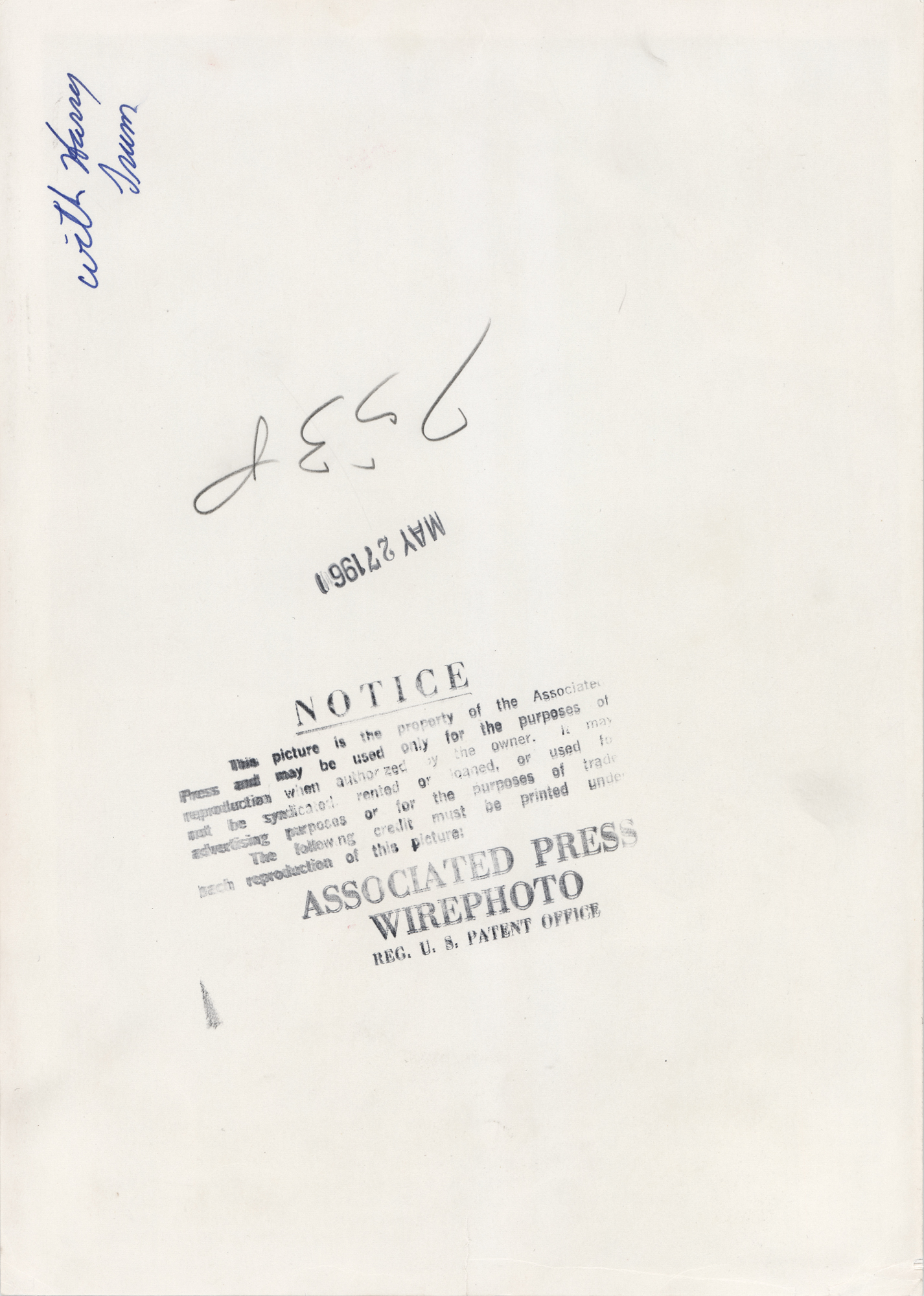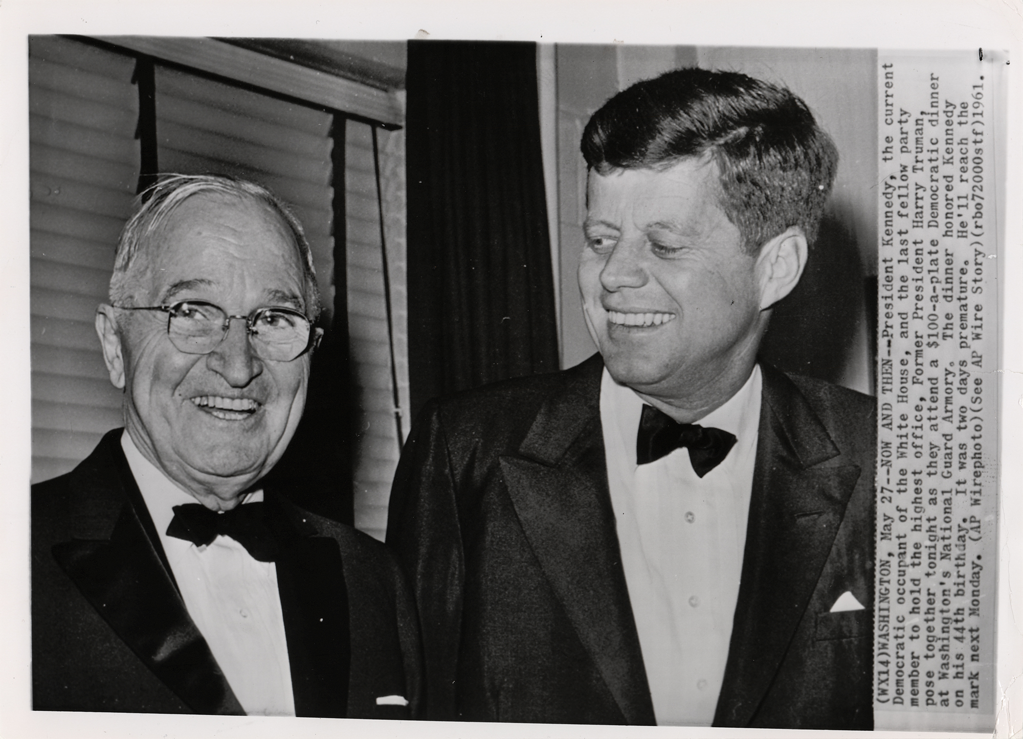 Original vintage glossy 11.25 x 8.25 AP wirephoto of President John F. Kennedy and Harry S. Truman together at a $100-a-plate Democratic fundraising dinner held at Washington's National Guard Armory to honor JFK's 44th birthday. Reverse bears an Associated Press credit stamp, dated May 27, 1961. In very good to fine condition, with creasing and a couple tiny tears to the right edge.
