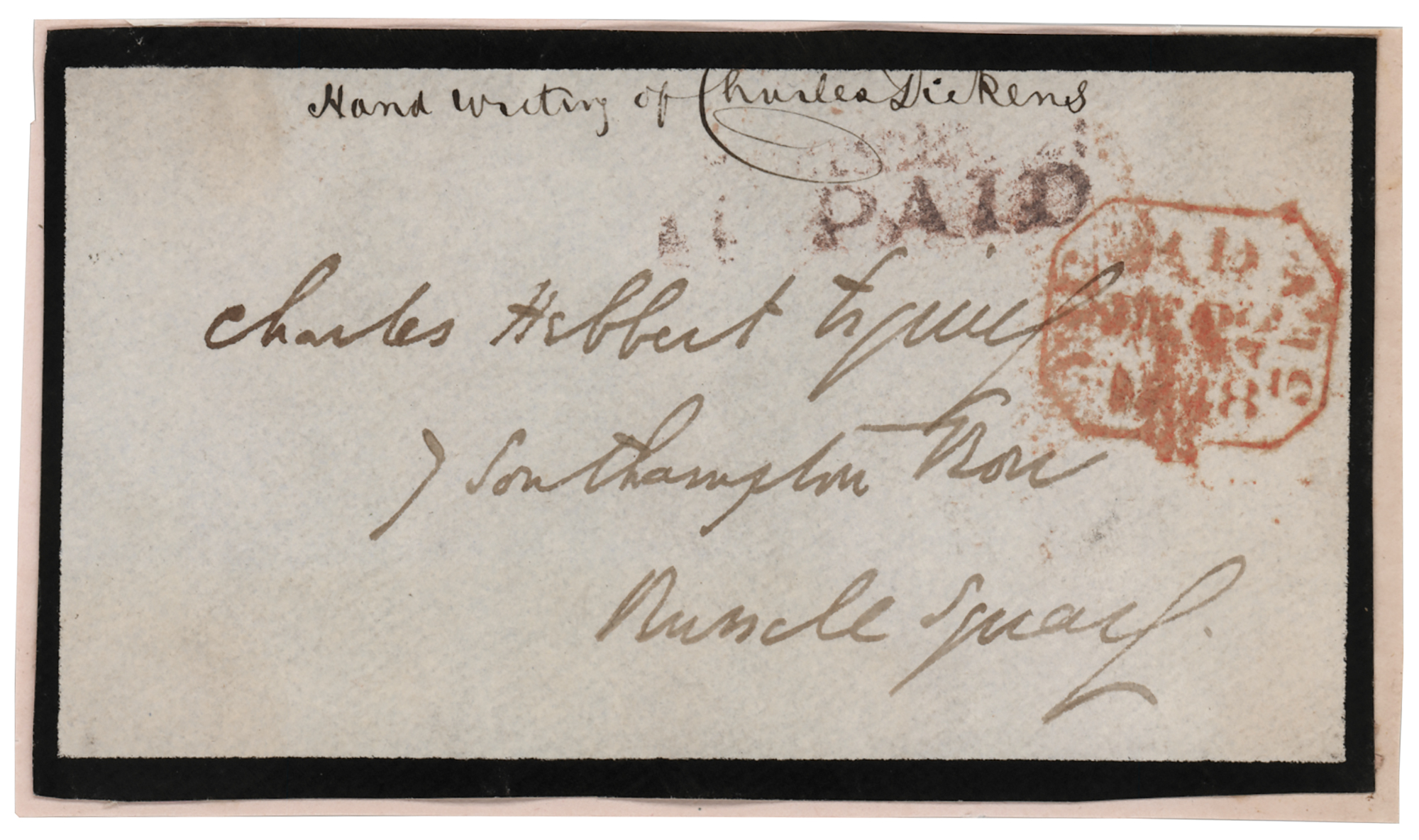 Unsigned hand-addressed mailing panel accomplished in the hand of Charles Dickens, 4.5 x 2.5, addressed by Dickens to "Charles Hebbert Esquire, 7 Southampton Row, Russell Square." Stamped "Paid" and annotated across the top edge in another hand, "Handwriting of Charles Dickens." Affixed to a slightly larger sheet and in fine condition. A desirable Charles Dickens autograph which, though not signed, incorporates his first name as part of the address.