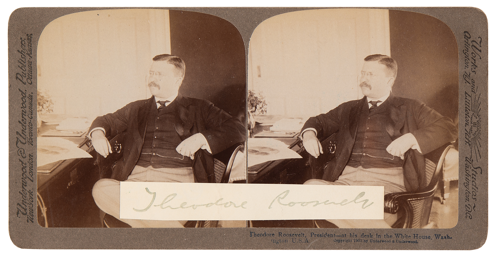 Desirable ink signature, "Theodore Roosevelt,” on an off-white 3.75 x .5 slip, nicely affixed to an original 7 x 3.5 Underwood & Underwood stereoview photograph of President Roosevelt seated at his desk inside the White House. In fine condition, with a crease to the center of the slip and slight edge warping to the stereoview.