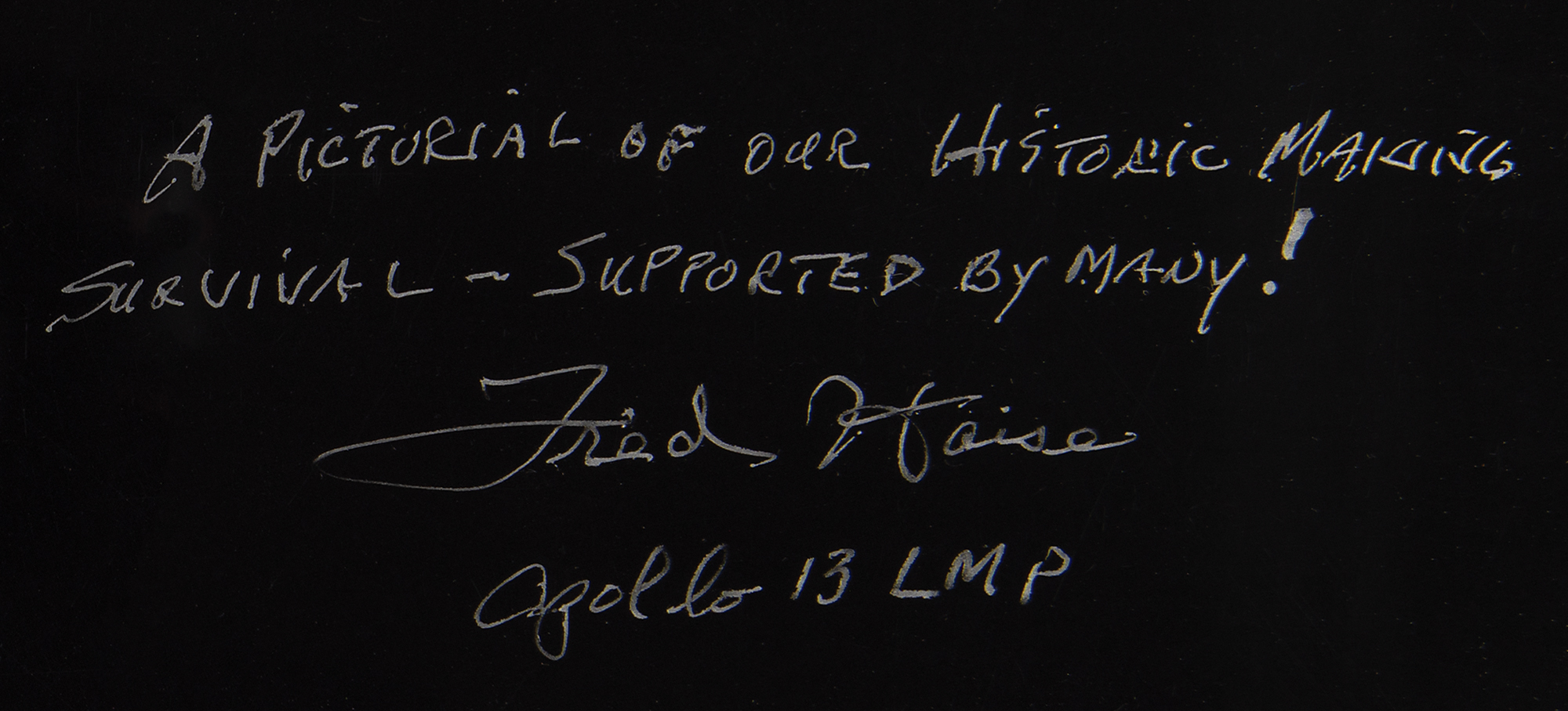 Color semi-glossy 20.25 x 9.25 panoramic photo print of the “Apollo 13 – Orbital Mission Map,” which shows the revised trajectory of the Apollo 13 mission, signed in silver ink, “A pictorial of our historic making survival – supported by many! Fred Haise, Apollo 13 LMP,” who adds captions and quotes to various important moments from the mission: “TLI burn to achieve escape velocity,” “‘Houston, we’ve had a problem,’” “LM pwr up & burn to ‘free return,’” “Speed up burn to save 10 hours & put splashdown in the Pacific Ocean,” “3rd midcourse,” “4th midcourse,” “Jettison SM,” “PWR up CM,” and “Jettison Aquarius.” Rolled and in fine condition.