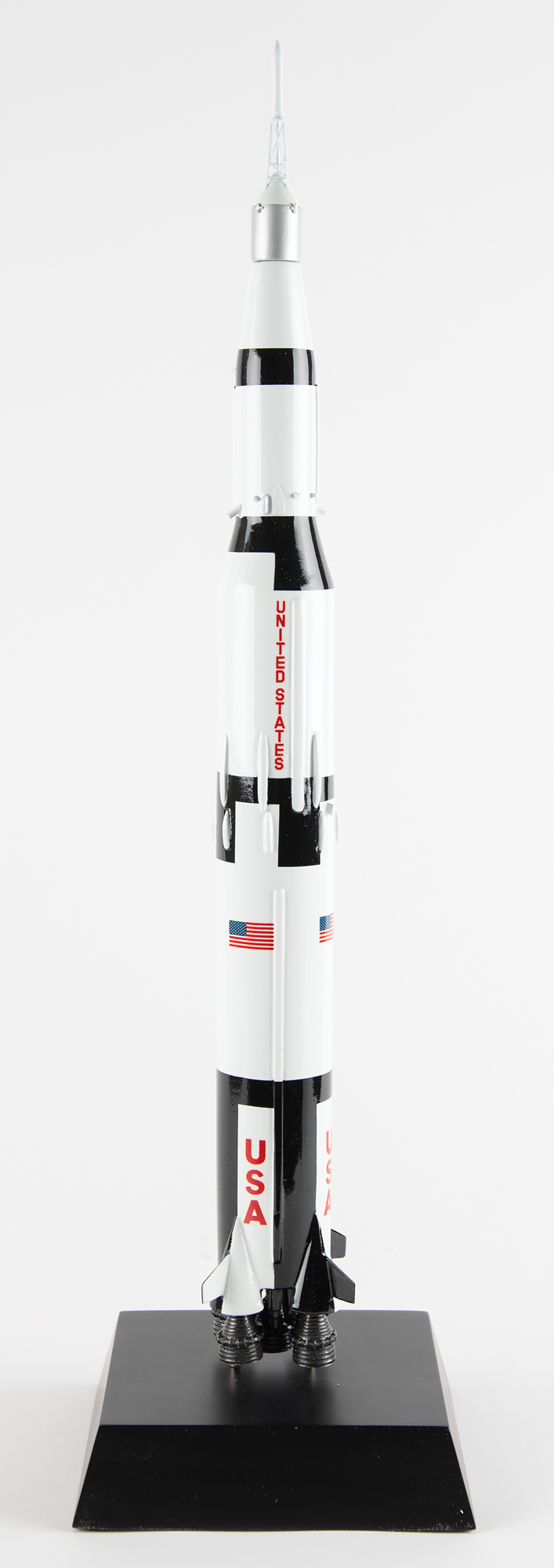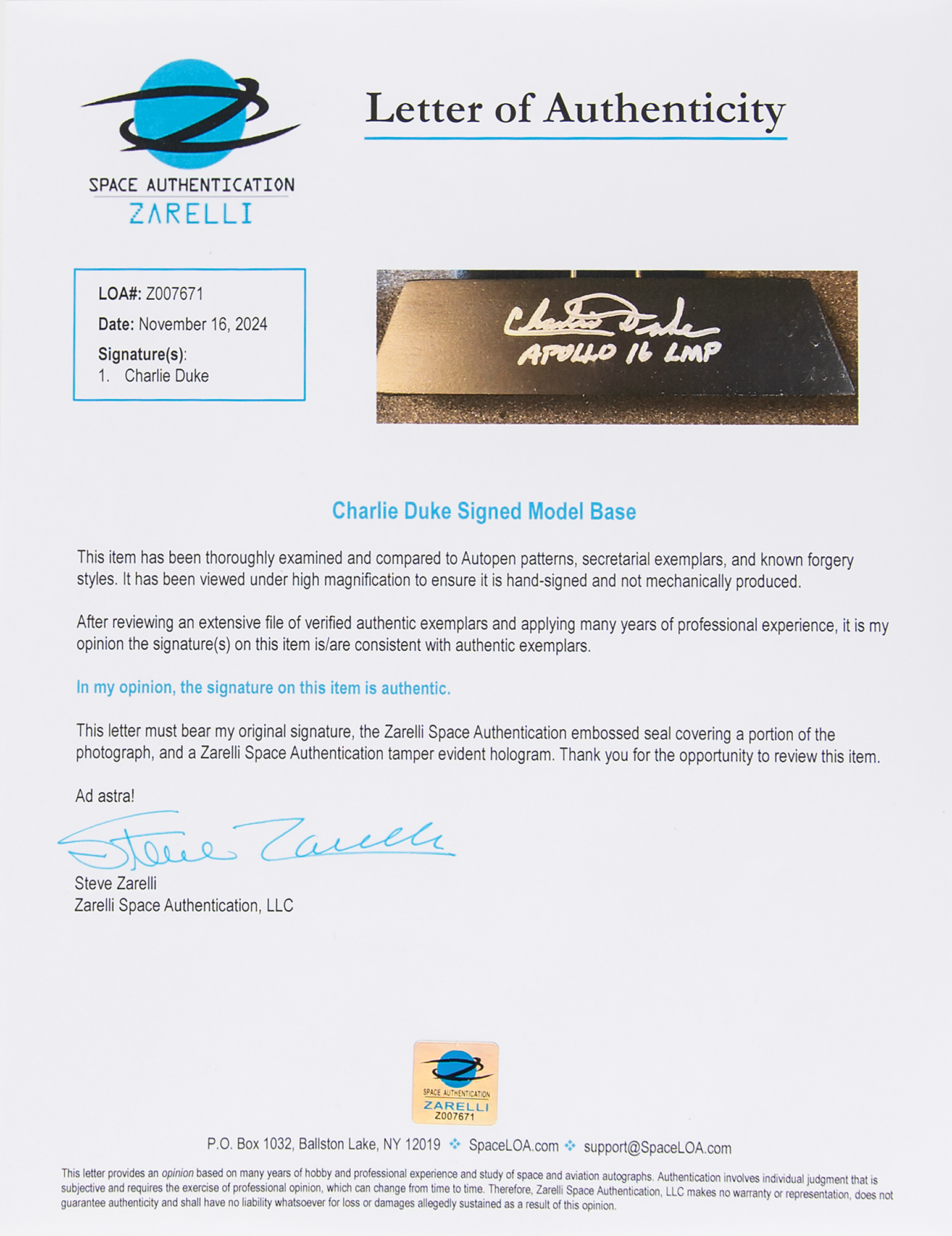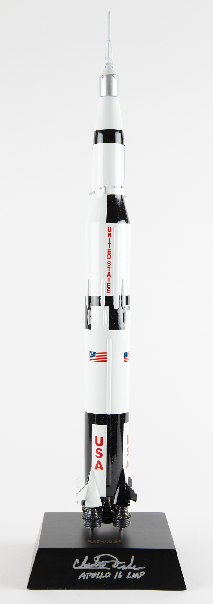 Executive Series 1:200 scale replica model of a Saturn V super heavy-lift launch vehicle by Daron Worldwide Trading, standing at a height of 24˝ and set on a black display base, 6.5˝ x 6.5˝ x 1.5˝, signed on the front in silver ink, "Charlie Duke, Apollo 16 LMP." In fine condition. Accompanied by a full letter of authenticity from Zarelli Space Authentication and the original shipping box.