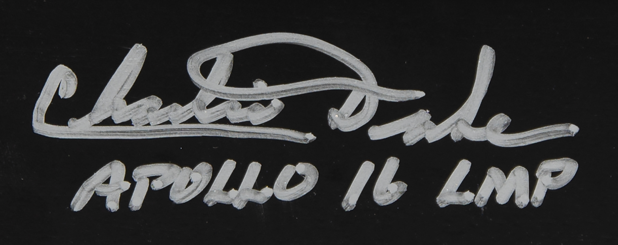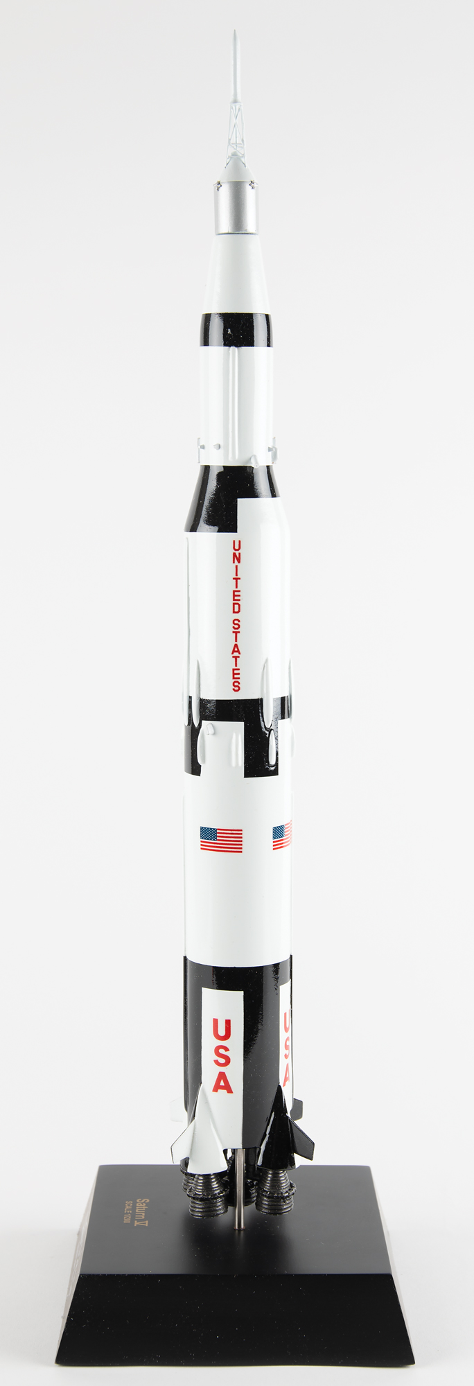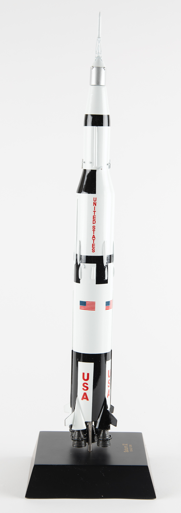 Executive Series 1:200 scale replica model of a Saturn V super heavy-lift launch vehicle by Daron Worldwide Trading, standing at a height of 24˝ and set on a black display base, 6.5˝ x 6.5˝ x 1.5˝, signed on the front in silver ink, "Charlie Duke, Apollo 16 LMP." In fine condition. Accompanied by a full letter of authenticity from Zarelli Space Authentication and the original shipping box.