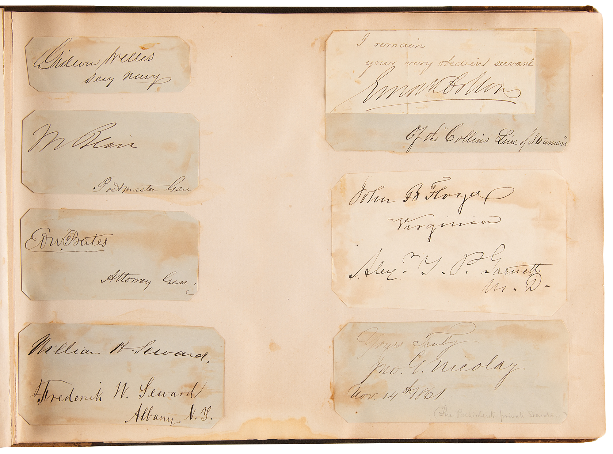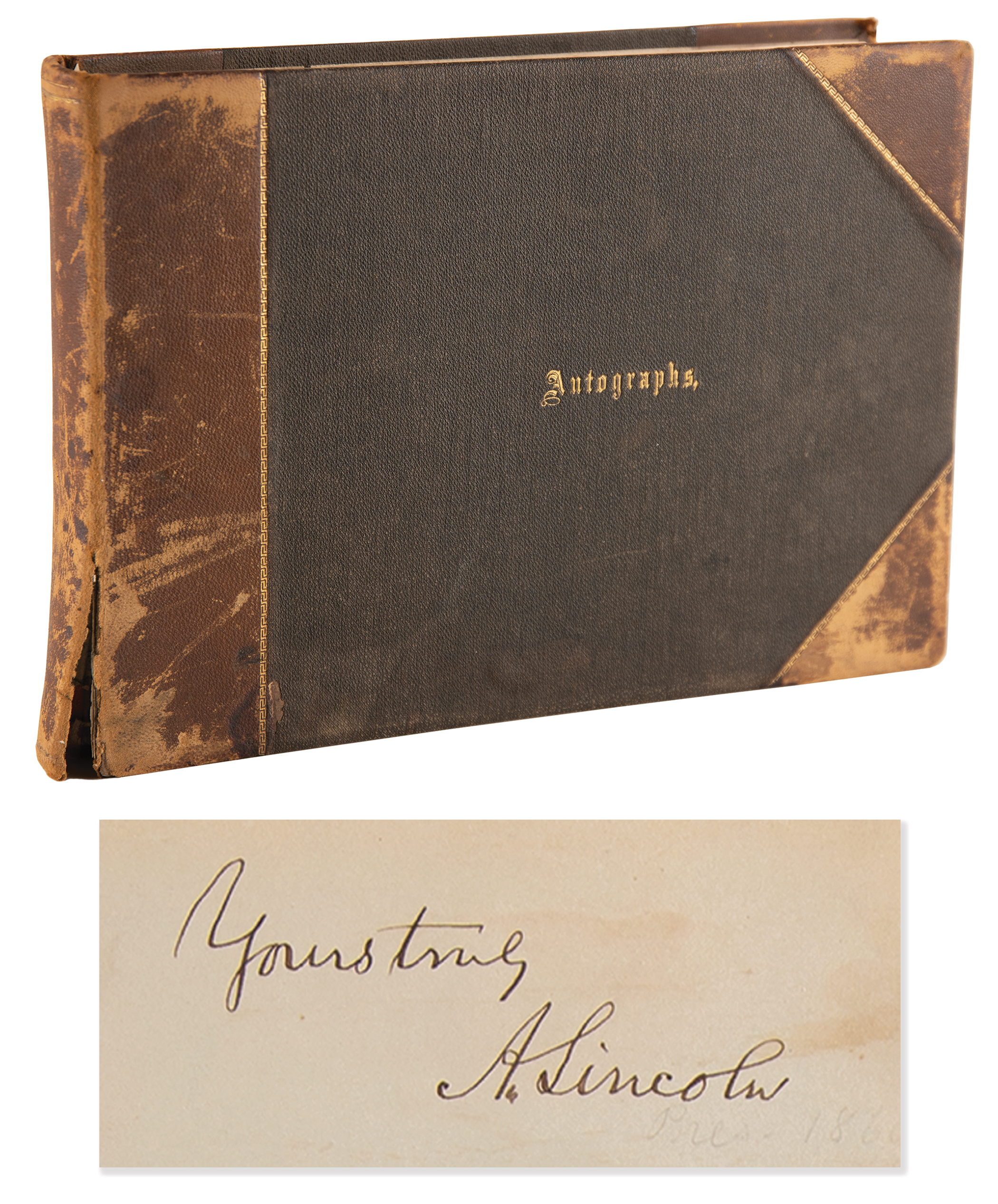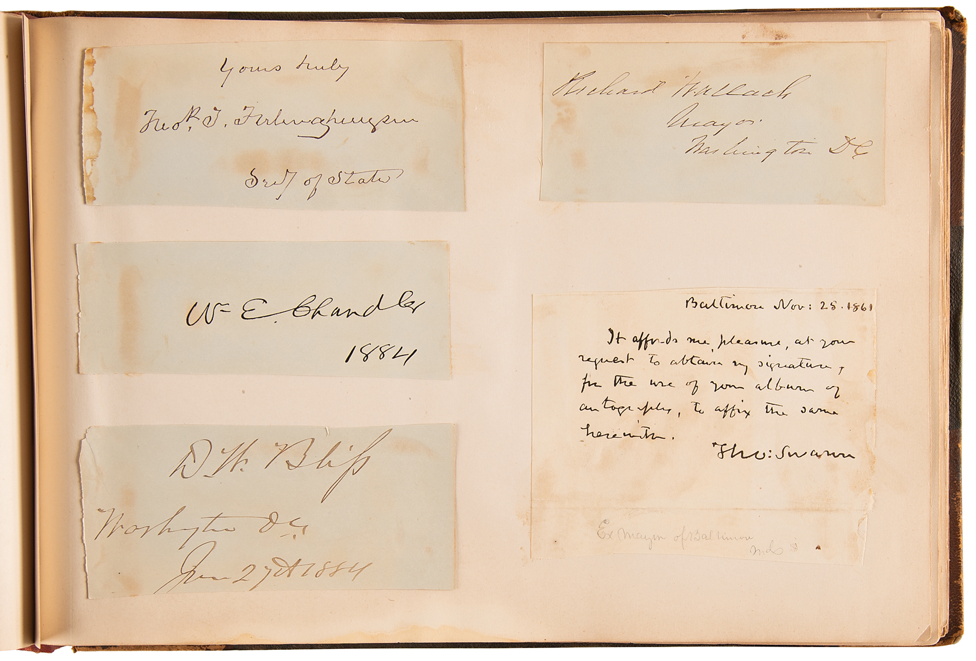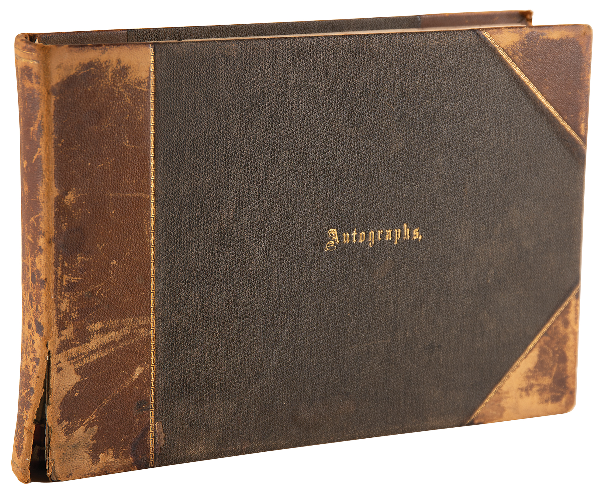 Impressive mid-to-late 19th century hardcover autograph book, 12 x 8.5, containing more than 225 affixed signatures of notable presidents, politicians, military figures, entertainers, and other celebrities of the era. The first page boasts a remarkable selection of six presidential autographs: Abraham Lincoln, U. S. Grant, Rutherford B. Hayes, James A. Garfield, Chester A. Arthur, and Grover Cleveland. Subsequently affixed within the book are a number of Lincoln-associated autographs, including his son, Robert Todd Lincoln; cabinet members, including Vice President Hannibal Hamlin, Secretary of War Simon Cameron, Secretary of the Treasury Salmon P. Chase, Secretary of the Navy Gideon Welles, Postmaster General Montgomery Blair, Attorney General Edward Bates, Secretary of State William Seward (and his son, Assistant Secretary Frederick W. Seward), Private Secretary John G. Nicolay, and several of his military commanders, including William T. Sherman, Winfield Scott, John Dix, Winfield S. Hancock, George McClellan, Nathaniel P. Banks, John C. Fremont, and Charles Wilkes.
