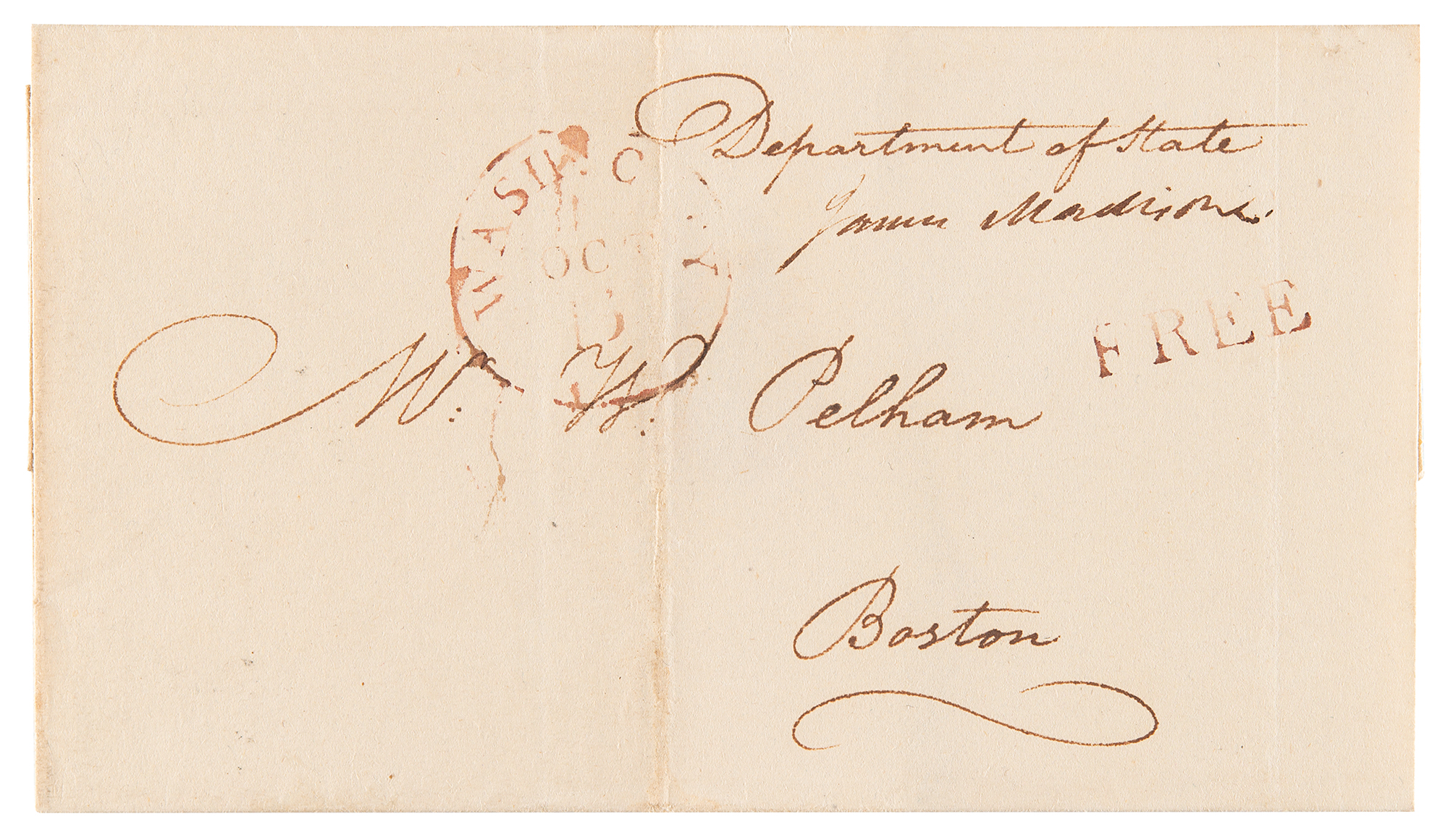 Free franked mailing cover, folded to 5.5 x 3, addressed in a secretarial hand to "W. W. Pelham, Boston," and franked in the upper right as secretary of state, “James Madison." Postmarked "Free" at Washington on October 13th, with an ink notation inside: "Oct. 13, 1804, Secretary of State, (Certificate)." Reverse panel bears remnants of the original red wax seal. In fine condition, with a central vertical fold.