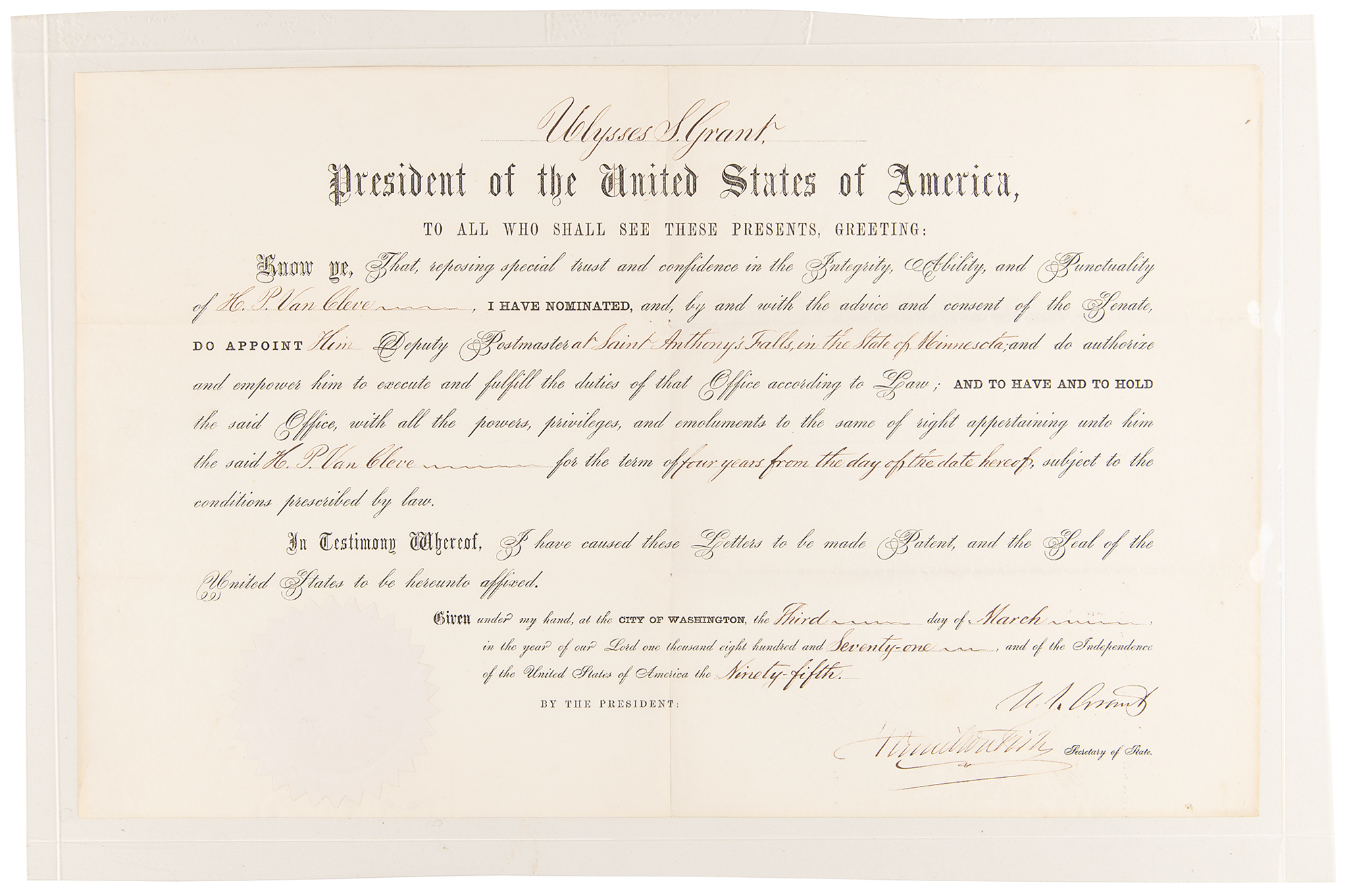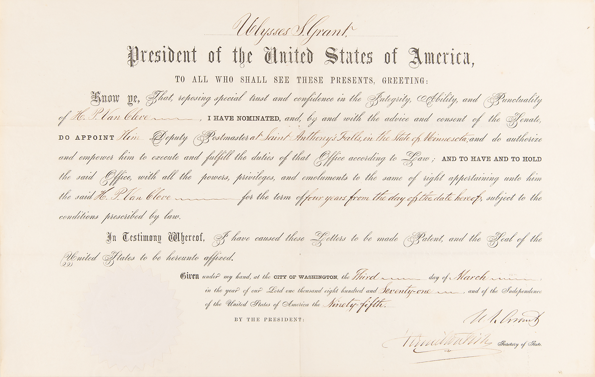 Partly-printed DS as president, one page, 17.75 x 11.25, March 3, 1871. President Grant appoints H. P. Van Cleve to be "Deputy Postmaster at Saint Anthony's Falls in the State of Minnesota." Signed at the conclusion by President Ulysses S. Grant and countersigned by Secretary of State Hamilton Fish. The white paper seal affixed at the lower left remains fully intact. In fine condition.