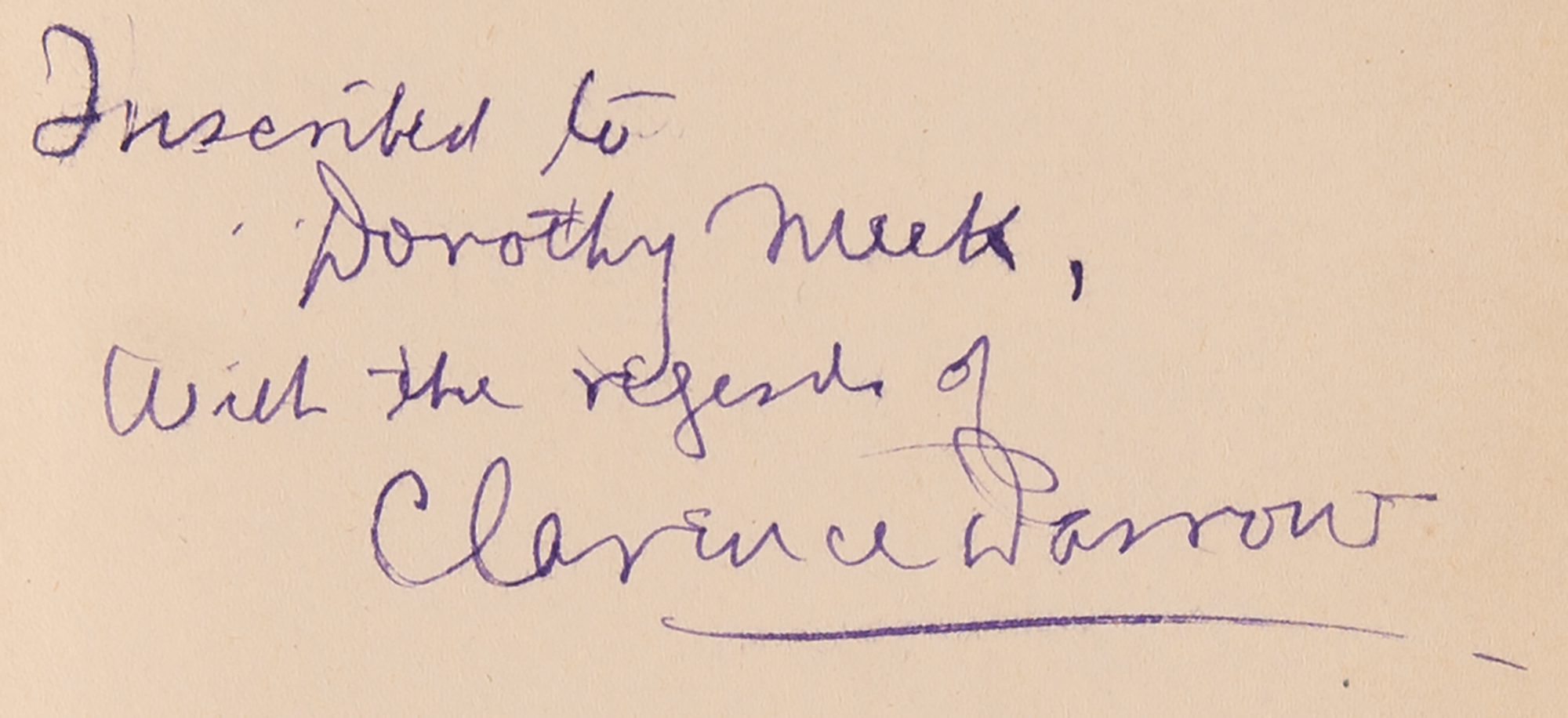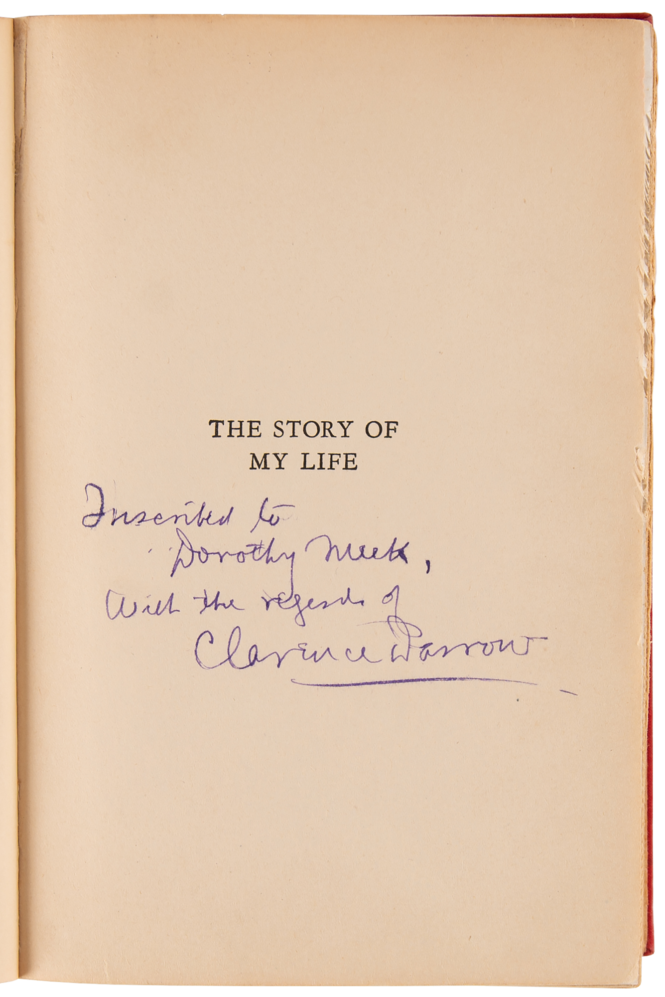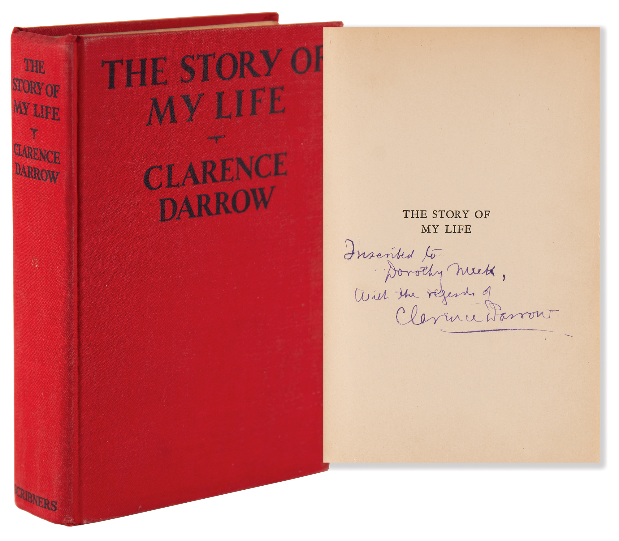 Famed defense attorney (1857–1938) noted for his role in the Scopes 'Monkey' Trial and the Leopold-Loeb thrill-killing case. Signed book: The Story of My Life. Later printing. NY: Charles Scribner's Sons, 1934. Hardcover, 5.75 x 8, 495 pages. Signed and inscribed on the first free end page in fountain pen, "Inscribed to Dorothy Meek, With the regards of Clarence Darrow." In fine condition.