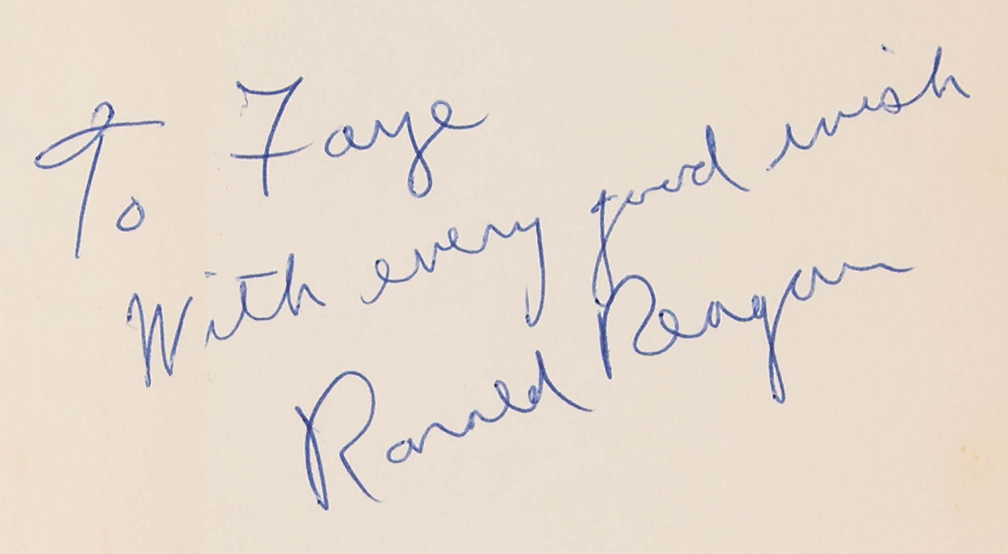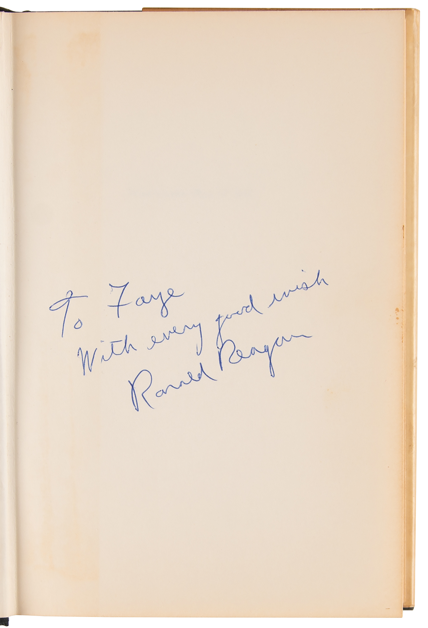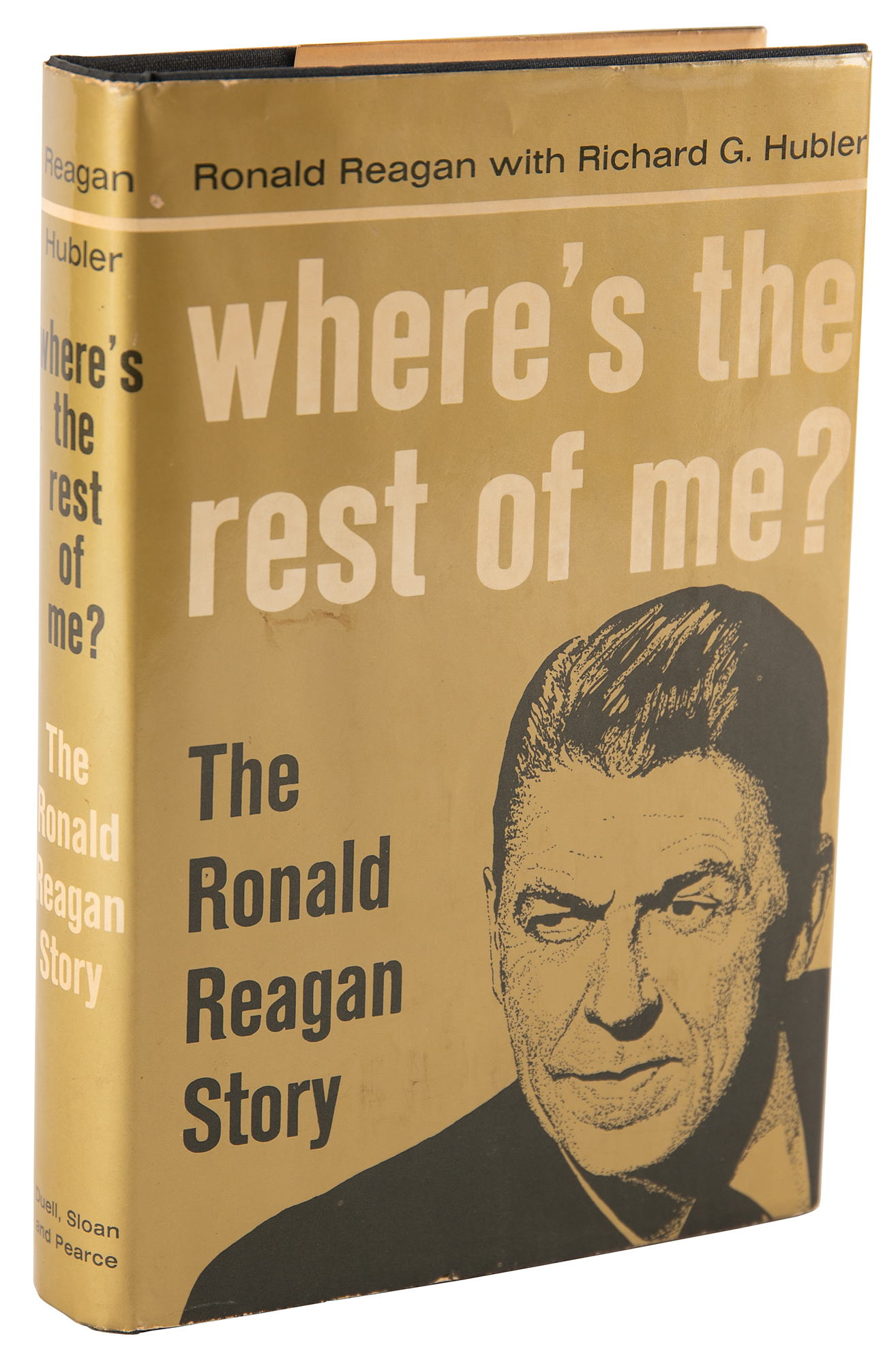 Signed book: Where's the Rest of Me? Later printing. NY: Duell, Sloan and Pearce, 1965. Hardcover with dust jacket, 5.75 x 8.25, 316 pages. Signed and inscribed on the first free end page in blue ballpoint, "To Faye, With every good wish, Ronald Reagan." In fine condition, with light edge toning to the signed page.