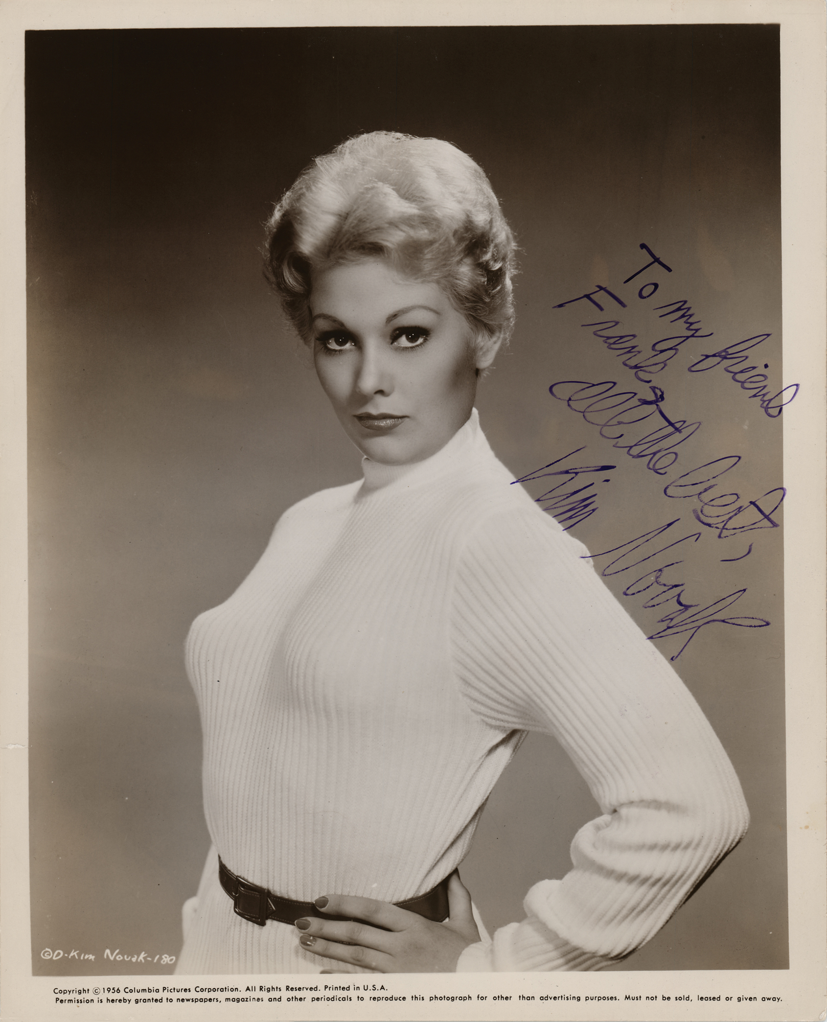 Vintage glossy 8 x 10 Columbia Pictures publicity photo of Novak in a white long-sleeved knit dress, signed and inscribed in fountain pen, "To my friend Frank, all the best, Kim Novak.” In fine condition.
